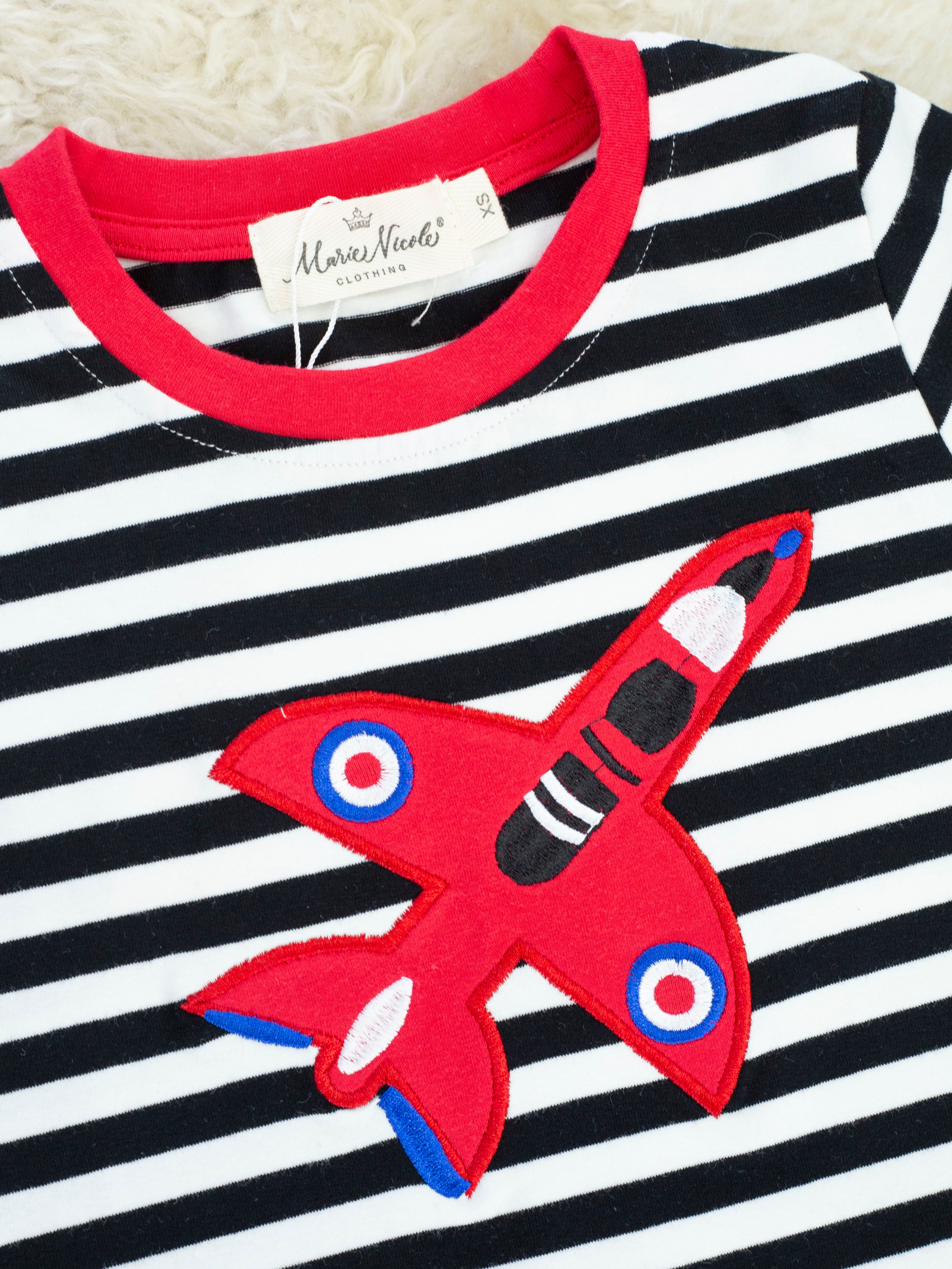 Our Striped Red Jet Brother Set will have your kiddo flying high in style! Featuring stripes and an airplane appliqué, this stylish shirt will get them off the ground with its vibrant red trim. Making a statement never looked so fly!