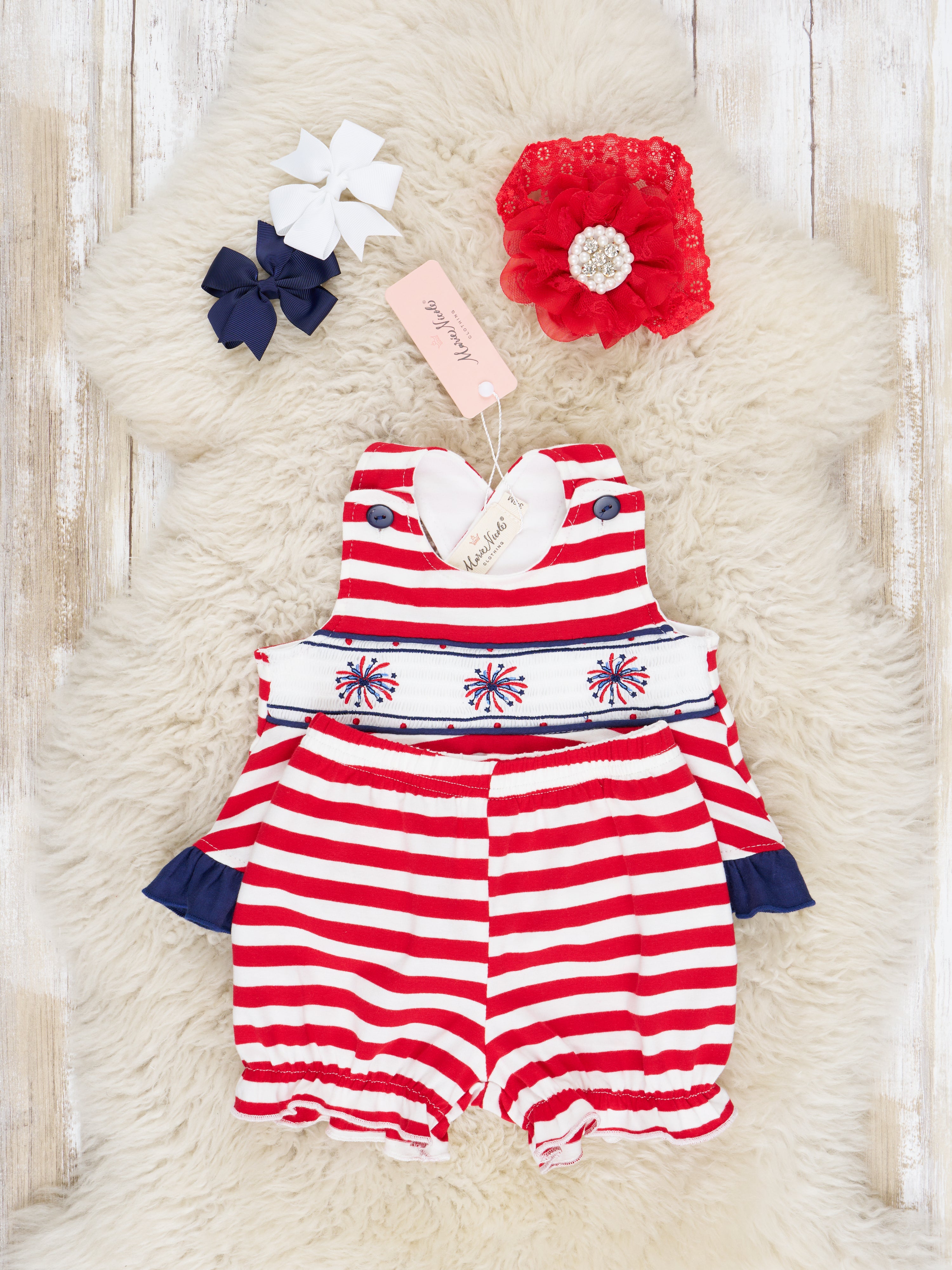 This sibling set is a paradise for firecracker-loving families! With red stripes, smocking, and embroidered fireworks, they’re bound to have your kids blazing with style! Watching them light up in this outfit will make you go “boom” with pride!