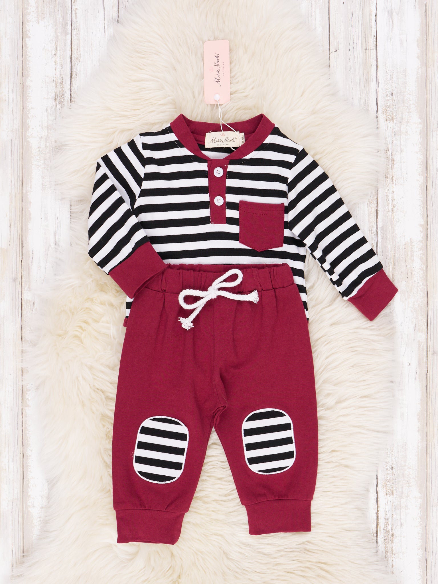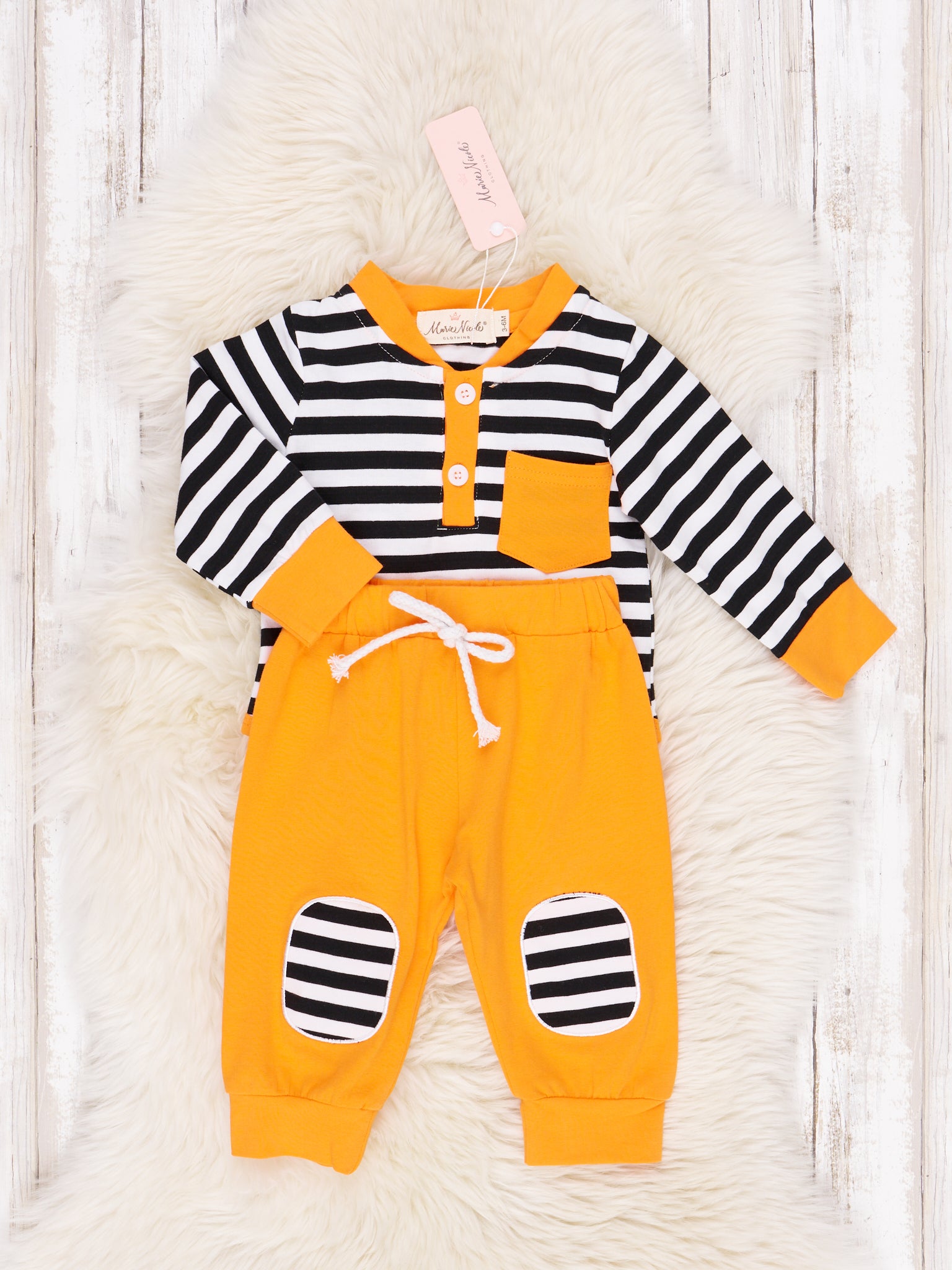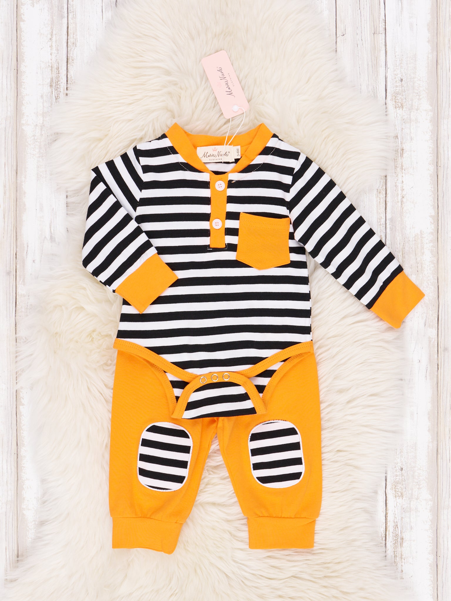 The Stripes and Solids Pocket Henley Romper is perfect for baby to cheer on his big's team! Featuring long sleeves, classic team color options, and black and white striped details, this romper outfit will take you from late summer ball games into the cooler fall football season! Available in Burgundy and Orange.