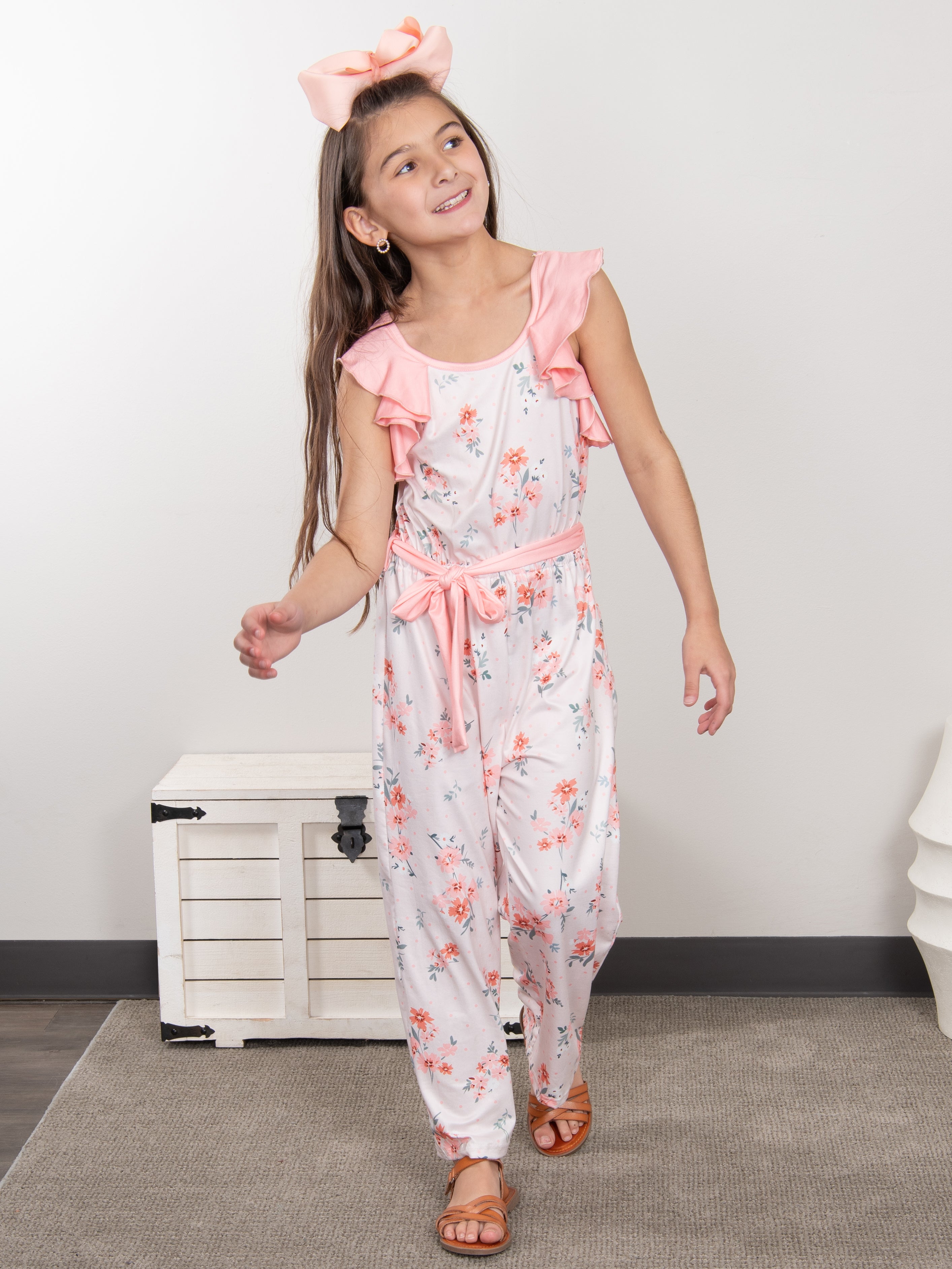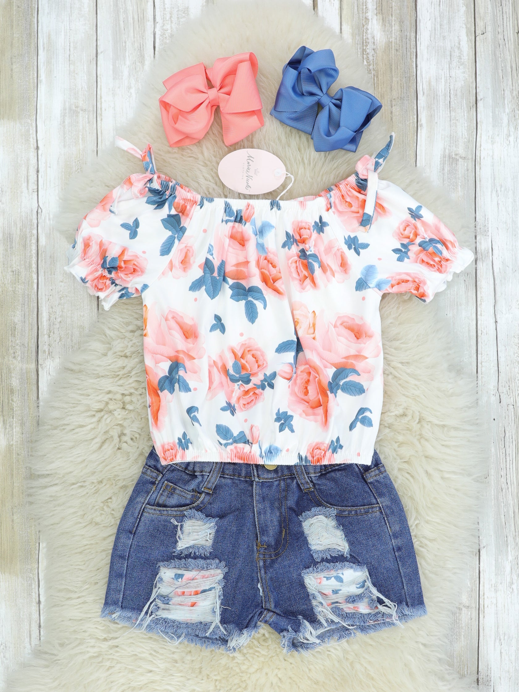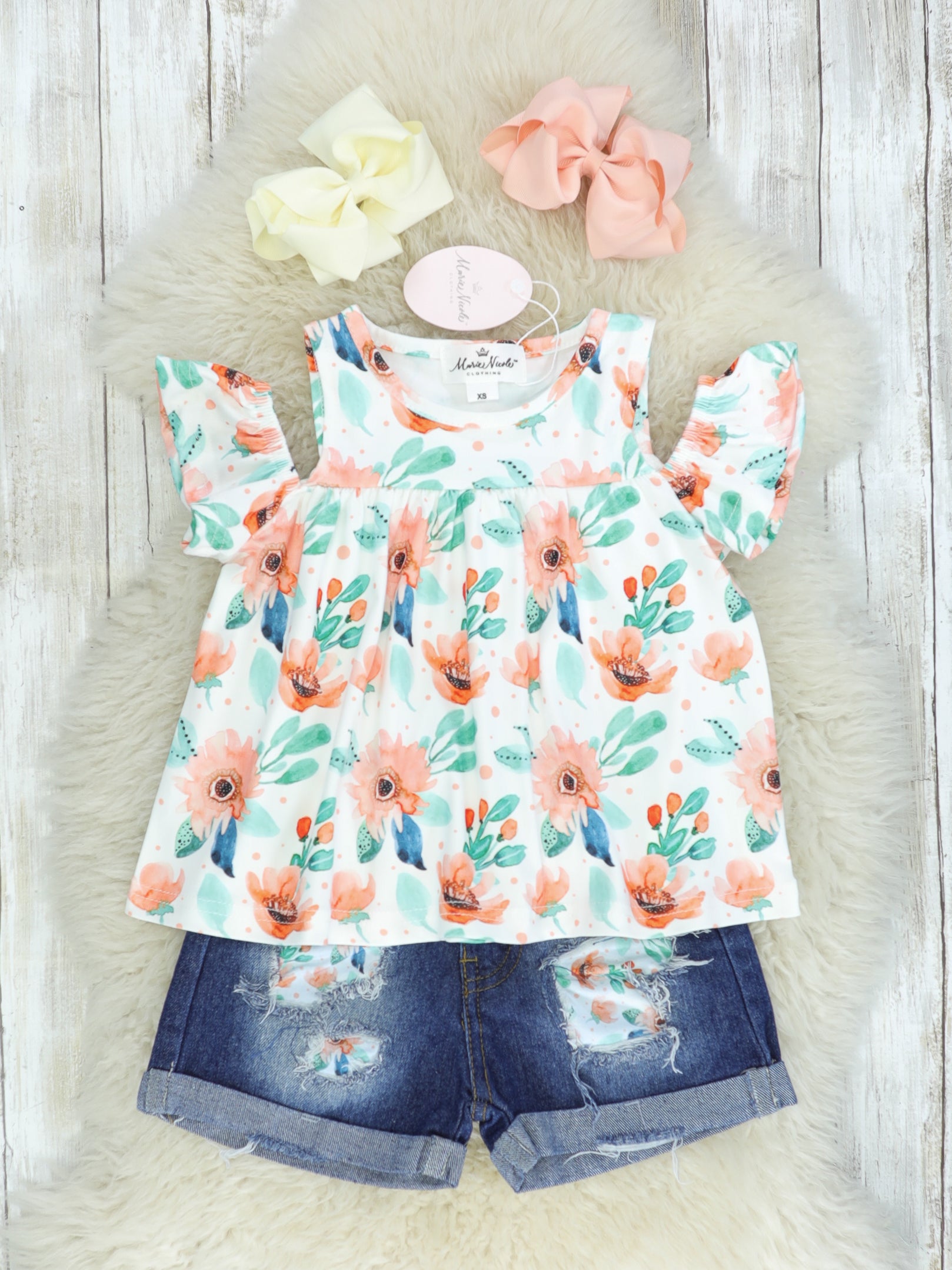 Peachy Floral Tie Shirt & Distressed Denim Outfit
