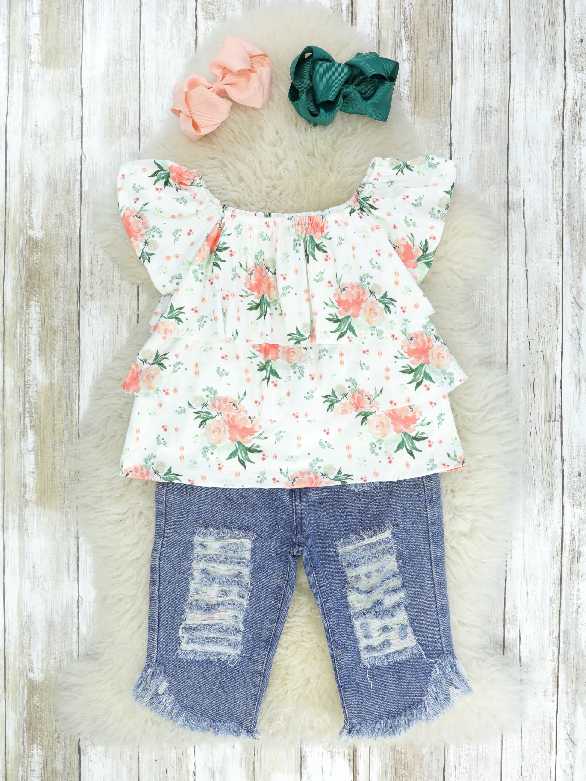 Peachy Tiered Ruffle Top & Distressed Denim Outfit