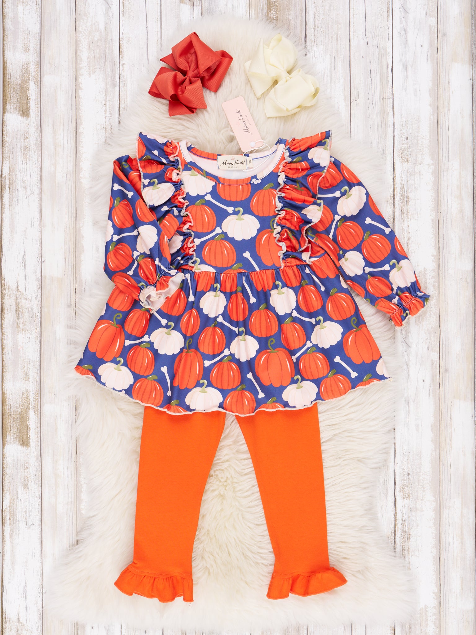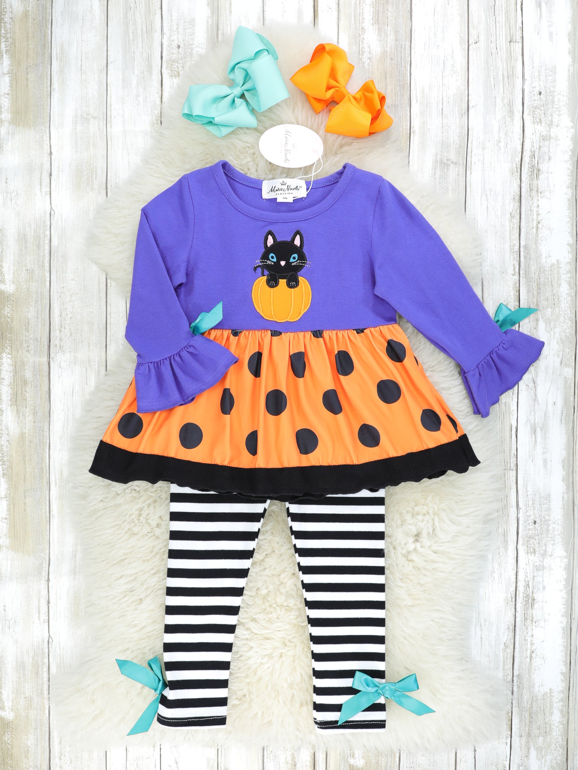 Purple Cat Pumpkin Polka Dot Top & Striped Bottoms Outfit