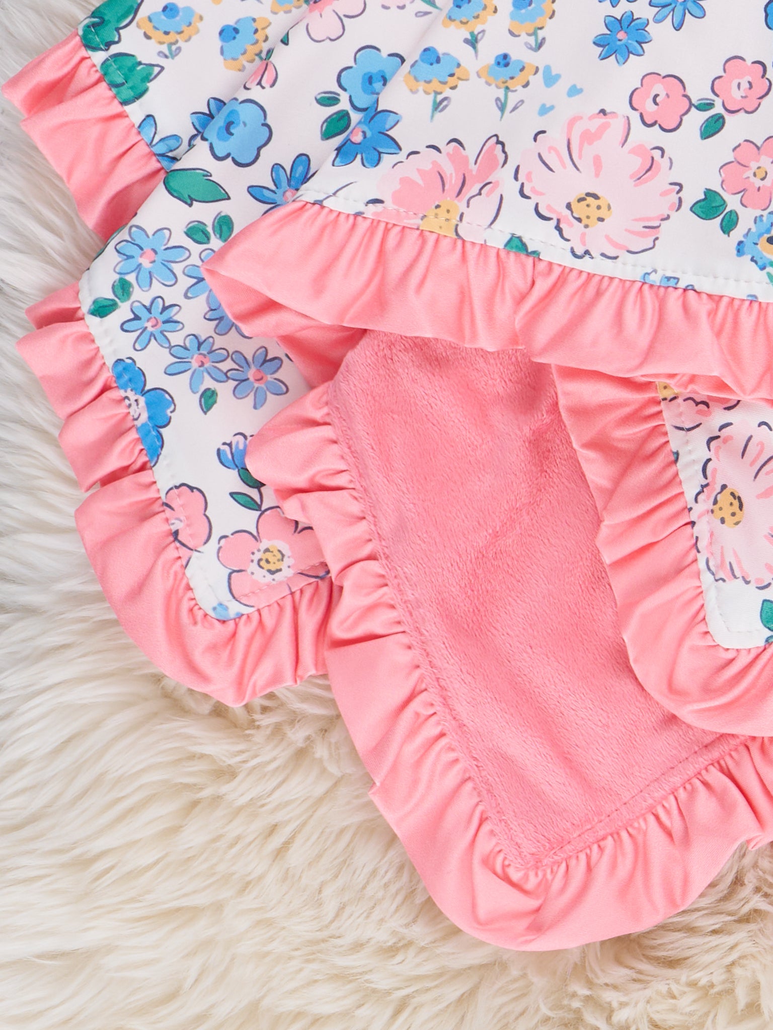 The Floral Fantasia Ruffle Blanket by Marie Nicole Clothing wraps little ones in cozy softness and whimsical floral style. Featuring a delicate floral print and playful ruffle trim, this blanket is perfect for snuggles, nursery décor, and adventures at home or on the go.