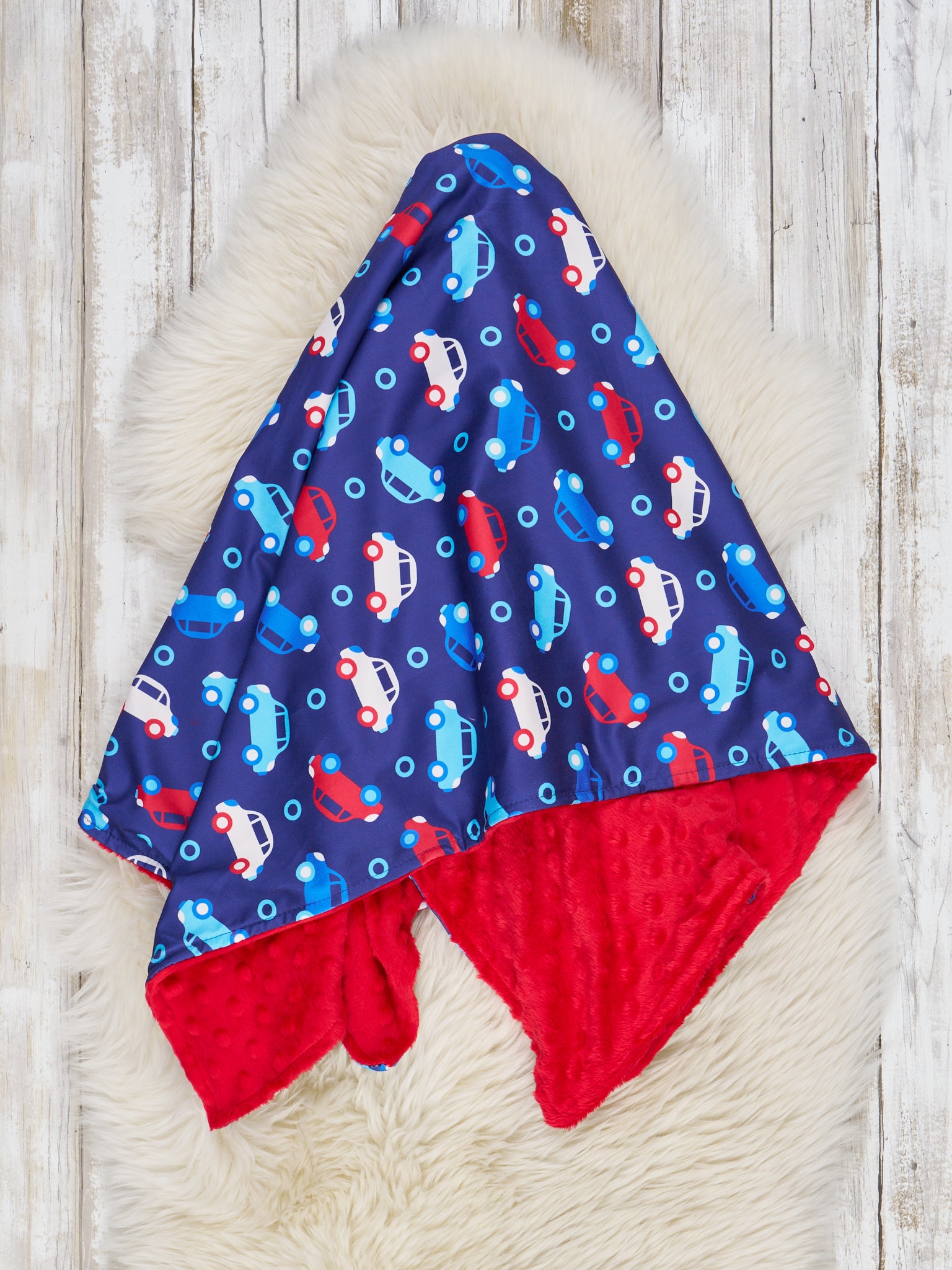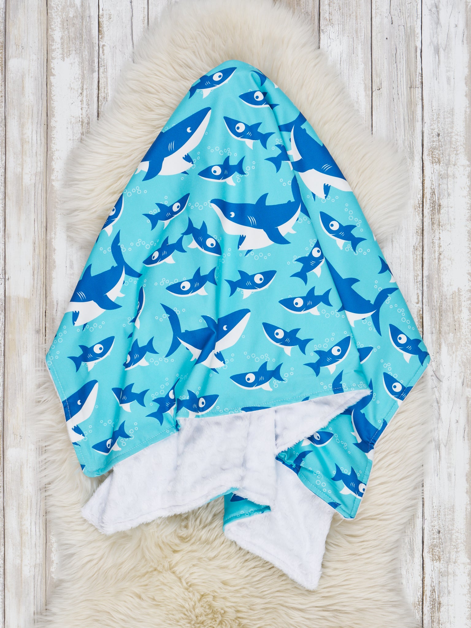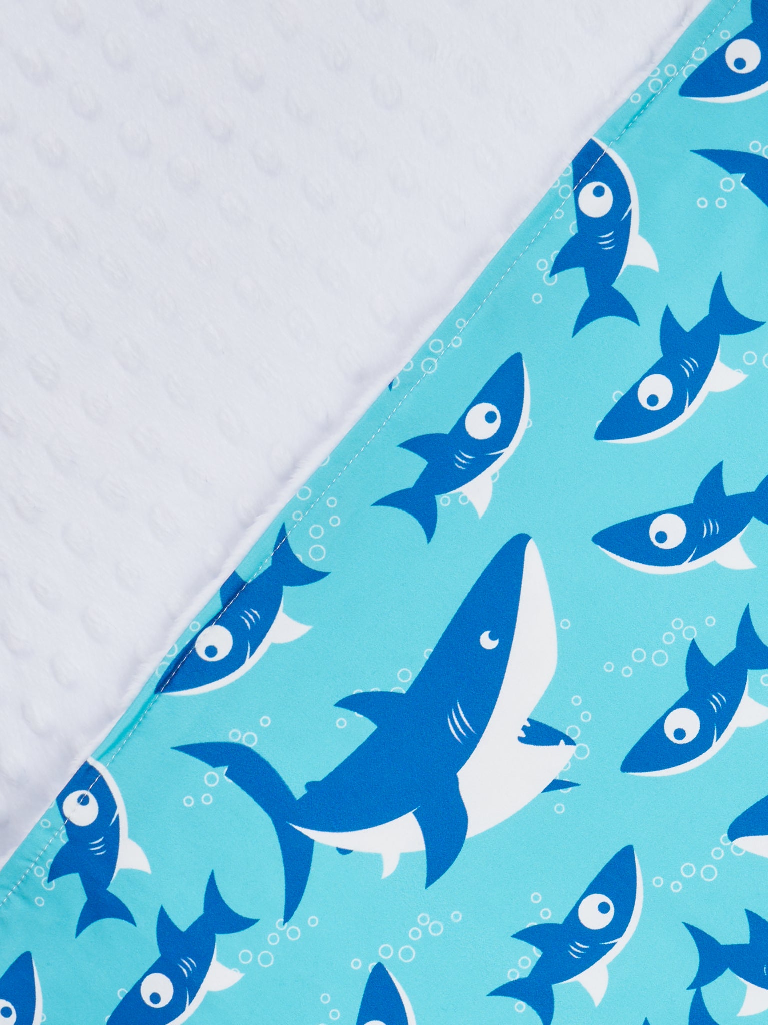 Blankets measure 32" x 32". Available in two prints: Sharks and Cars.