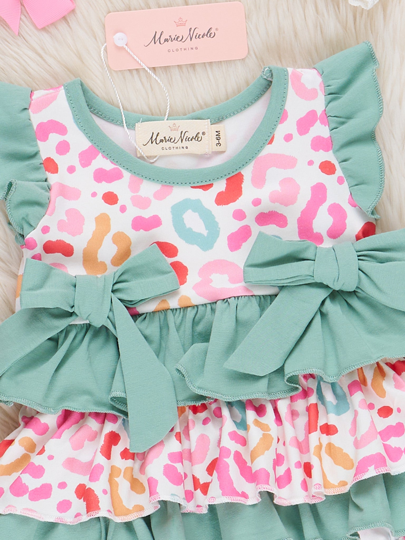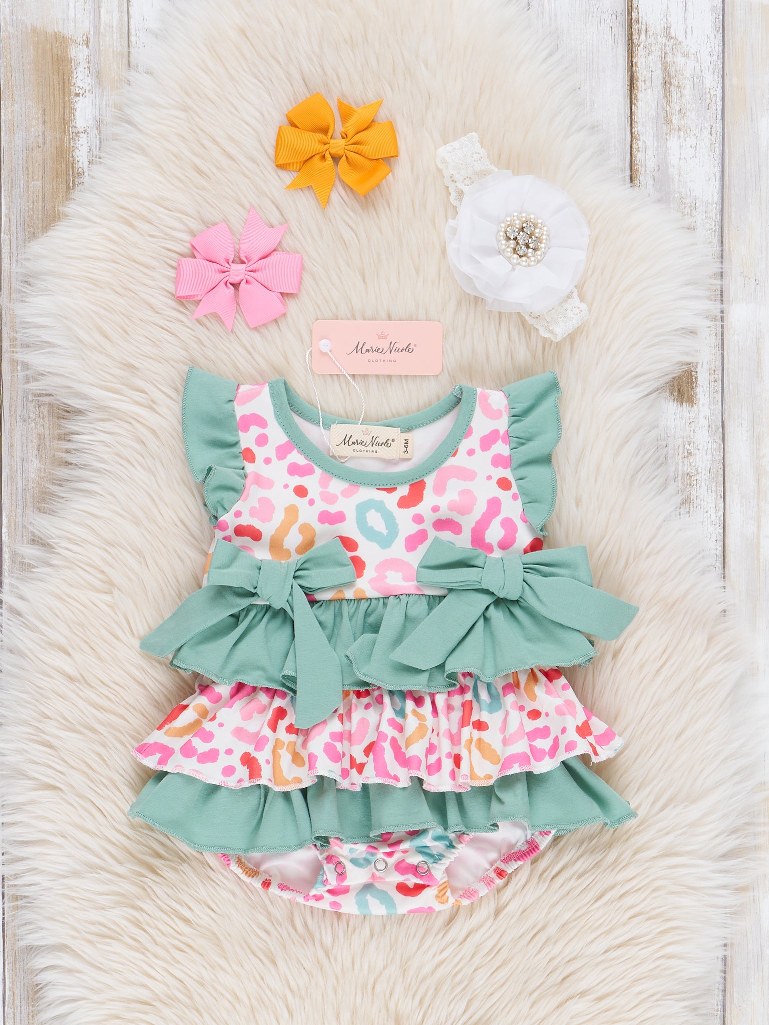 Sweet and playful, our Rainbow Safari Leopard Ruffle Bubble is a must-have for the season! Featuring a vibrant rainbow leopard print and charming bodice and ruffles, this bubble is perfect for your little fashionista. Let her make a statement with this cute and fun ensemble by Marie Nicole Clothing!