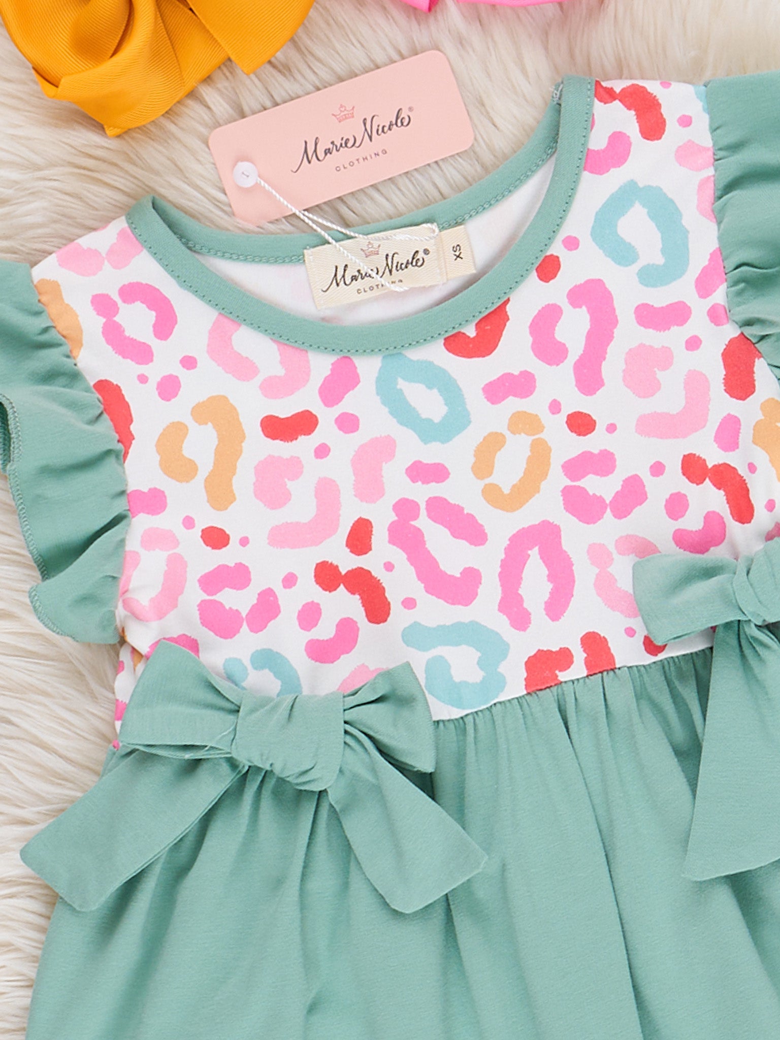 Sweet and playful, our Rainbow Safari Leopard Ruffle Outfit is a must-have for the season! Featuring a vibrant rainbow leopard print and charming bodice and ruffles, this outfit is perfect for your little fashionista. Let her make a statement with this cute and fun ensemble by Marie Nicole Clothing!