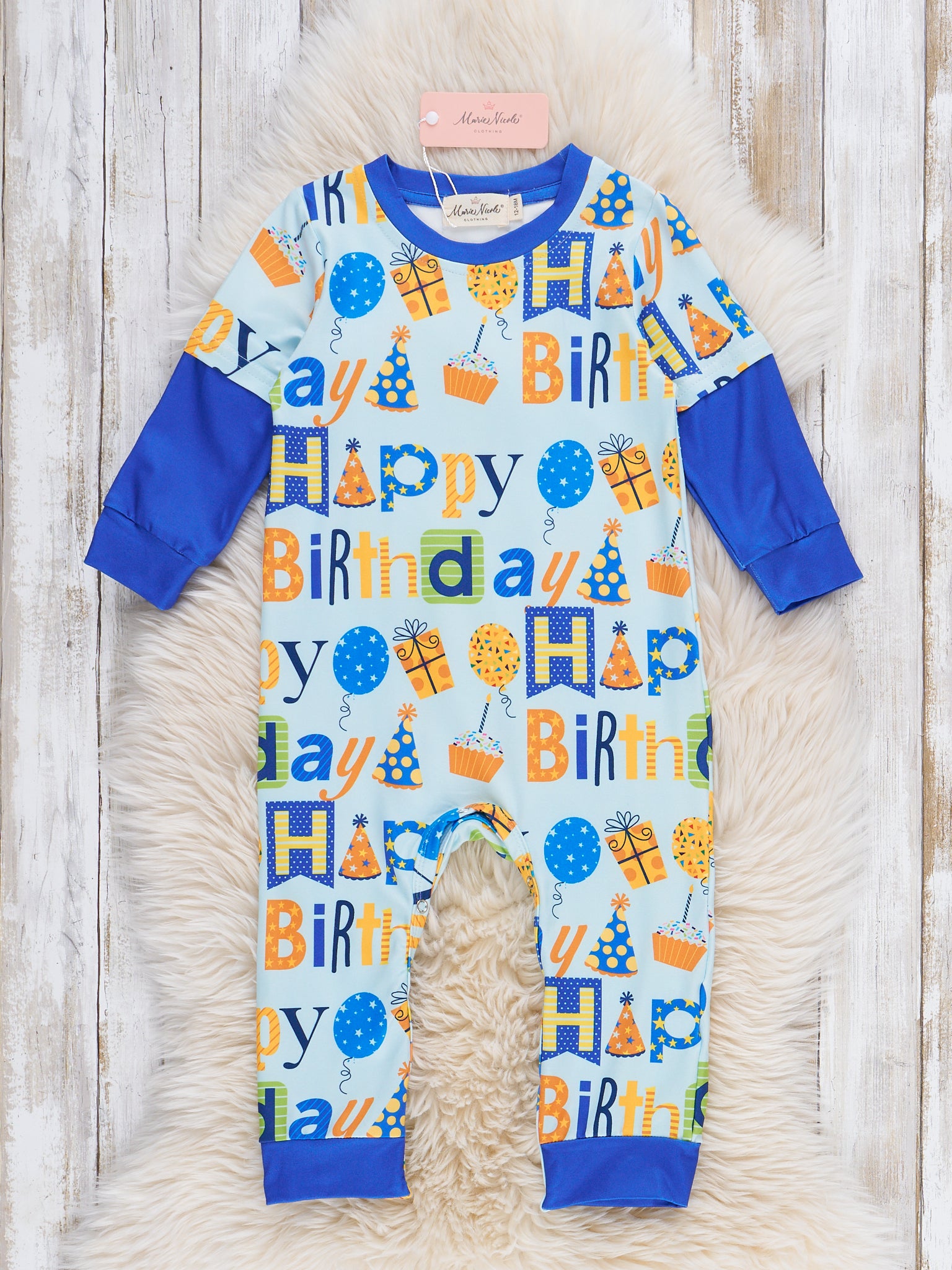 The Happy Birthday Wishes Romper by Marie Nicole Clothing features a lively birthday-themed print with graphic motifs and cheerful lettering, as well as contrasting long sleeves and cuffs. Designed for comfort and ease, this romper makes every celebration playful and bright.