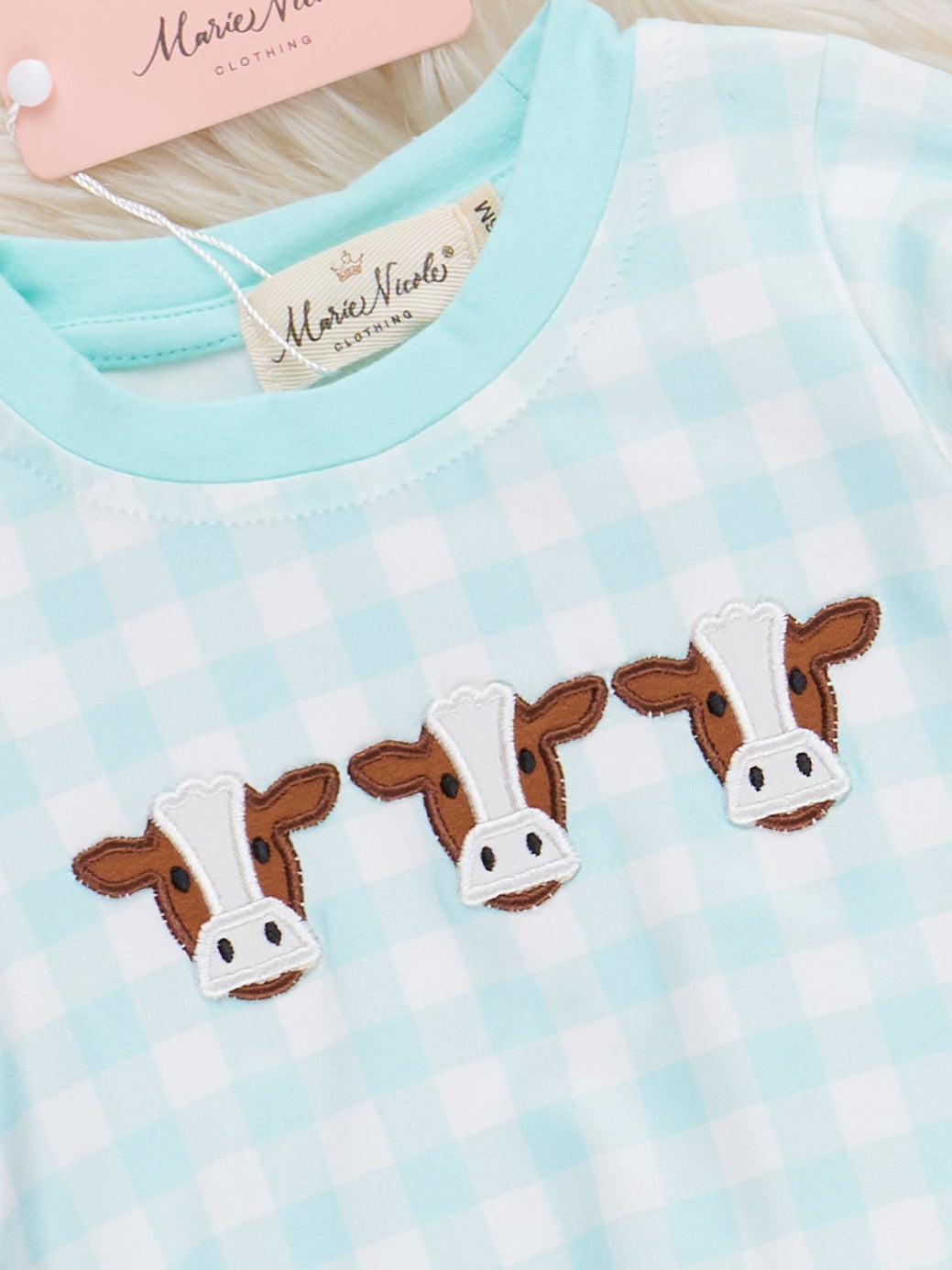 The Happy Moo Days Plaid Romper by Marie Nicole Clothing features a soft plaid fabric and a playful embroidered design on the chest. Designed for all-day comfort and easy movement, this romper blends charming style with cozy wear for little ones.