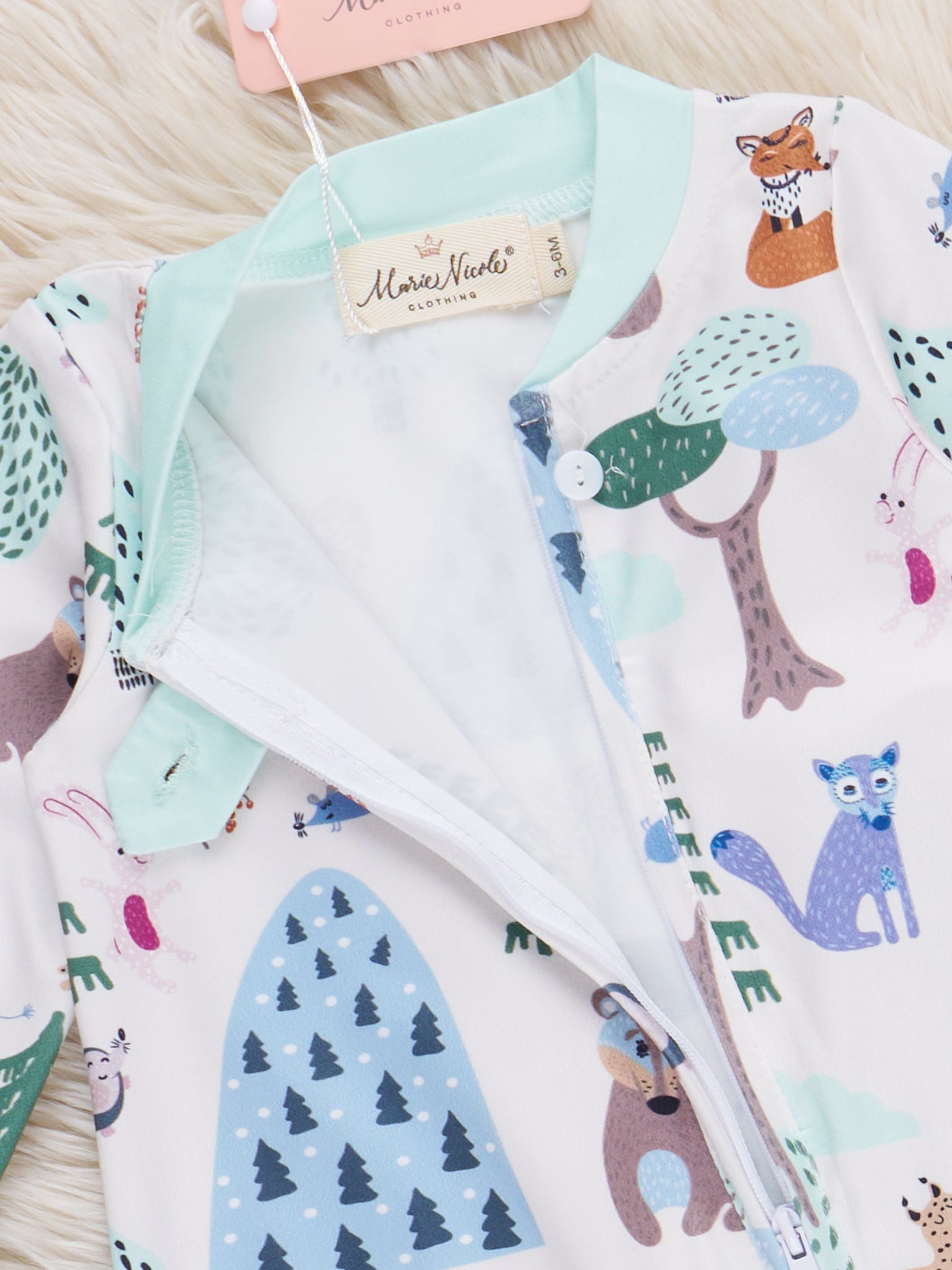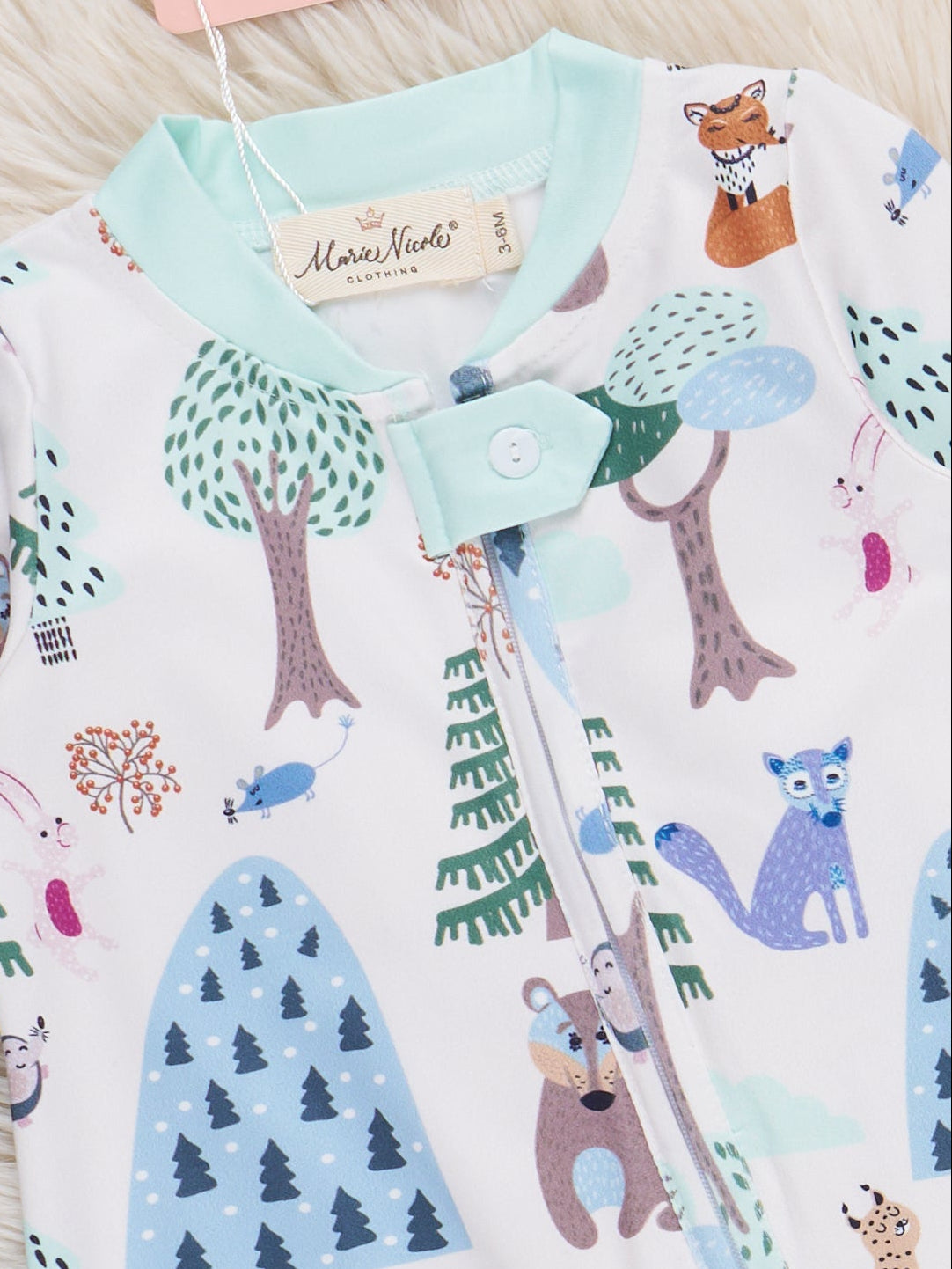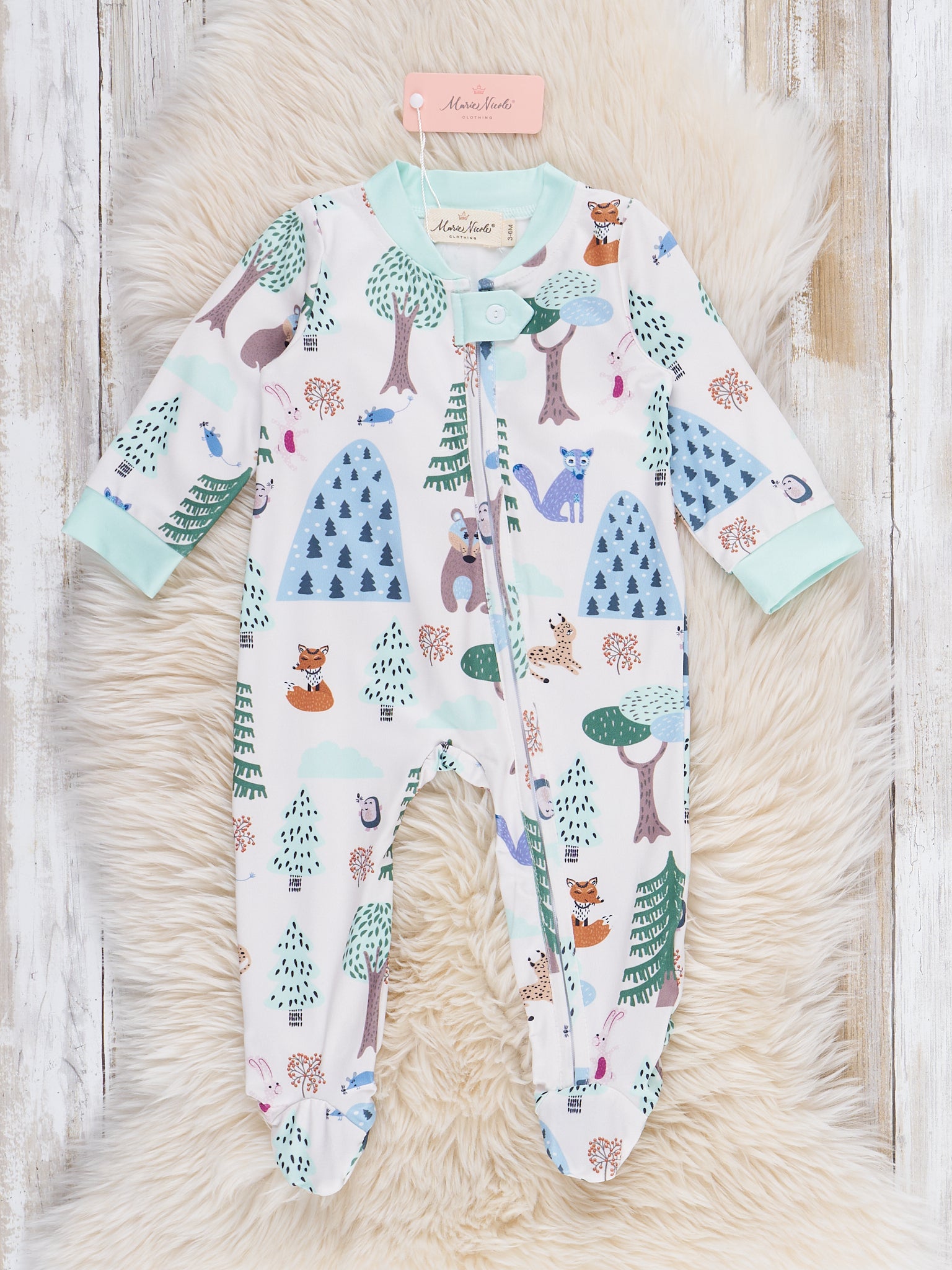 The Little Explorer Forest Footed Sleeper Pajamas by Marie Nicole Clothing feature a whimsical woodland print with animals, pine trees, and playful nature motifs. Designed with gentle mint cuffs and collar, this one-piece sleeper provides soft, cozy fabric and built-in footies for all-night warmth and charming style.