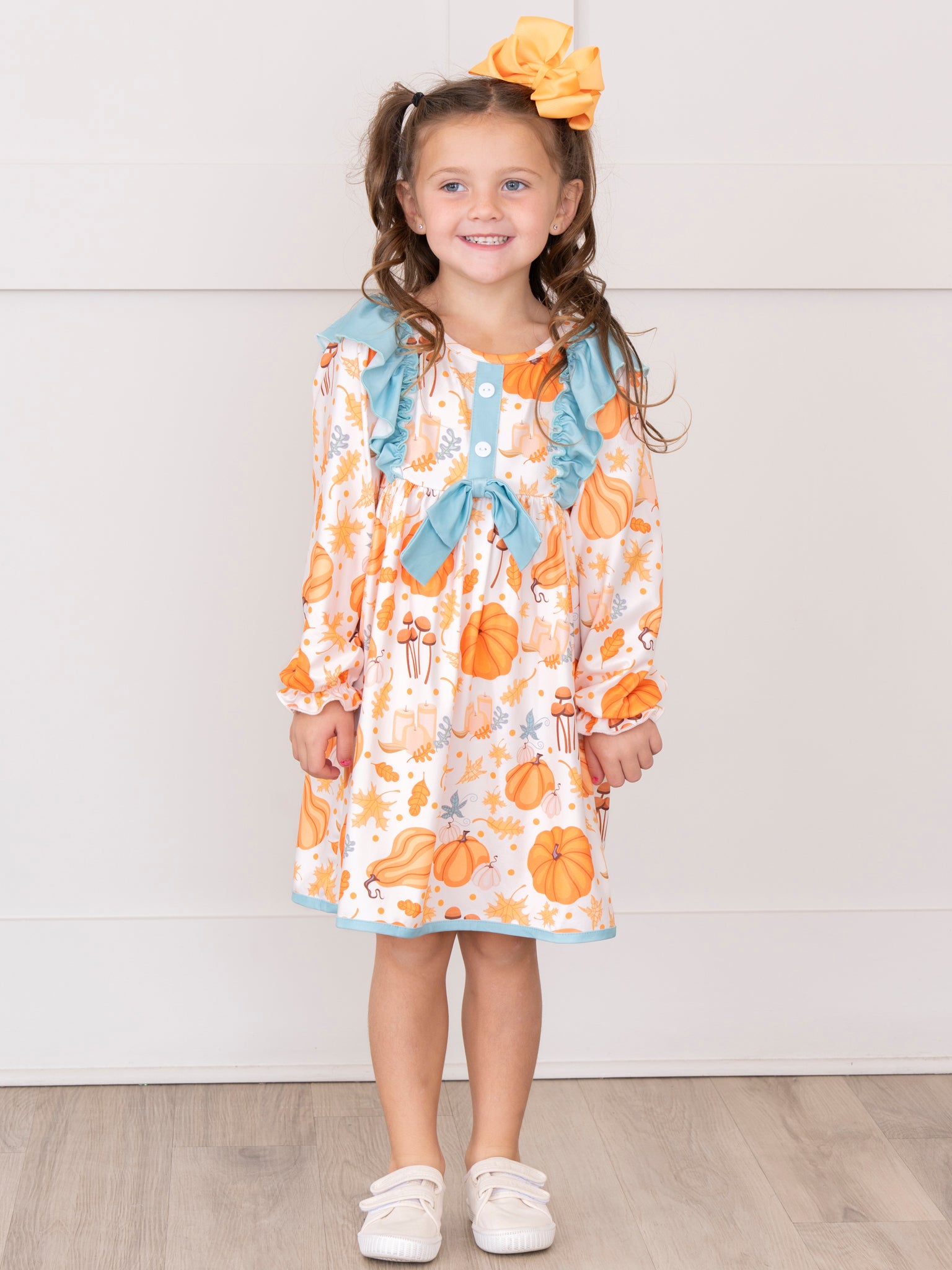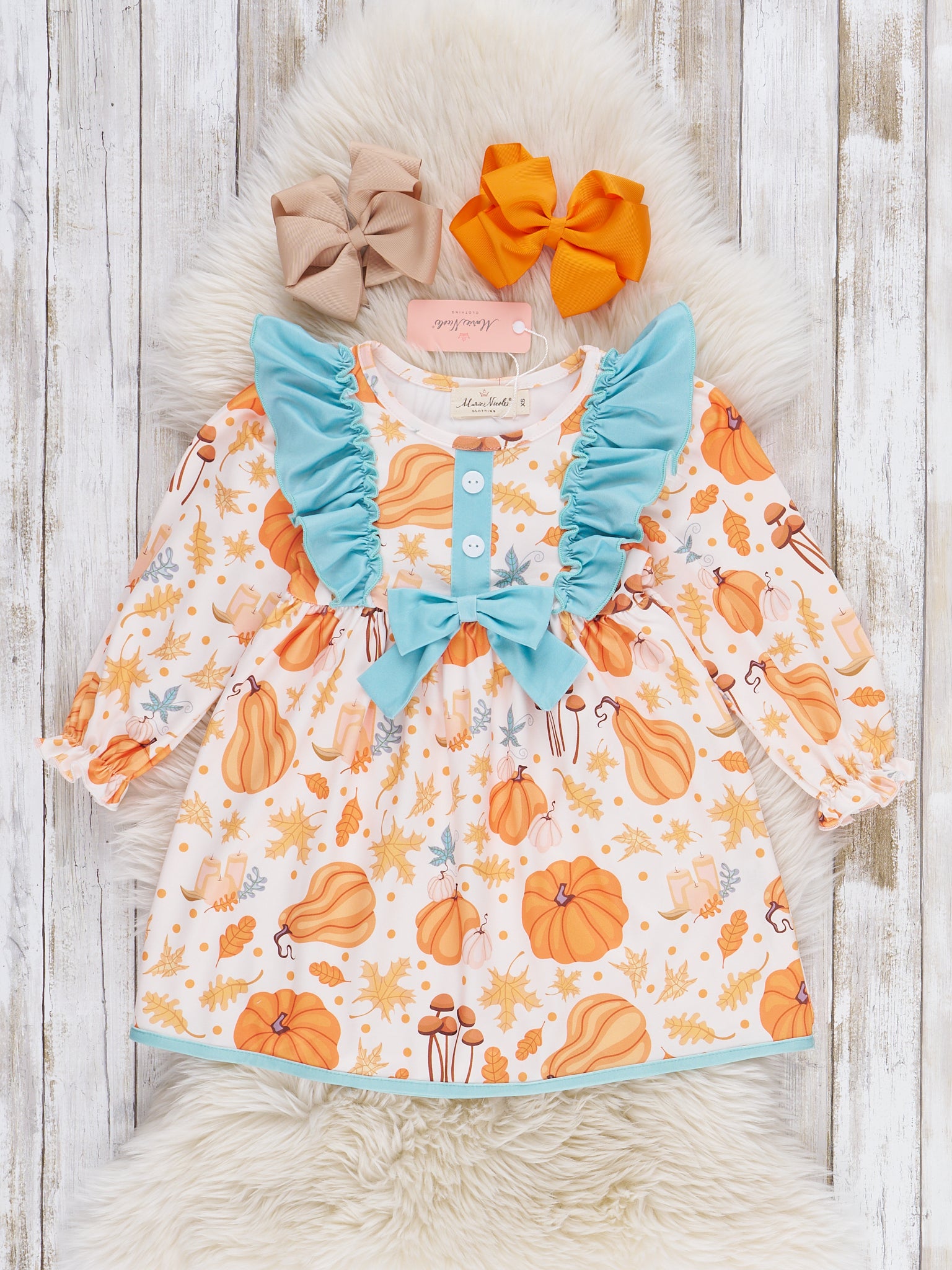 Abundant Autumn Ruffle Dress is a beautiful homage to autumn harvests and its colors. Full of leaves and gourds, this piece by Marie Nicole Clothing features ruffles and bows, with a plentiful print of pumpkins, foliage, candles, and mushrooms. It captures the coziness and loveliness of fall in a soft, comfortable dress, making it the perfect for your little girl to wear to Thanksgiving celebrations, pumpkin patches, or simply a nice autumn day!