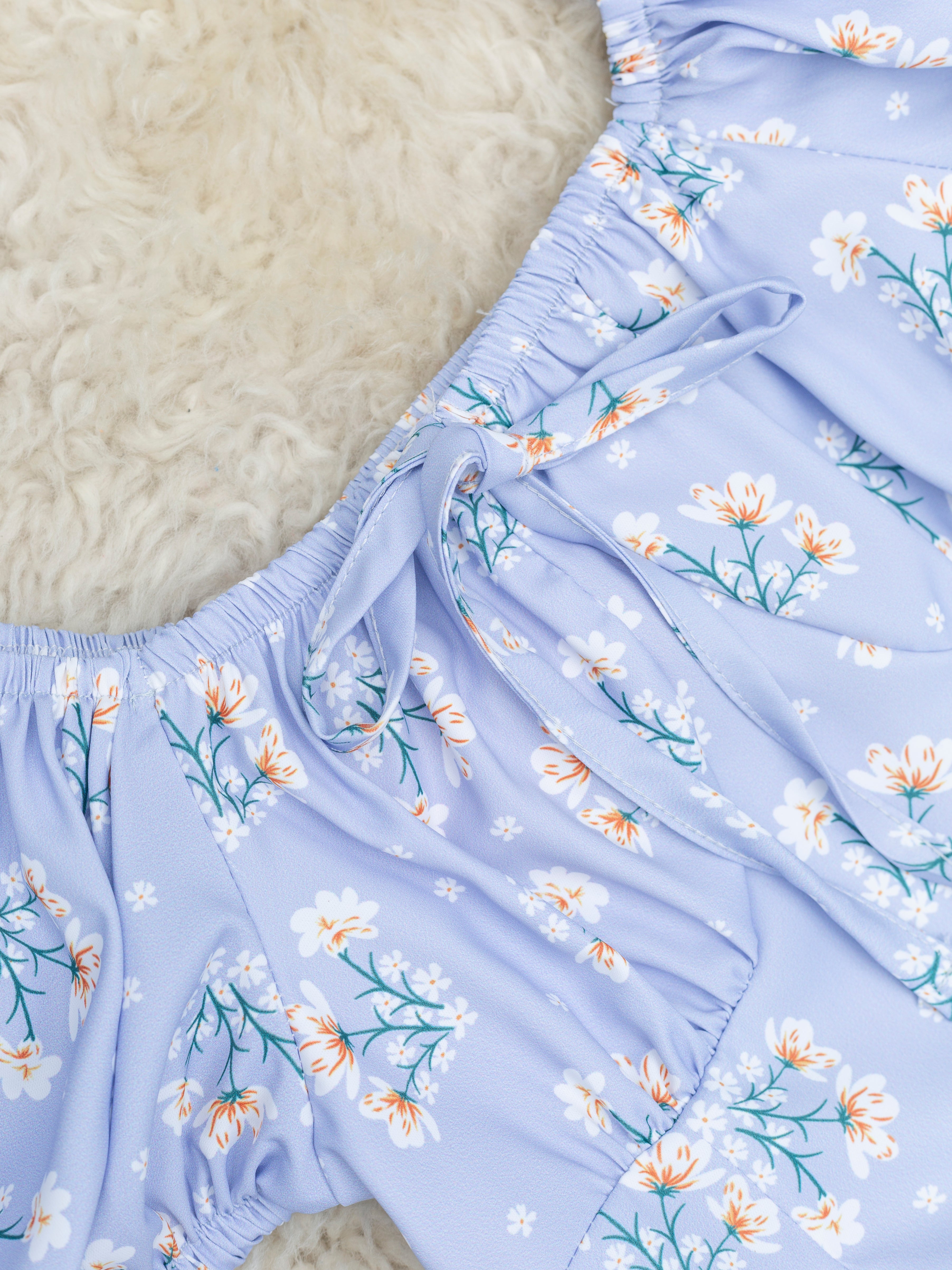 A closet stable for your trendy teens! This cornflower top features puff sleeves, a tie detail, florals, & ruffles.