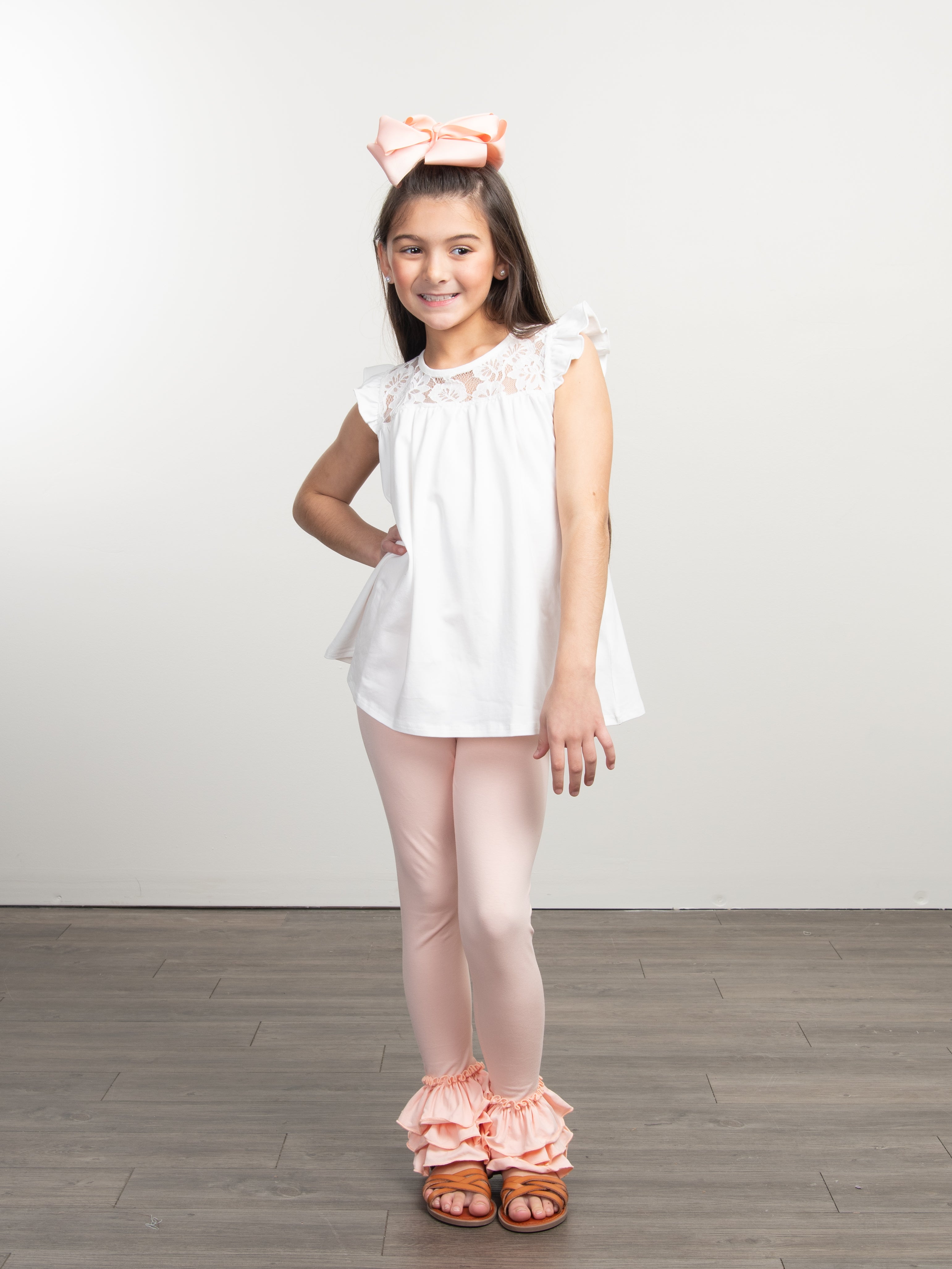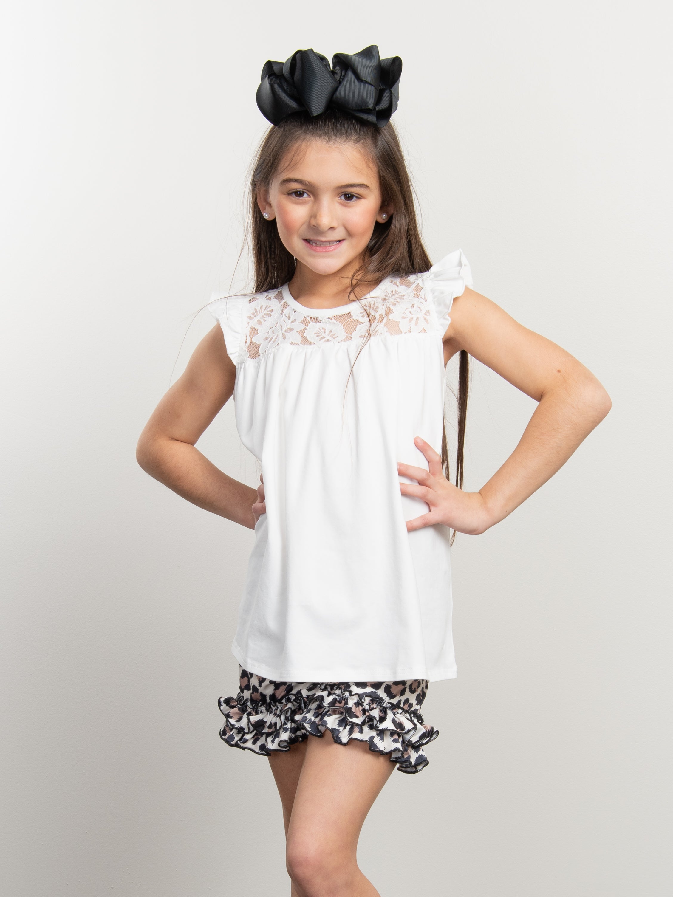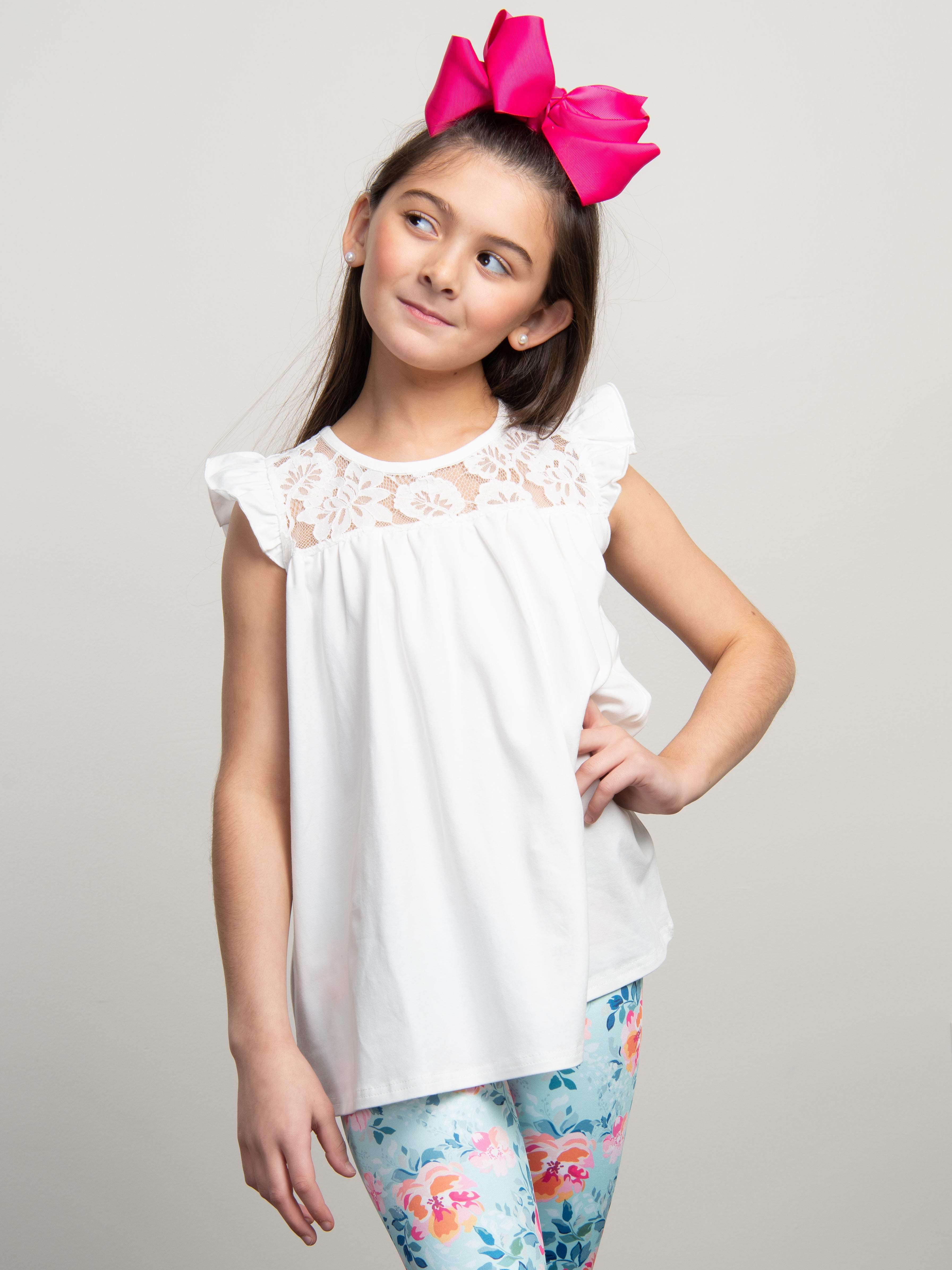 The softest cotton tunics for your sweet girls! This white tunic feature flutter sleeves, lace details, & a keyhole at the nape of the neck for easy changing.