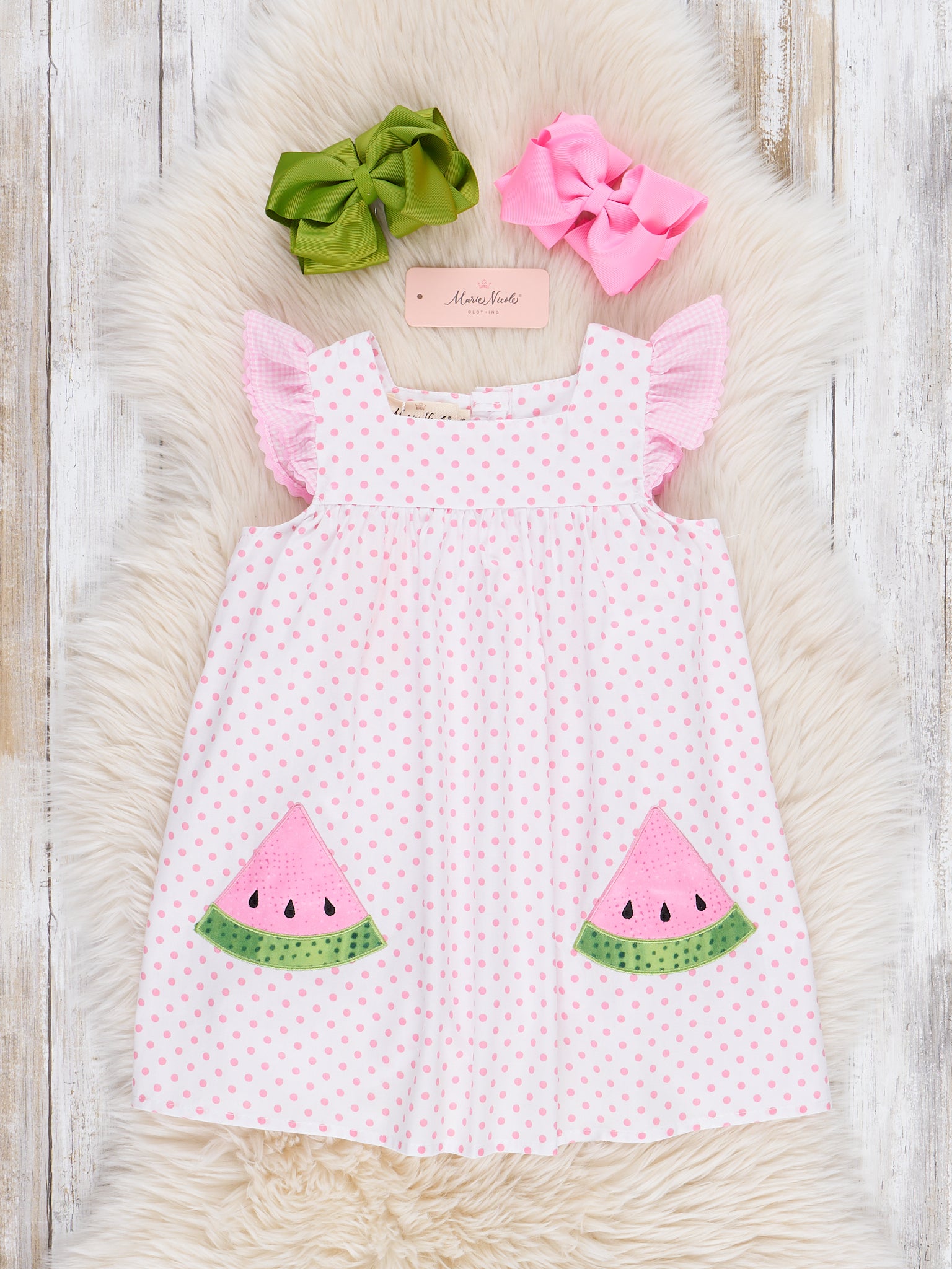 Sweeten up her summer wardrobe with the Dotty Watermelon Embroidered Flutter Dress from Marie Nicole Clothing! This charming dress features a playful polka dot pattern and vibrant watermelon embroidery that captures the essence of warm-weather fun. The ruffle-trimmed sleeves add a touch of whimsy and flair, perfect for picnics, playdates, or picture-perfect moments.