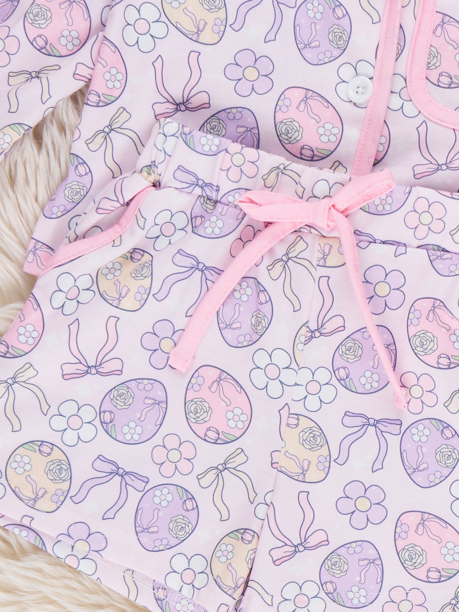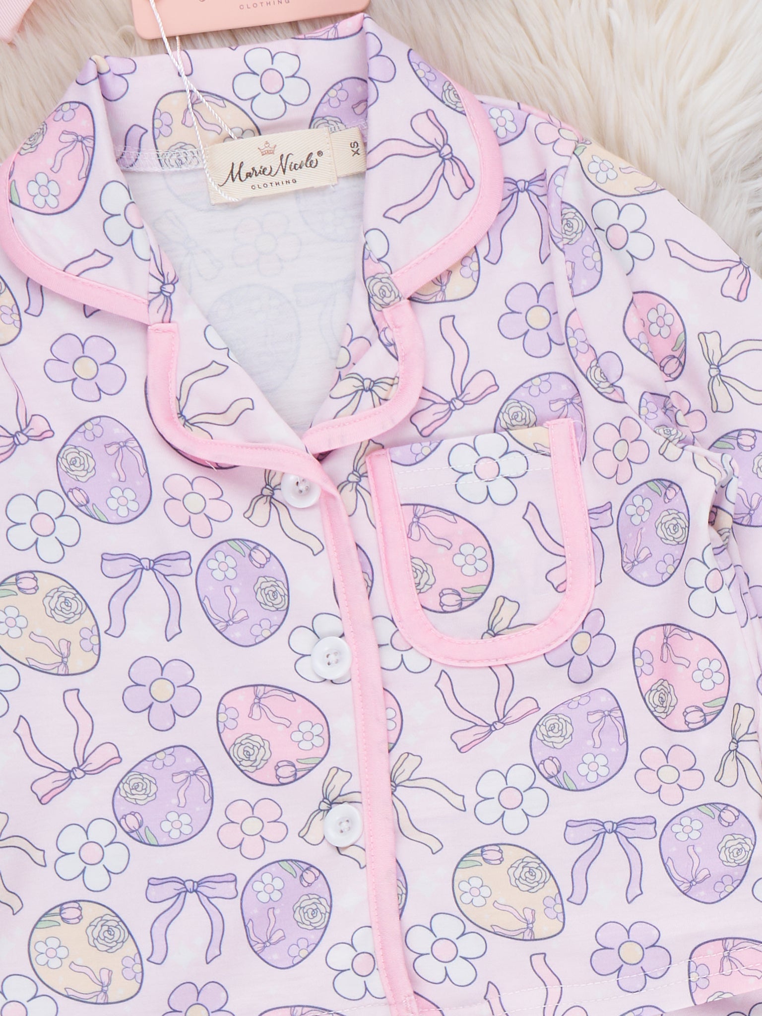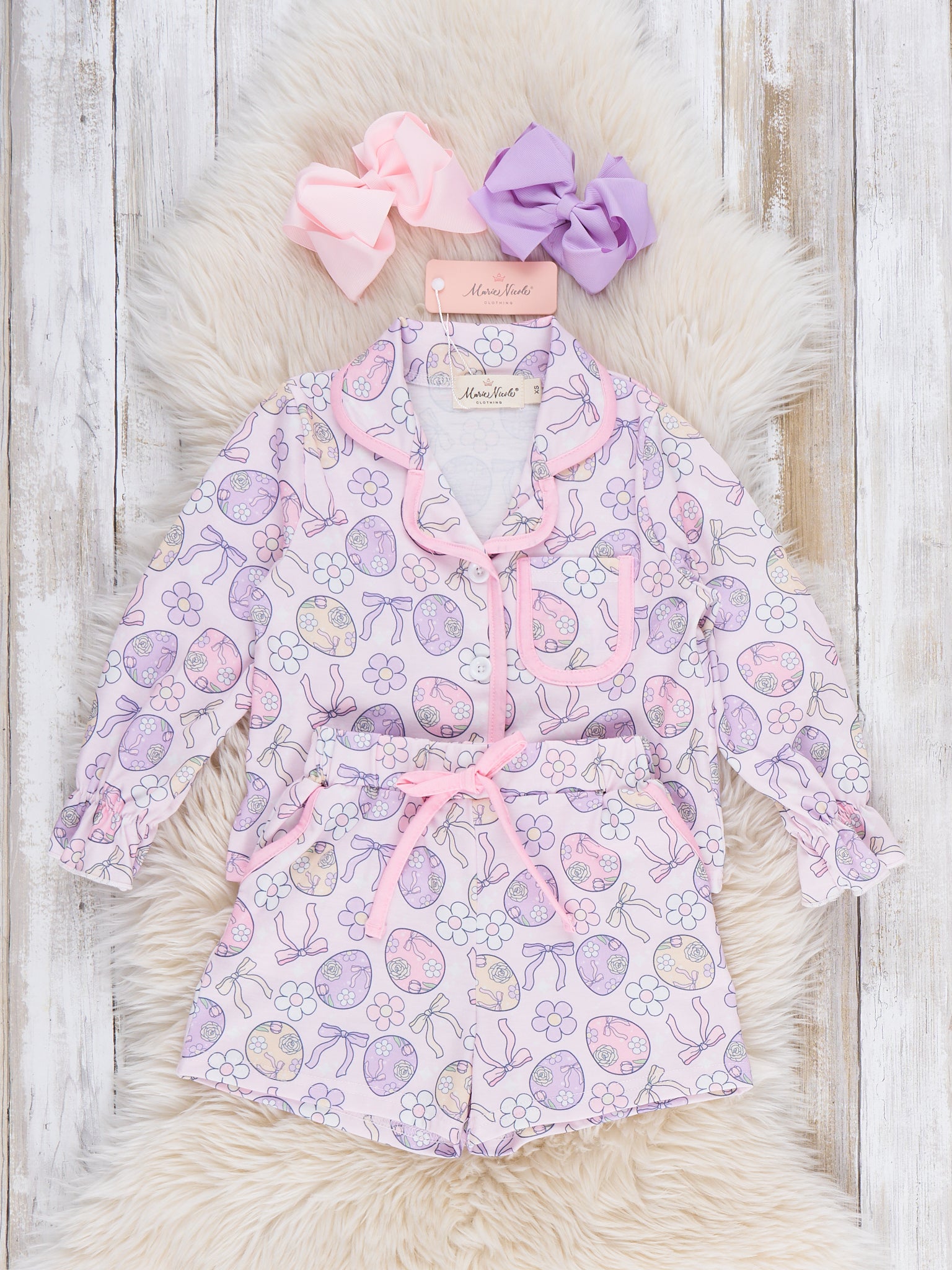 Egg Basket Pajamas by Marie Nicole Clothing are a cozy two-piece set featuring a button-front top and matching shorts in a pastel Easter-egg print with contrast piping. The soft knit fabric, elastic waist, and relaxed fit make this sweet set perfect for spring sleepovers, movie nights, and Easter-morning basket opening.