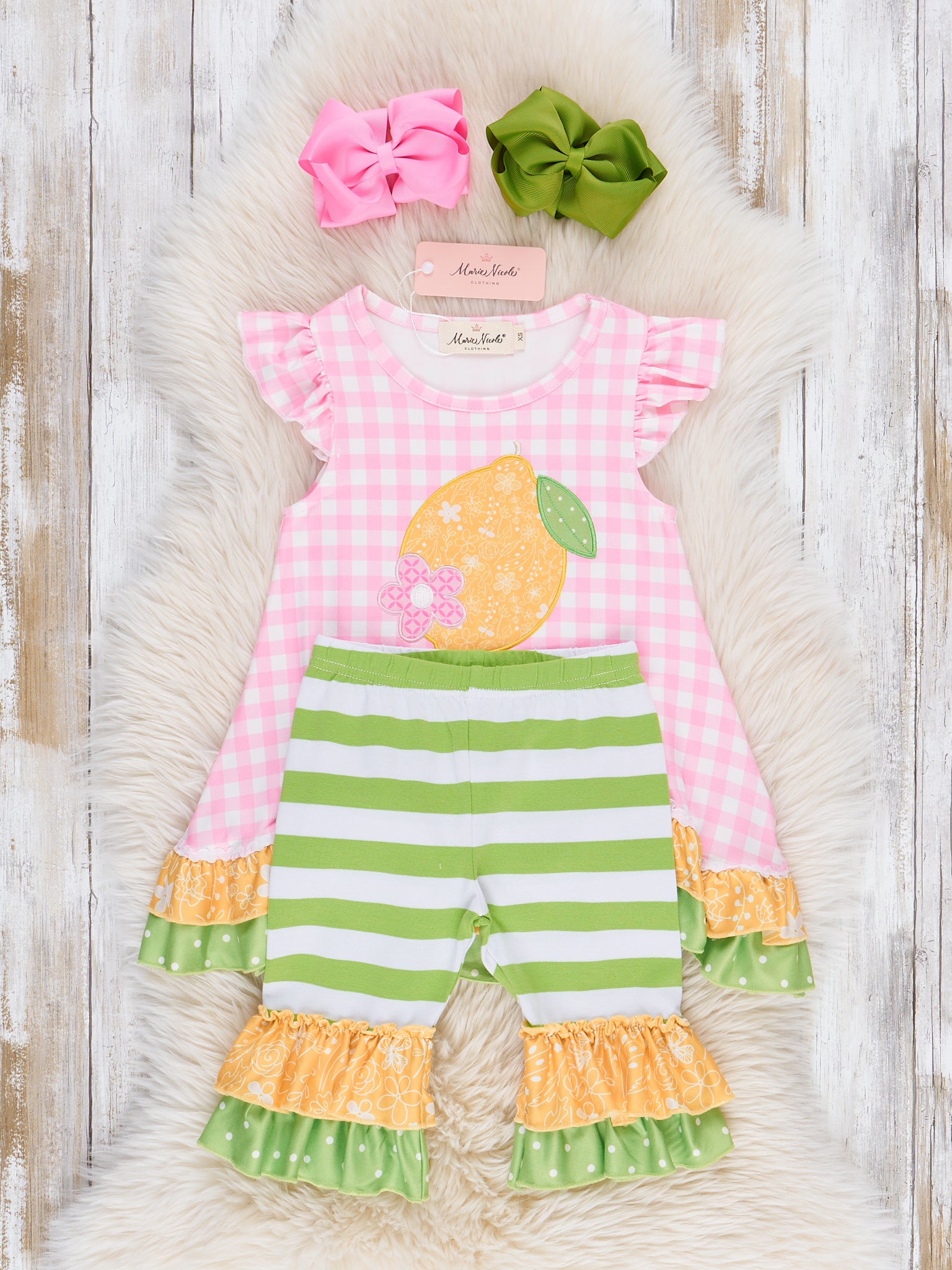The Embroidered Lemons Gingham Ruffle Outfit features cheerful lemon embroidery on classic pink gingham, paired with charming ruffle details for a fresh, sunny look. Soft and lightweight, it's the perfect outfit from Marie Nicole Clothing for warm-weather outings and picture-perfect moments.