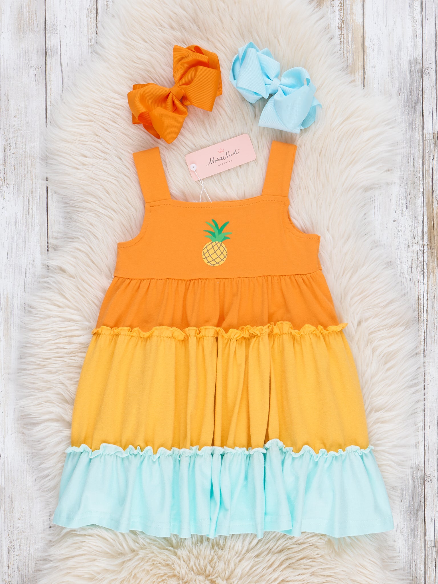 Get your girly girl ready for summer with this playful Tiered Colorblock Dress by Marie Nicole Clothing. The color block design in orange, yellow, and light blue screams sunshine and smiles, while the vinyl pineapple adds a touch of quirkiness. Perfect for any summer adventure!
