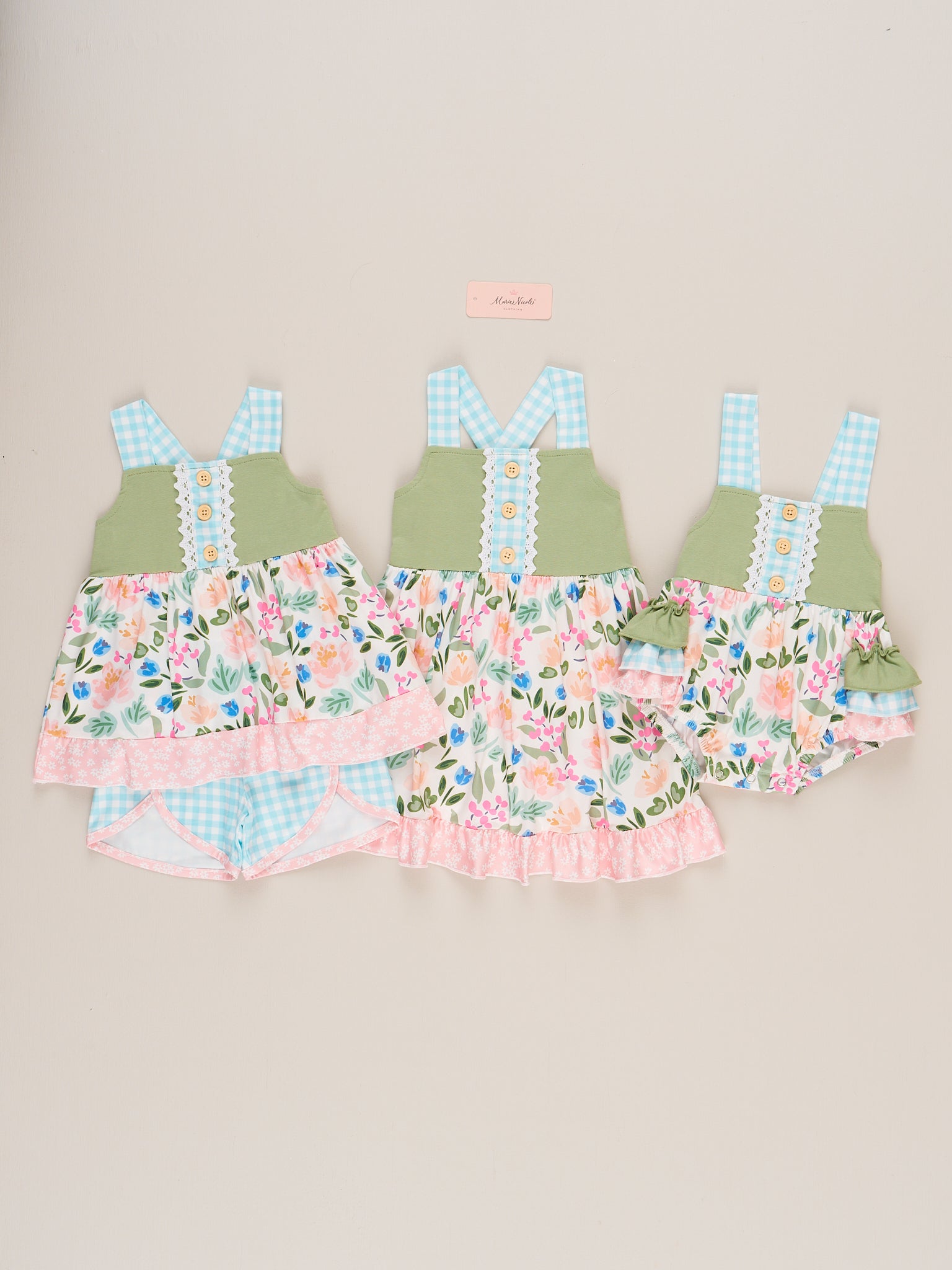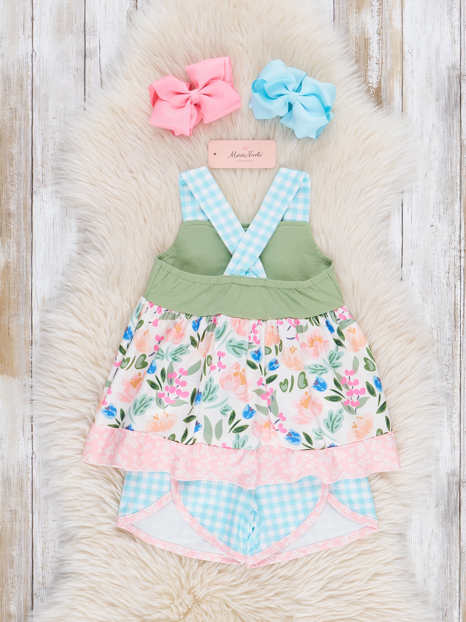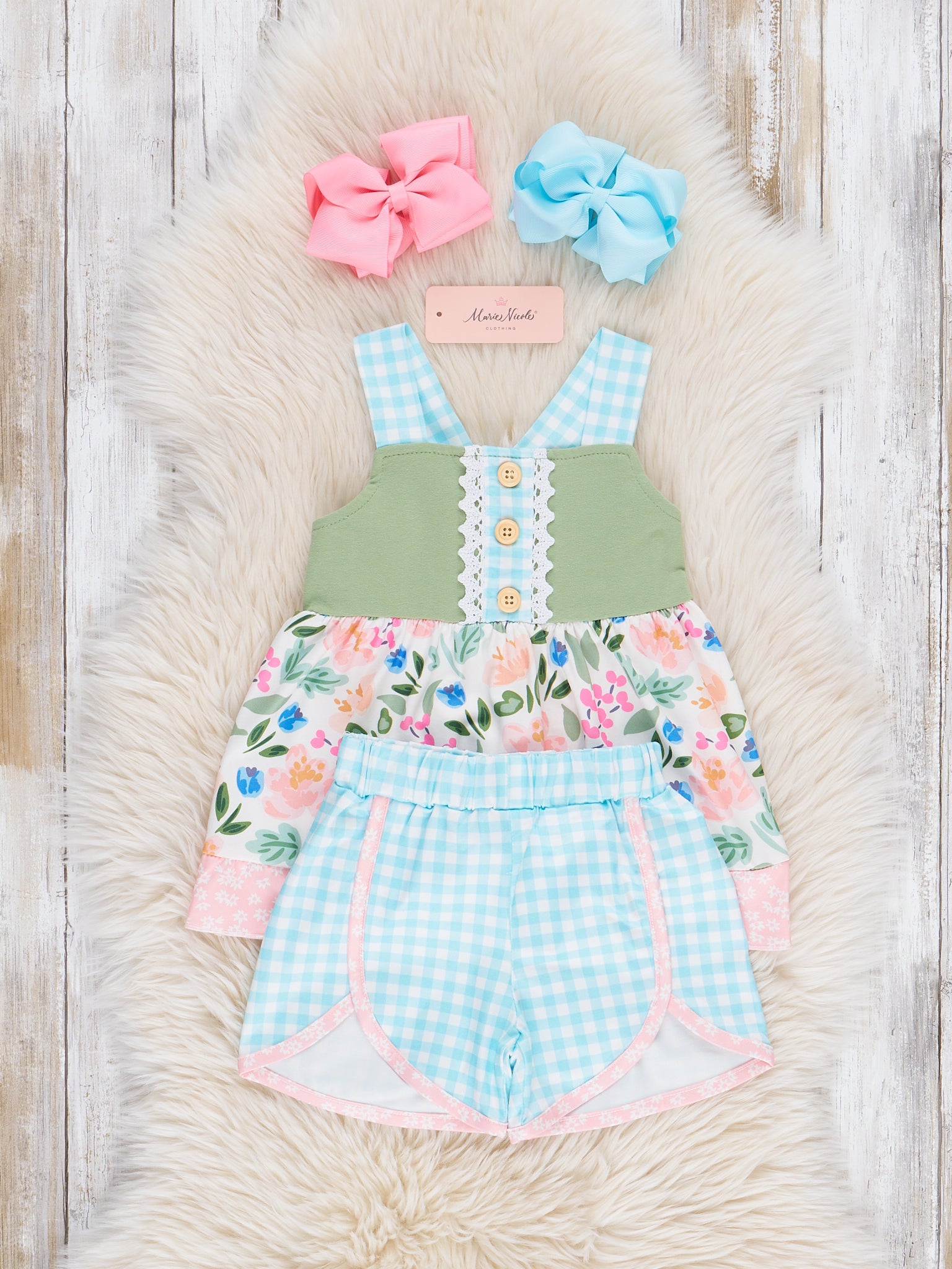 The Gingham Rose Garden Outfit from Marie Nicole Clothing is blooming with charm, featuring a classic gingham print and delicate rose details. Soft, lightweight fabric and sweet ruffle accents make it perfect for sunny strolls and garden play. A picture-perfect look for your little flower!