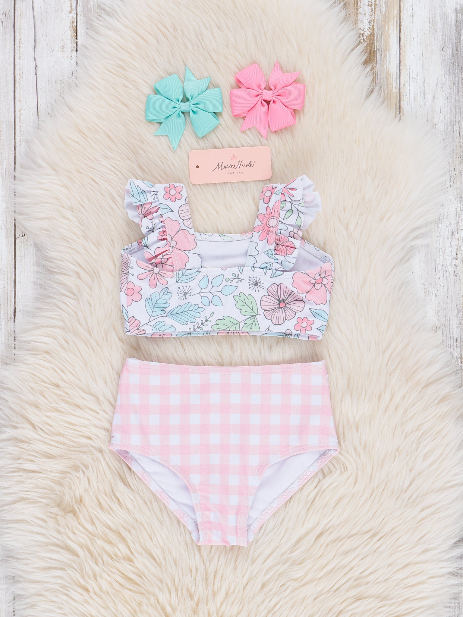 Your little one will be ready for some fun in the sun with our Gingham Wildflowers Swimsuit! Featuring a playful wildflower doodle print top with a ruffle detail, and pink gingham high waist bottoms, this two-piece swimsuit from Marie Nicole Clothing is the perfect choice for a day at the beach or pool. Get yours now!