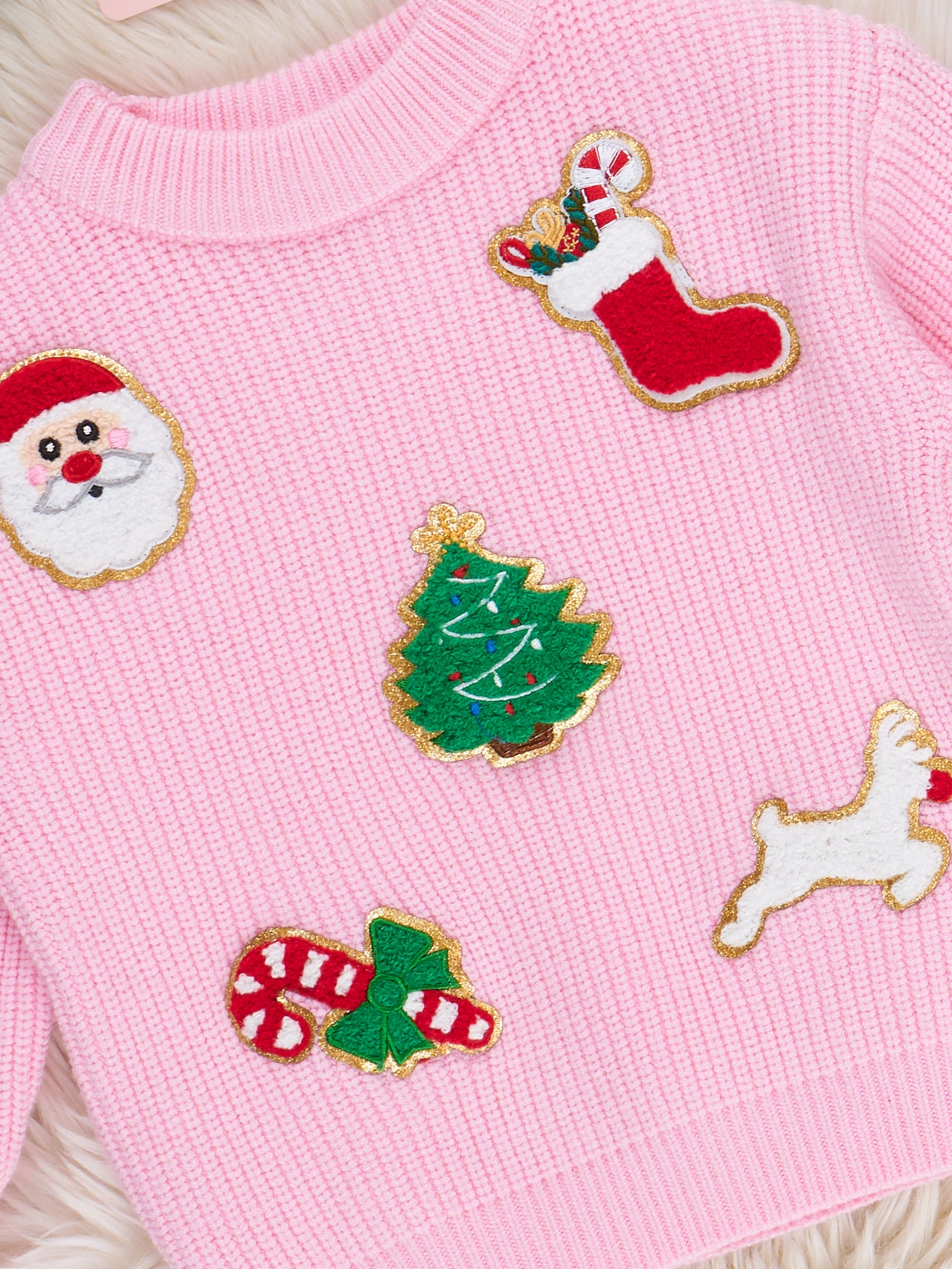 The Jolly Season Sweater by Marie Nicole Clothing features playful holiday-themed appliqués, including festive icons like Santa, a stocking, a Christmas tree, and more. This cozy knit is perfect for bringing a cheerful touch to everyday outfits and holiday celebrations throughout the season.