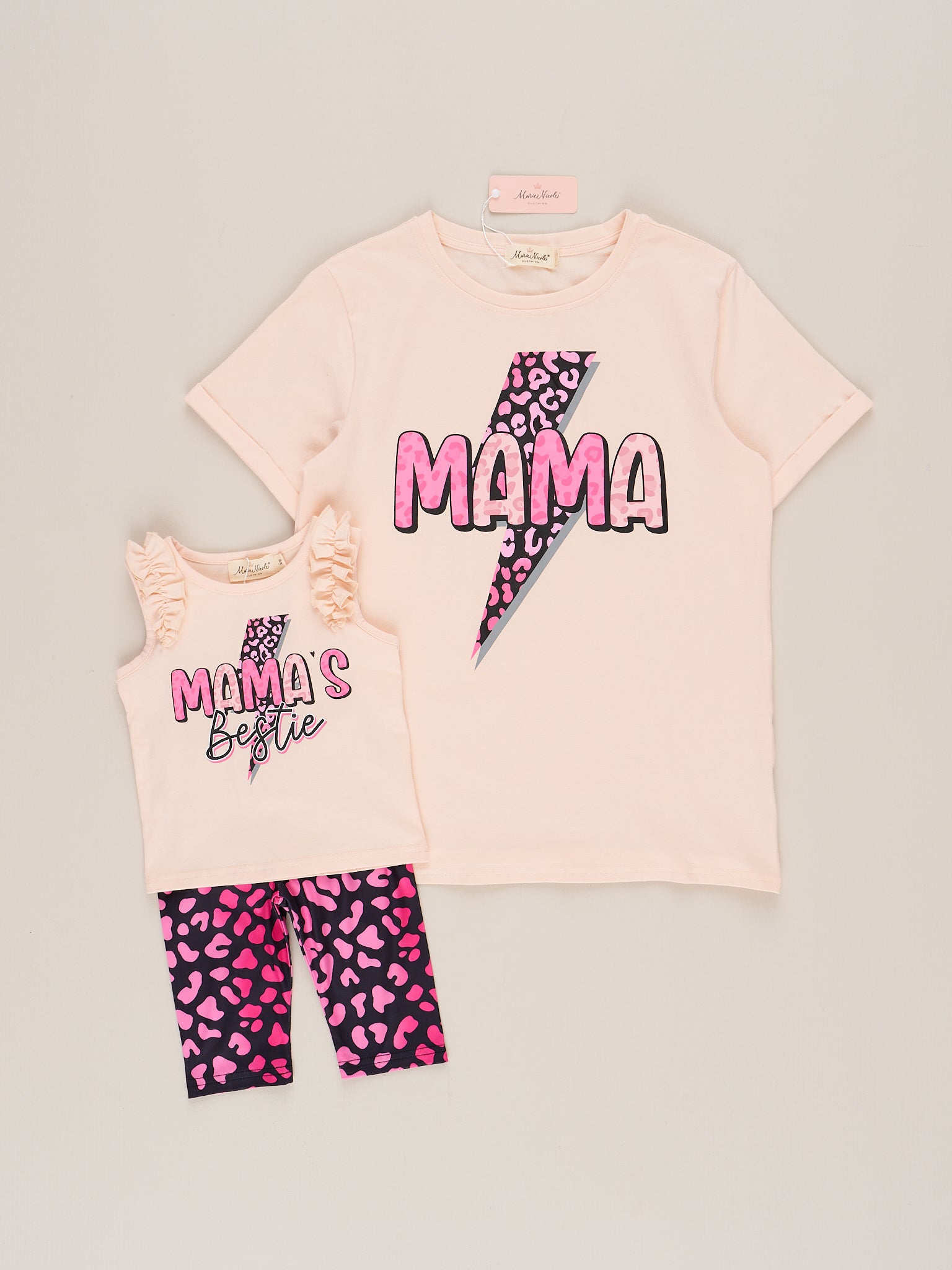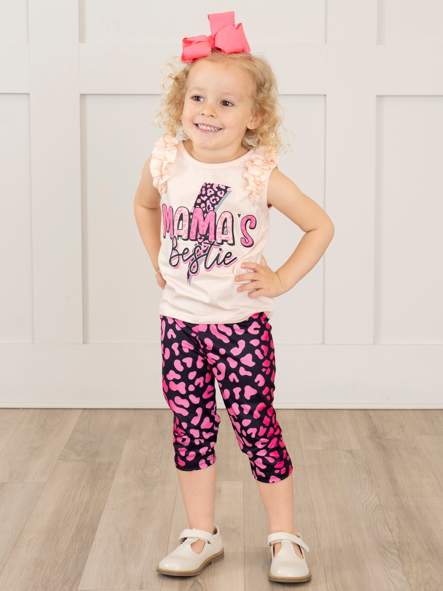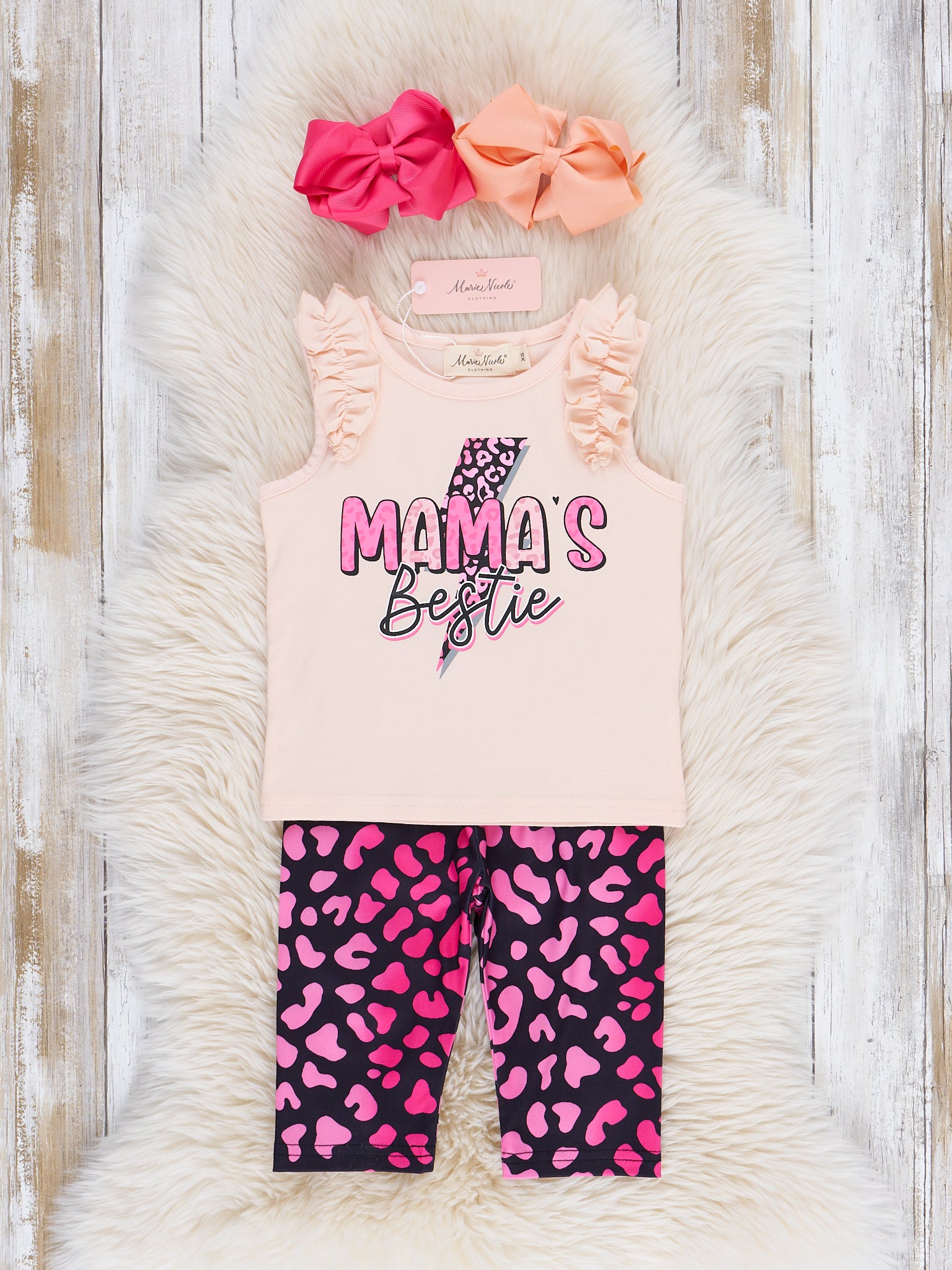Featuring a fun leopard print with a striking lightning bolt design, Mama's Bestie Leopard Lightning Outfit from Marie Nicole Clothing is the perfect match to their Mama.