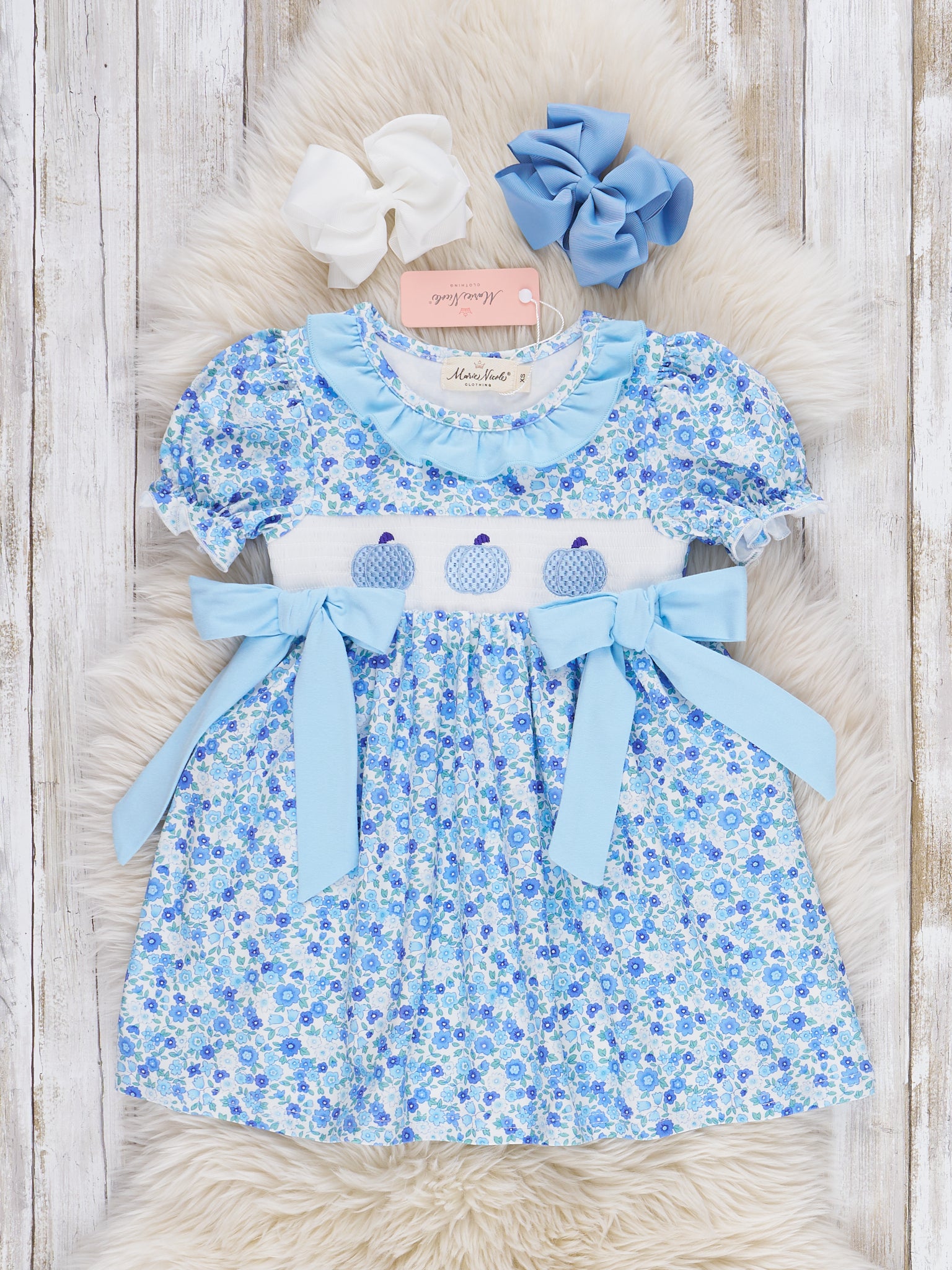 Delightful with florals, the Pumpkins and Periwinkles Smocked Bow Dress celebrates fall beauty with a flowery, blue charm. The bodice is smocked and embroidered with pumpkins and accentuated with bows. This cute and comfy dress by Marie Nicole Clothing will make your little girl look absolutely adorable for any autumn activities and Thanksgiving moments!