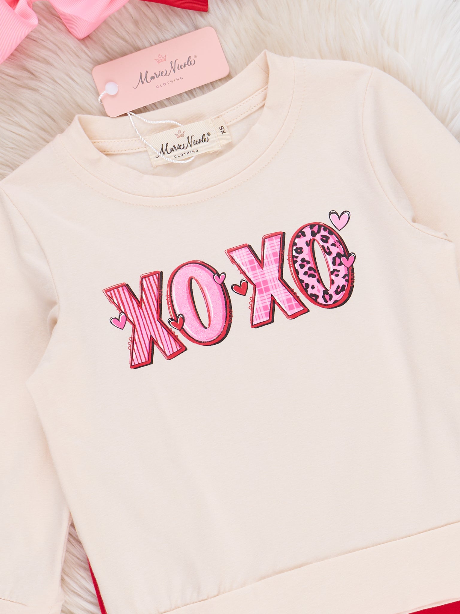 Get ready to spread some love with our Red XOXO Outfit by Marie Nicole Clothing! This girls' outfit features a cream top with a playful "XOXO" design, paired with comfortable red pull-on pants. Perfect for celebrating Valentine's Day!