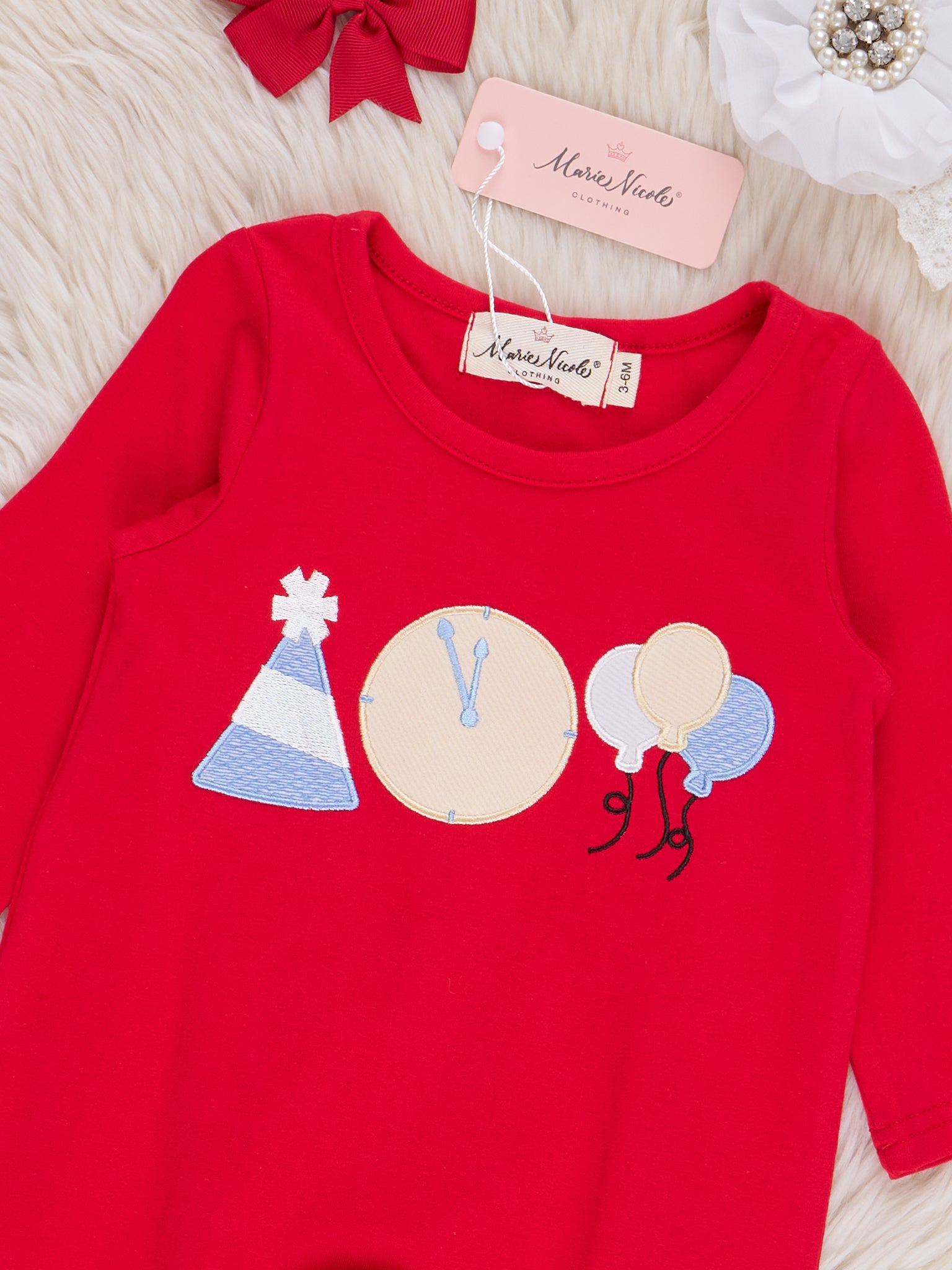 Get ready to party with this playful Red & Yellow Party Time sibling set by Marie Nicole Clothing! Perfect for celebrating the New Year, this girls romper features a vibrant red bodice with an embroidered party theme and fun yellow ruffles. Make a statement and have some fun with this stylish and unique romper! Features a party hat, clock, and balloons.