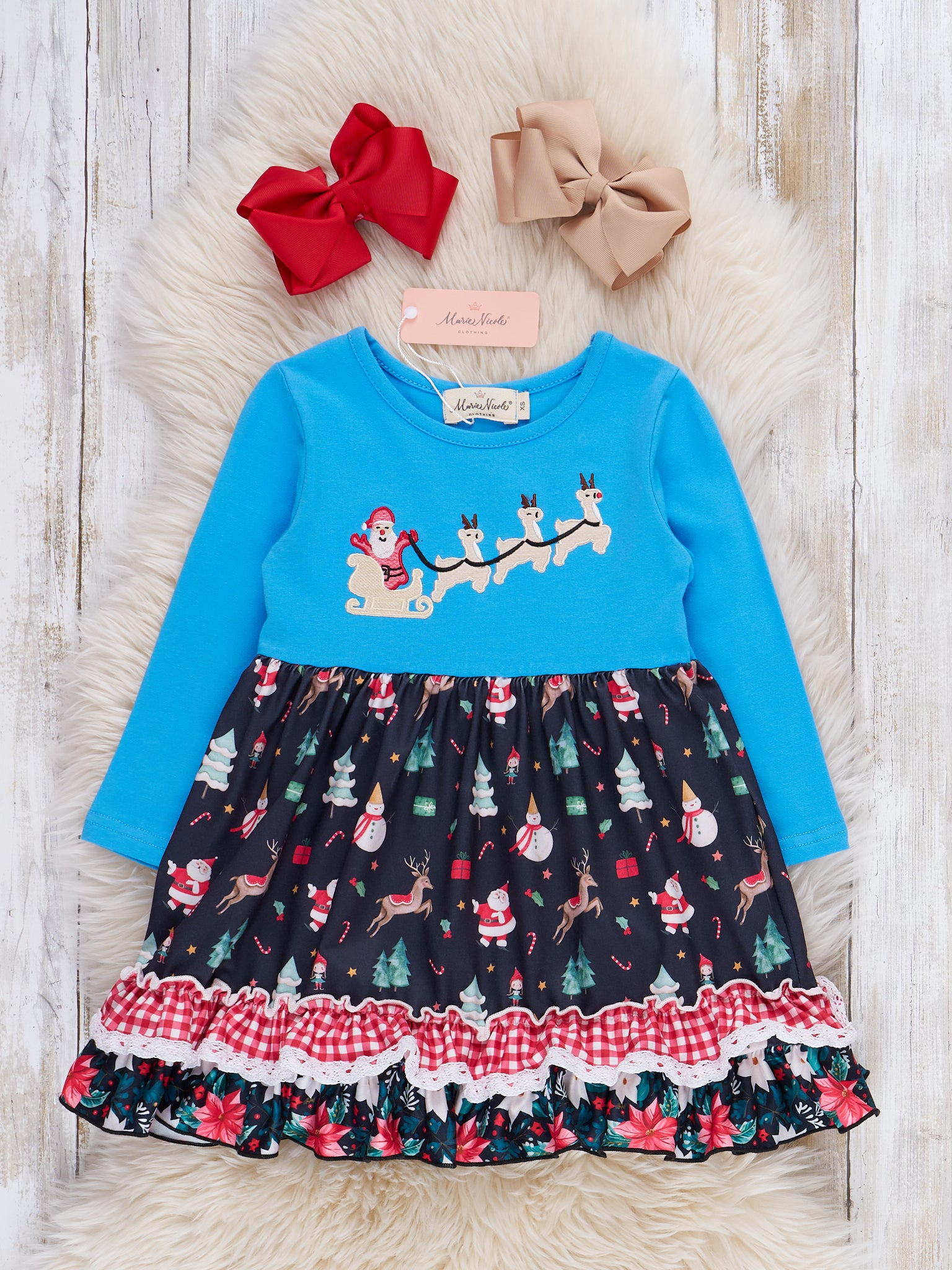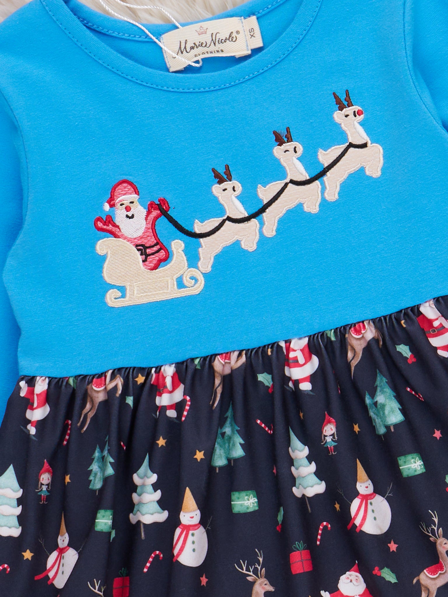 The Reindeer Night Christmas Embroidered Dress by Marie Nicole features a long-sleeve top with a charming embroidered scene of a penguin leading reindeer, paired with a gathered skirt adorned with a festive holiday print and decorative trim. This dress beautifully combines comfort and seasonal cheer for holiday celebrations.