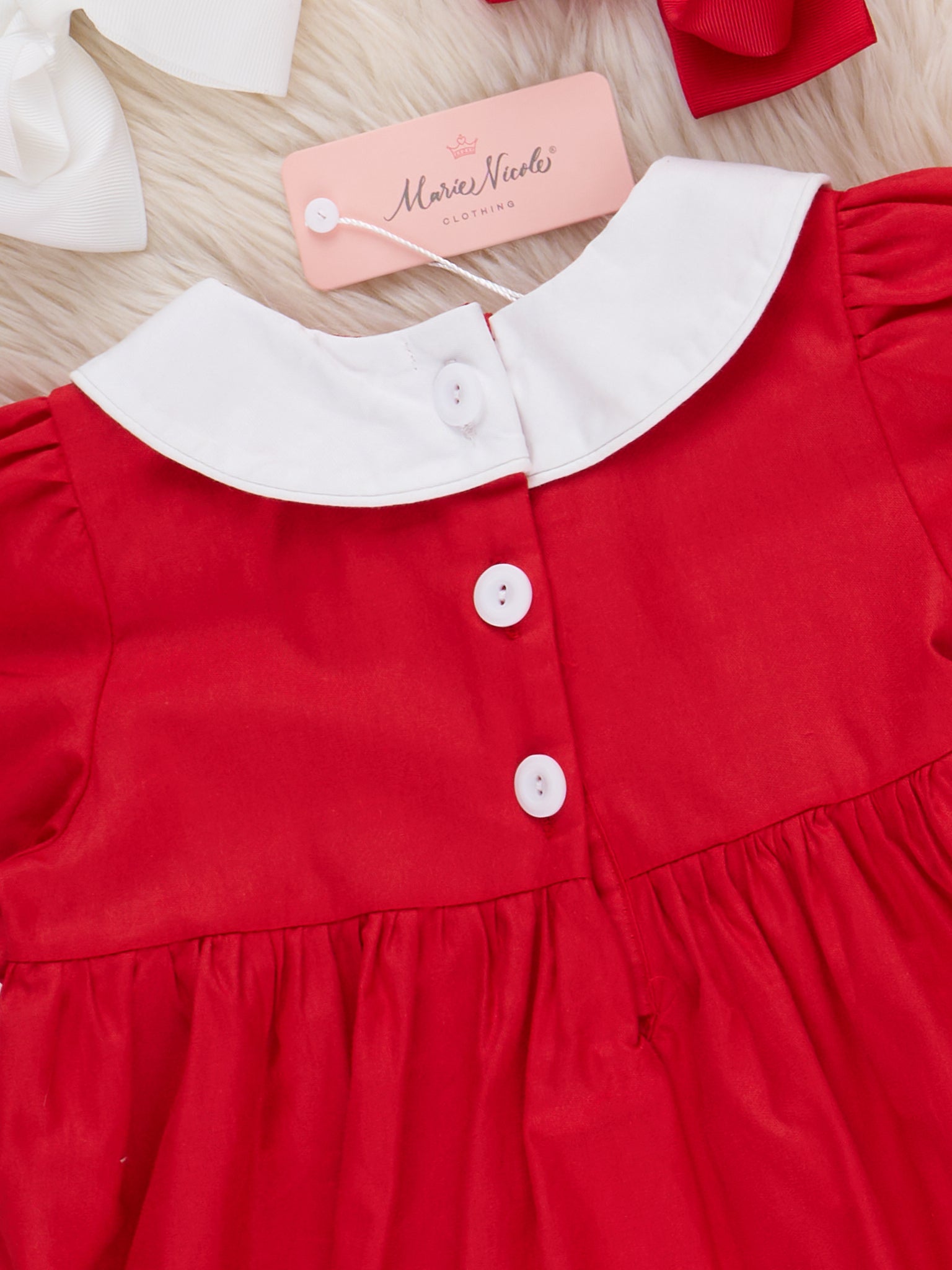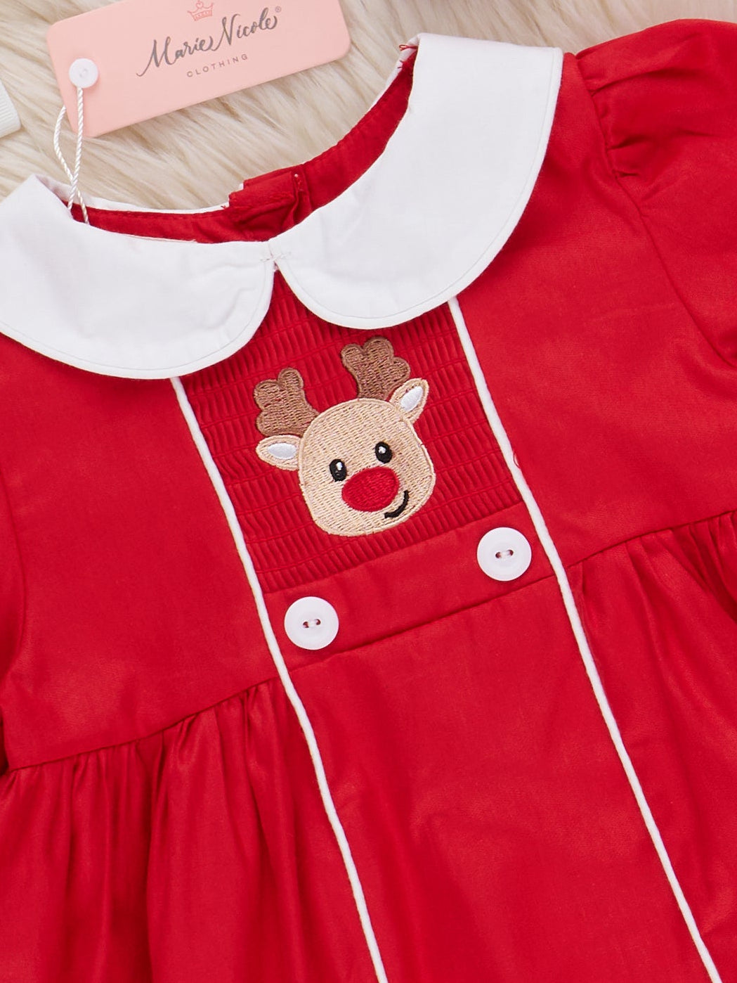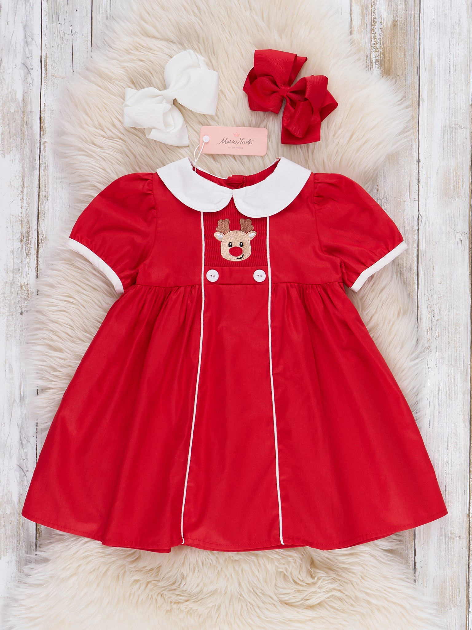 The Reindeer Visit Embroidered Poplin Dress by Marie Nicole Clothing is a festive dress featuring a sweet reindeer applique at the bodice, classic Peter Pan collar, and piped trim accents. This 100% cotton-made poplin piece blends timeless holiday style with playful details, making it perfect for seasonal celebrations and cherished photo moments.