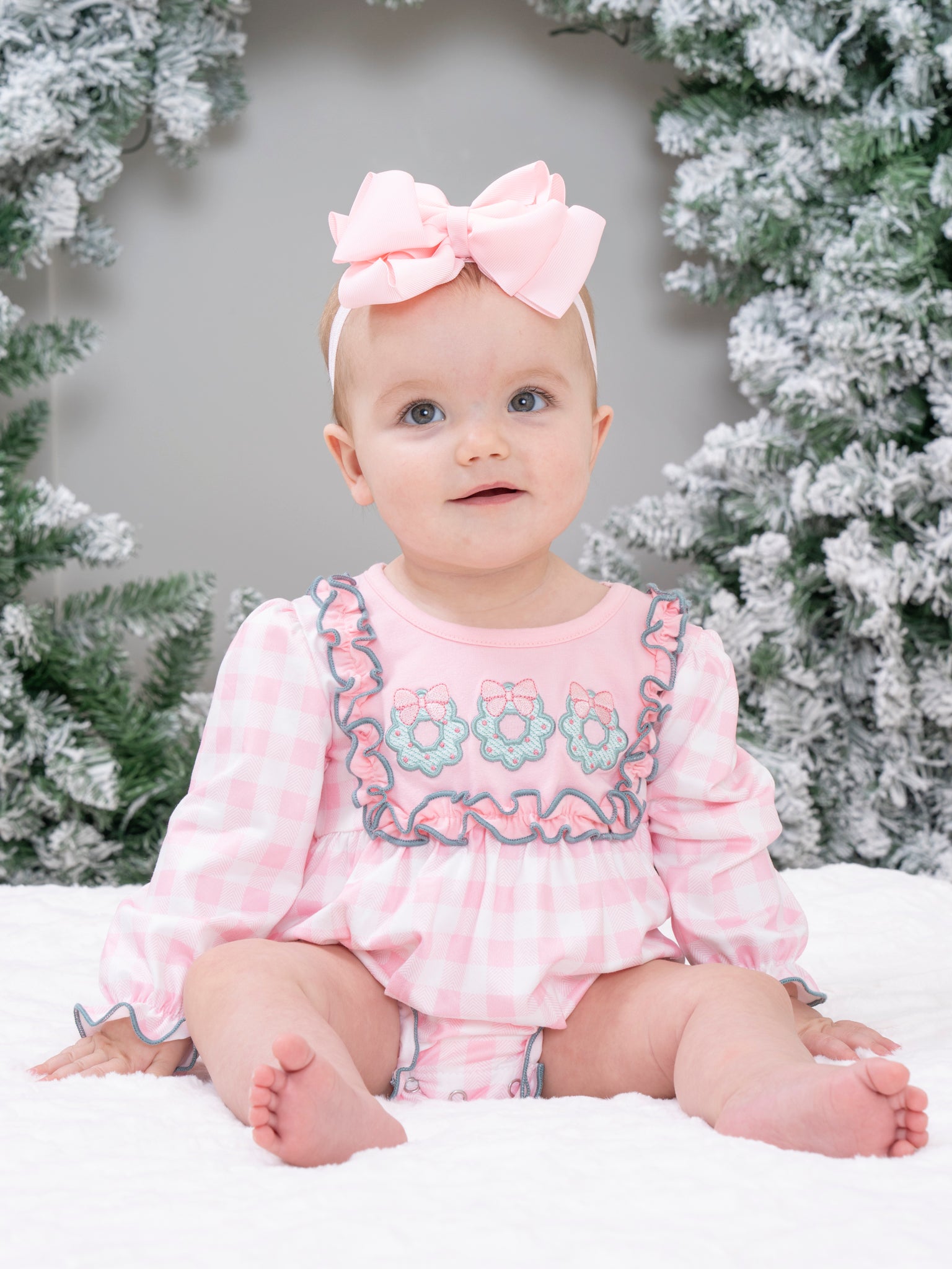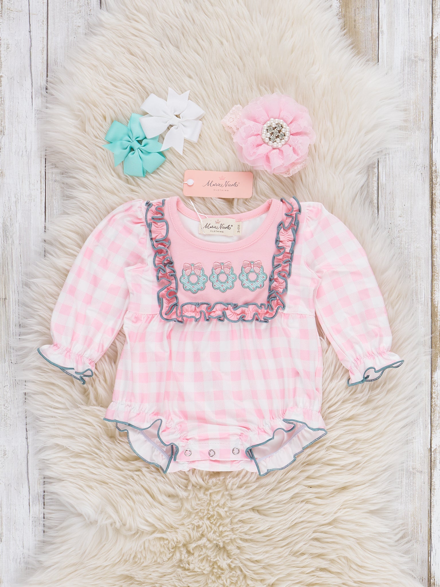The Wreathed in Love Embroidered Ruffle Bubble Romper by Marie Nicole Clothing features a sweet pink gingham pattern with delicate floral embroidery across the bodice and soft ruffle accents. Designed with long sleeves and a comfy bubble silhouette, it’s perfect for everyday play, special occasions, and capturing charming memories for little ones.