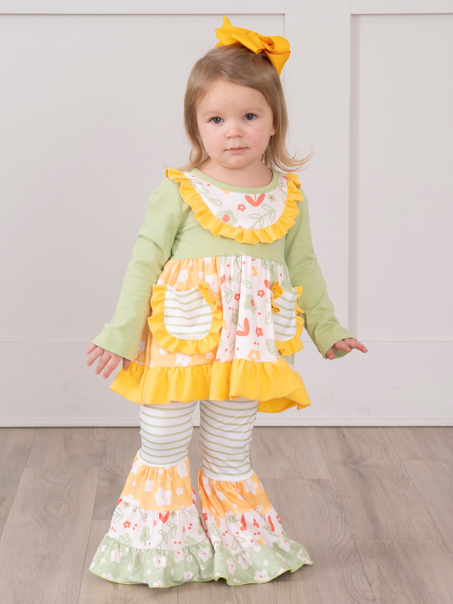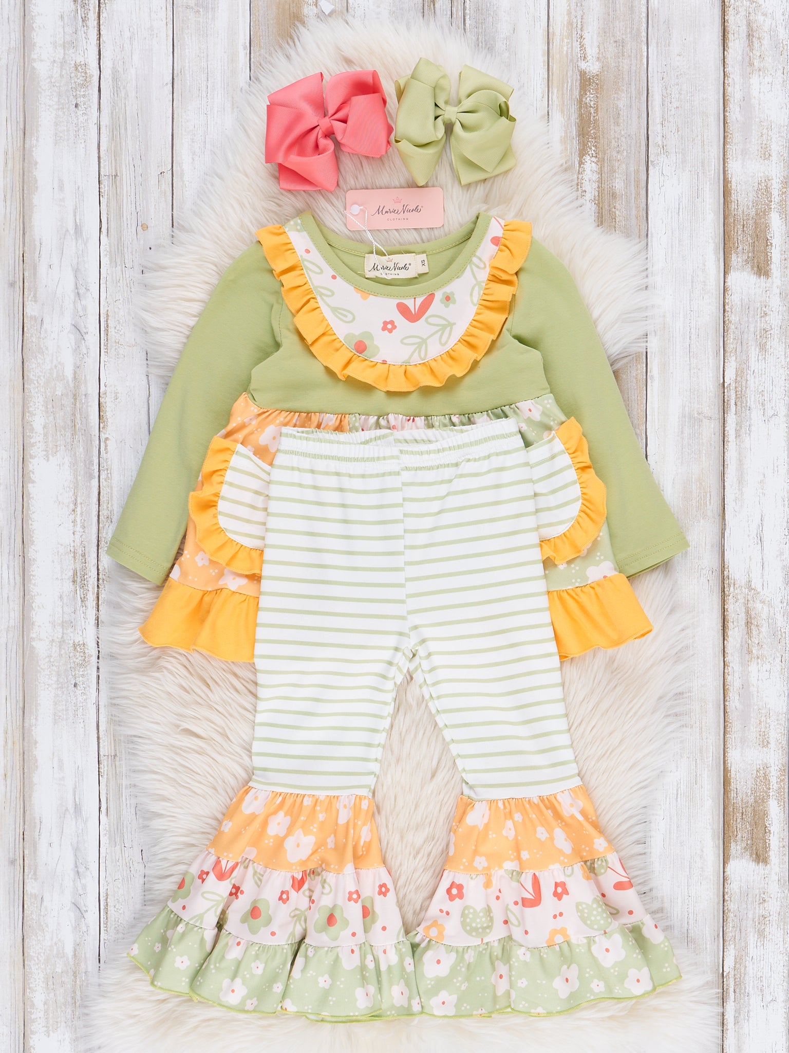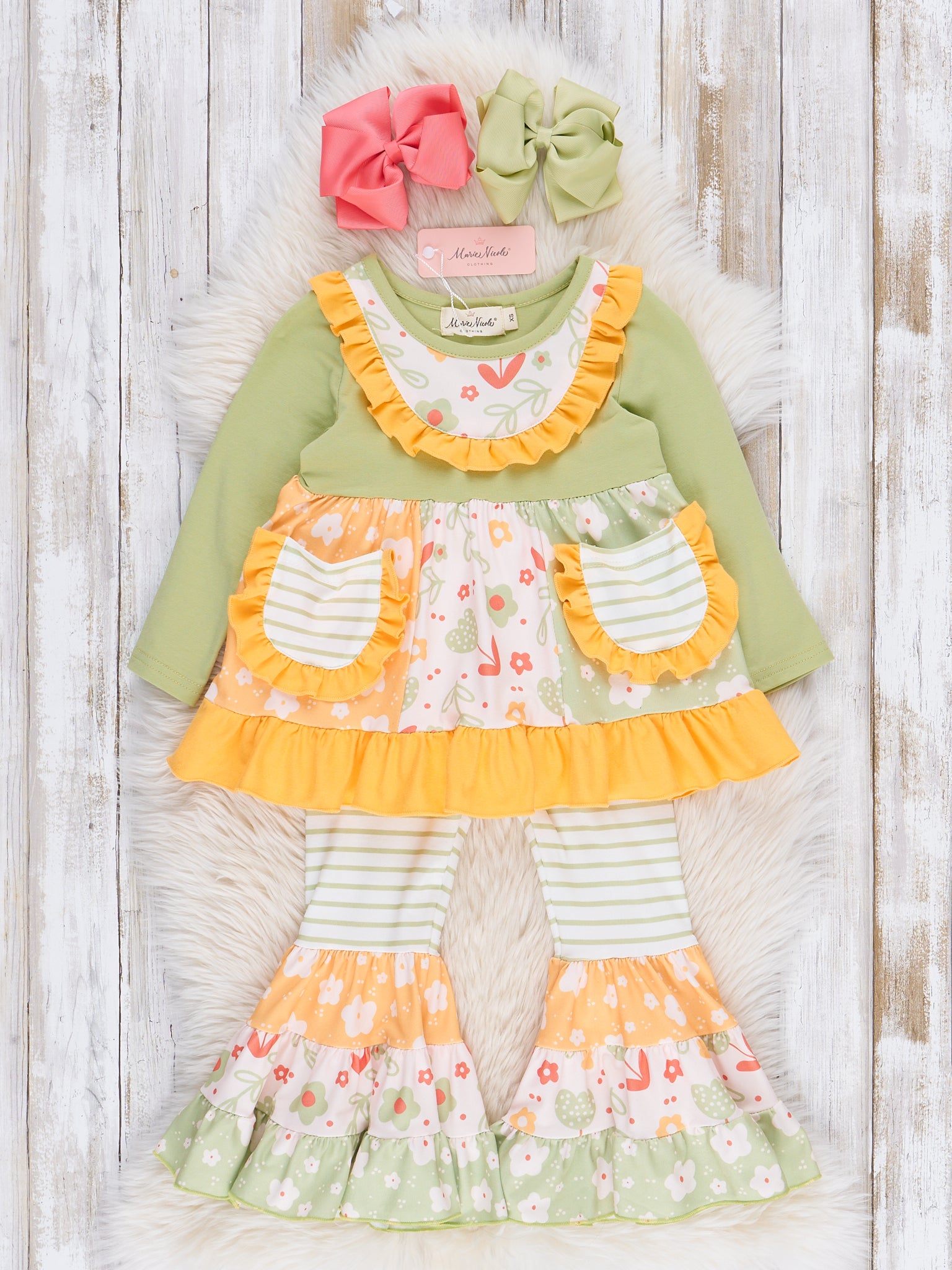 Get ready for some serious springtime fun with this cute and colorful outfit! Featuring a beautiful floral pattern, this ruffle outfit by Marie Nicole Clothing is perfect for any spring play date.