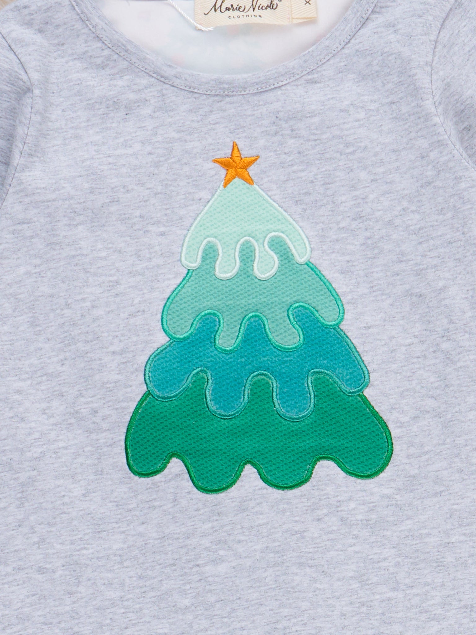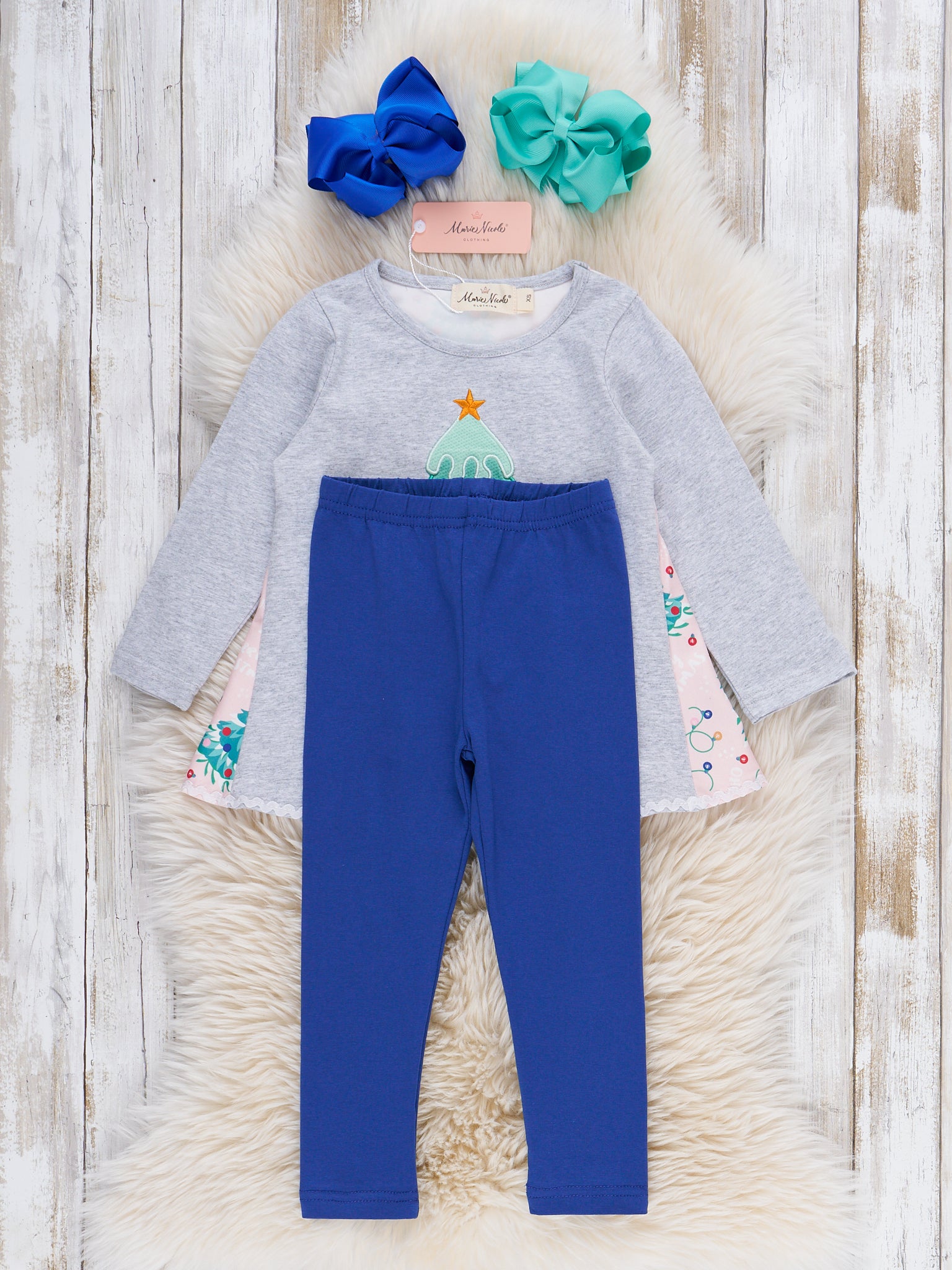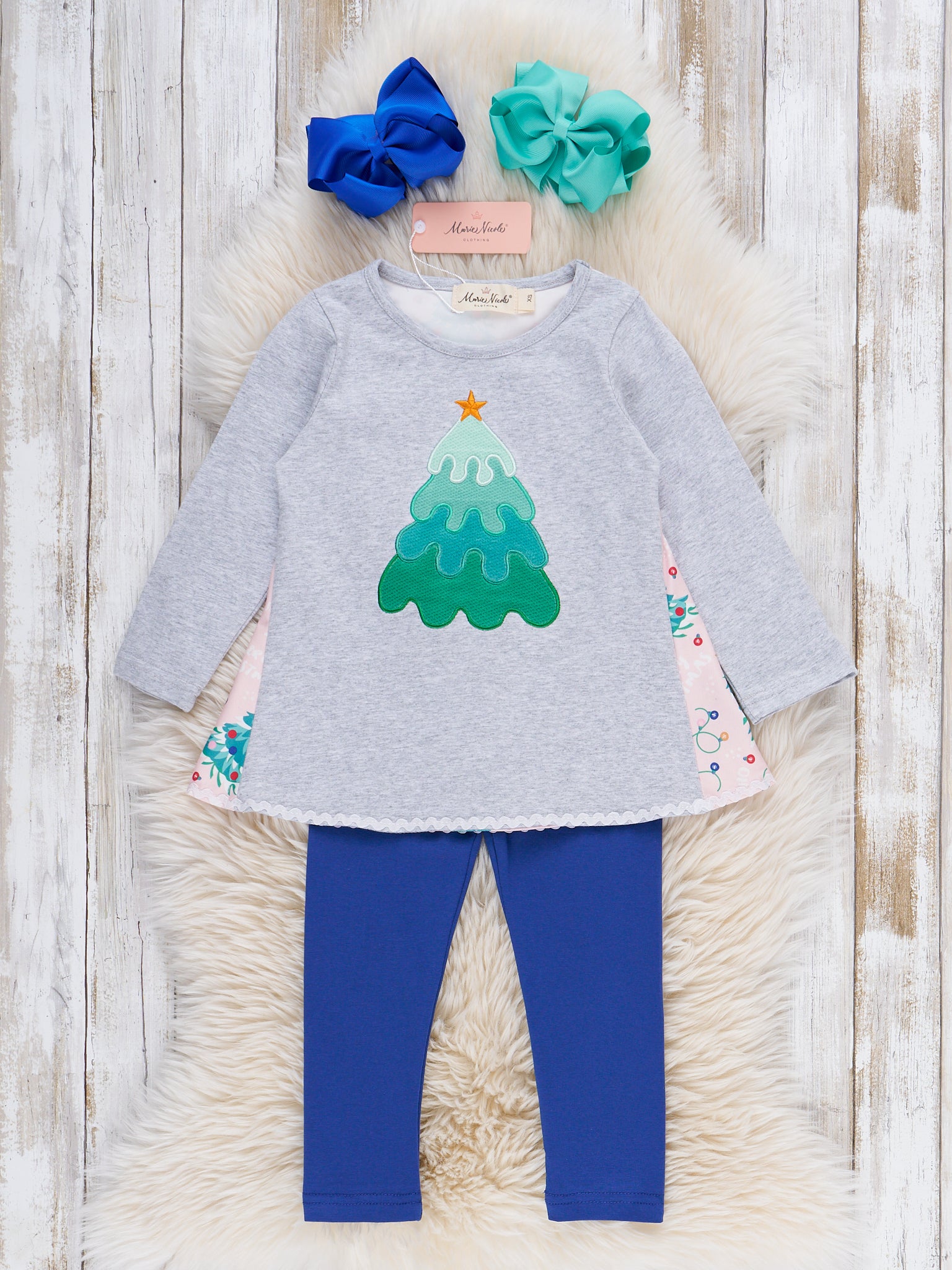 The Christmas Cheer Tree Embroidered Outfit is a festive set featuring a top with a lively embroidered tree design and solid matching leggings designed by Marie Nicole Clothing, perfect for celebrating the holiday season. This ensemble is designed for cheer, comfort, and easy movement, making it a great choice for parties, photos, and joyful family gatherings.