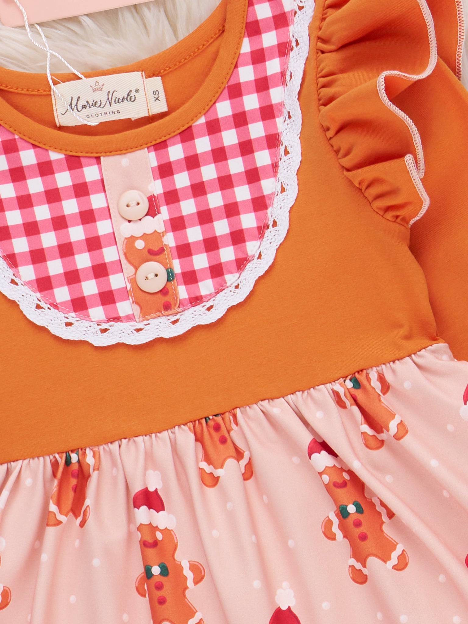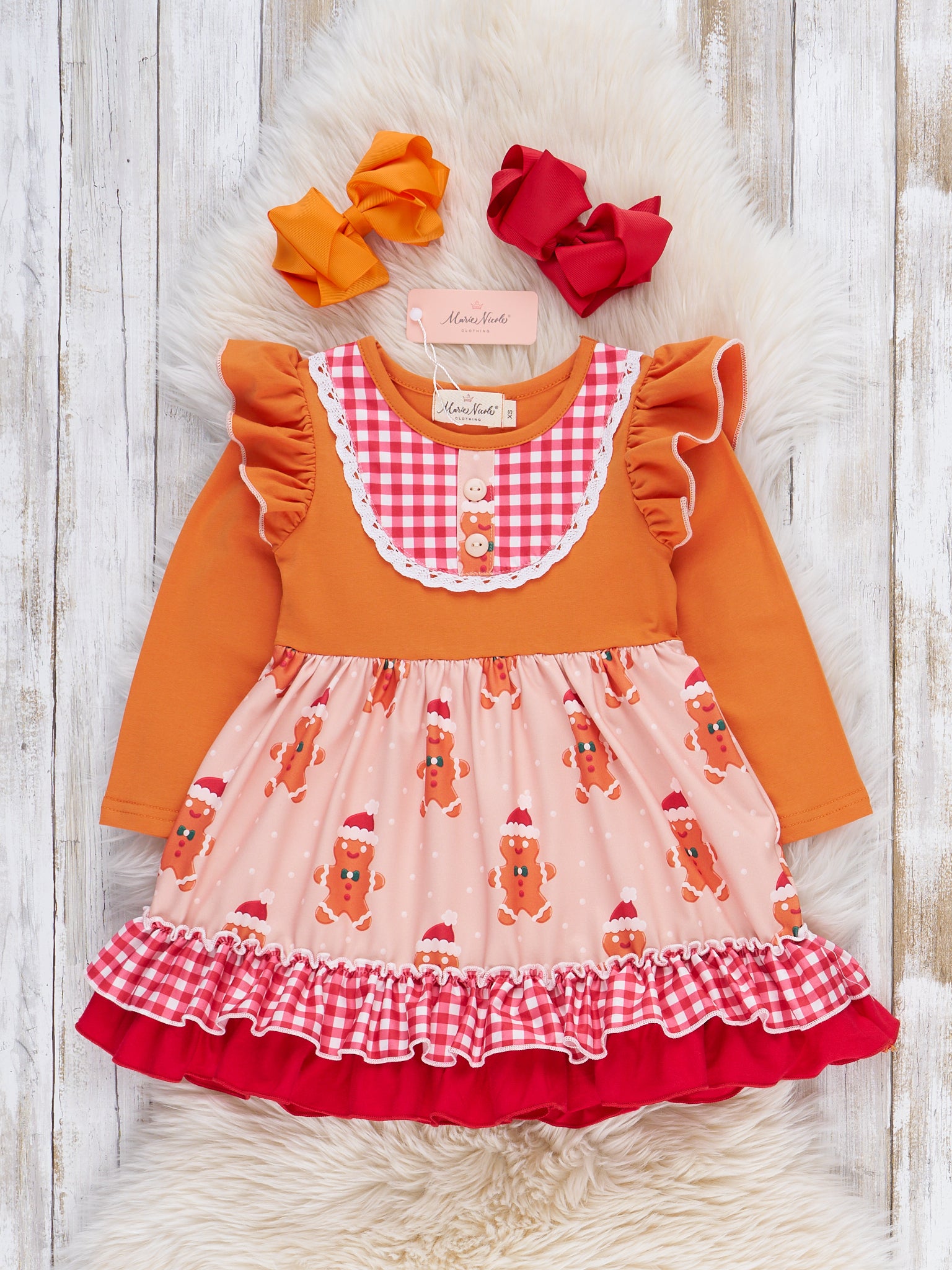 The Gingerbread Delight Plaid Ruffle Dress brings holiday joy with its charming ruffle trim, classic plaid accents, and festive gingerbread detailing across the skirt. Designed by Marie Nicole Clothing, this dress combines playful seasonal style with a comfortable fit, making it perfect for holiday celebrations, family gatherings, and creating memorable festive moments.