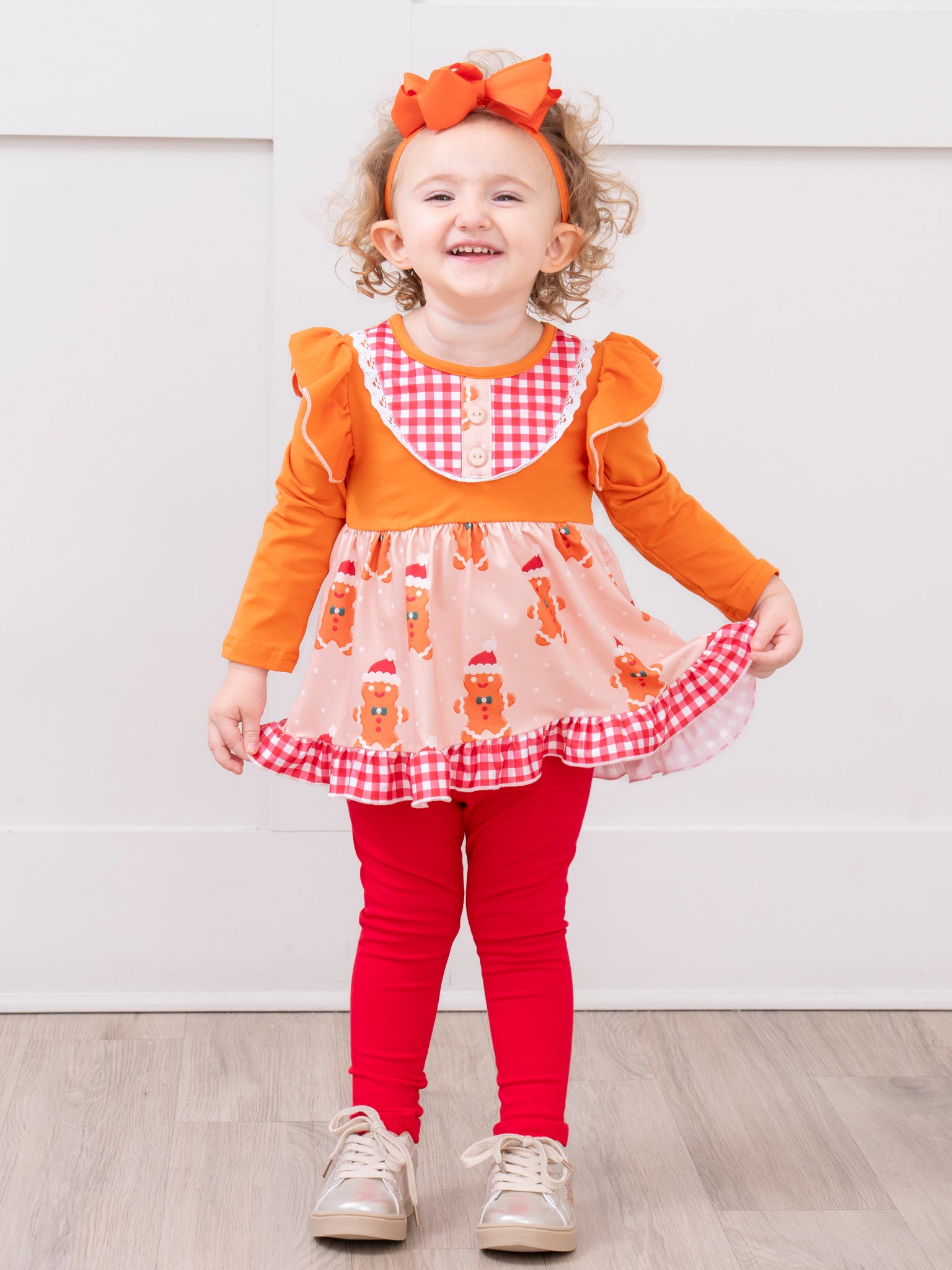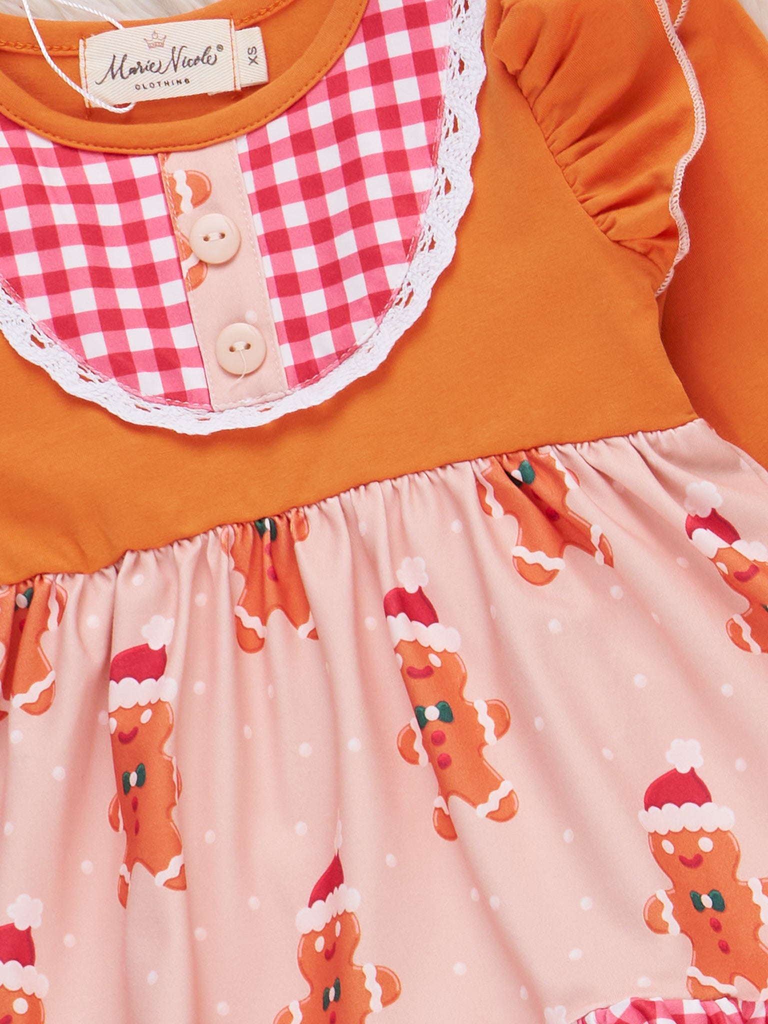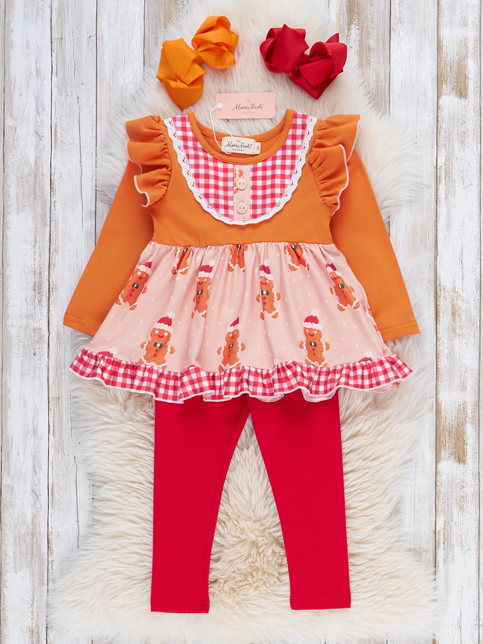 The Gingerbread Delight Plaid Ruffle Outfit features playful ruffle accents, a delightful plaid trim, and a sweet gingerbread motif, making it perfect for holiday celebrations. From Marie Nicole Clothing, this charming set brings together whimsical seasonal patterns and a comfortable fit, ensuring joyful style and ease for festive gatherings and everyday cheer.