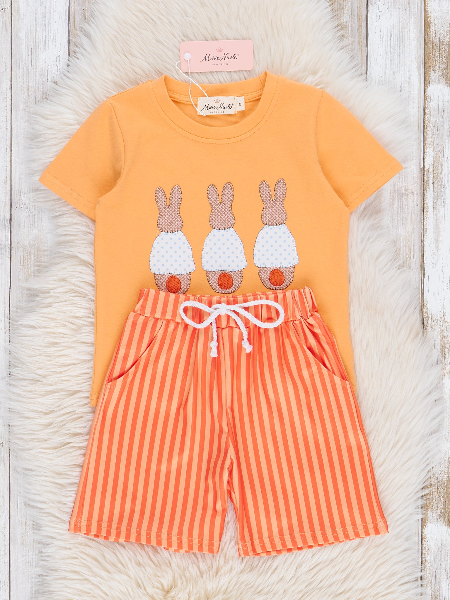 A beautiful sibling set for your little bunnies! This outfit by Marie Nicole Clothing features an orange top with sweet bunny appliqués & striped shorts with an elastic waistband.