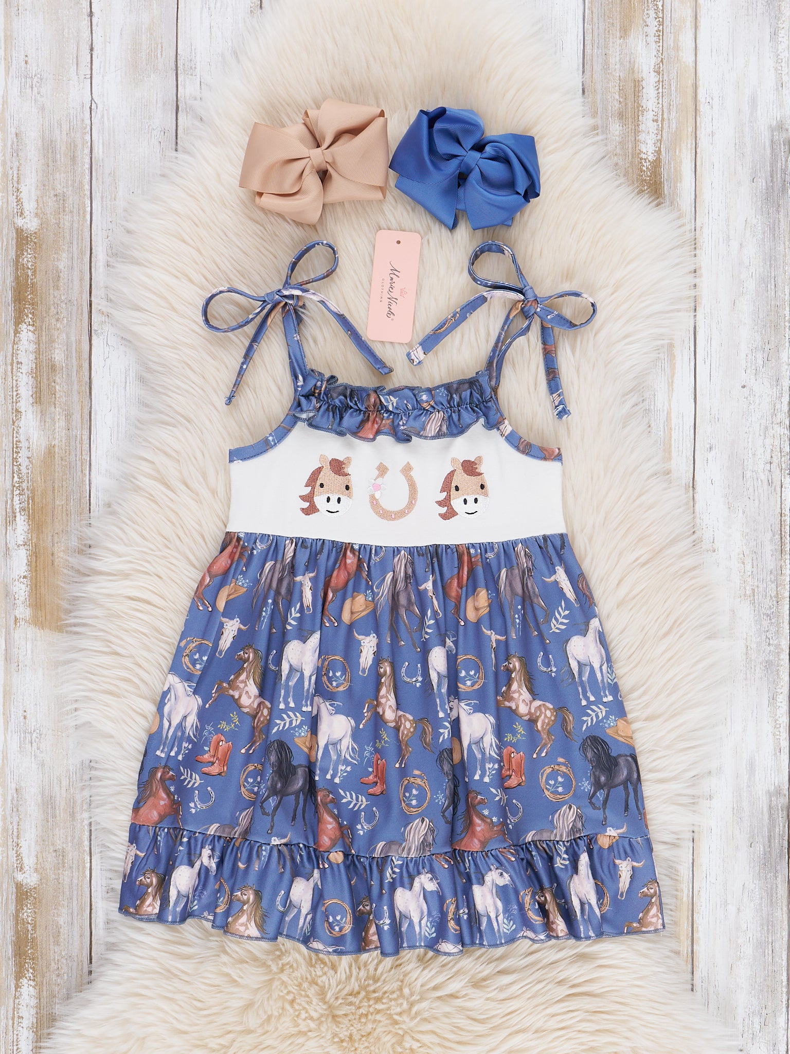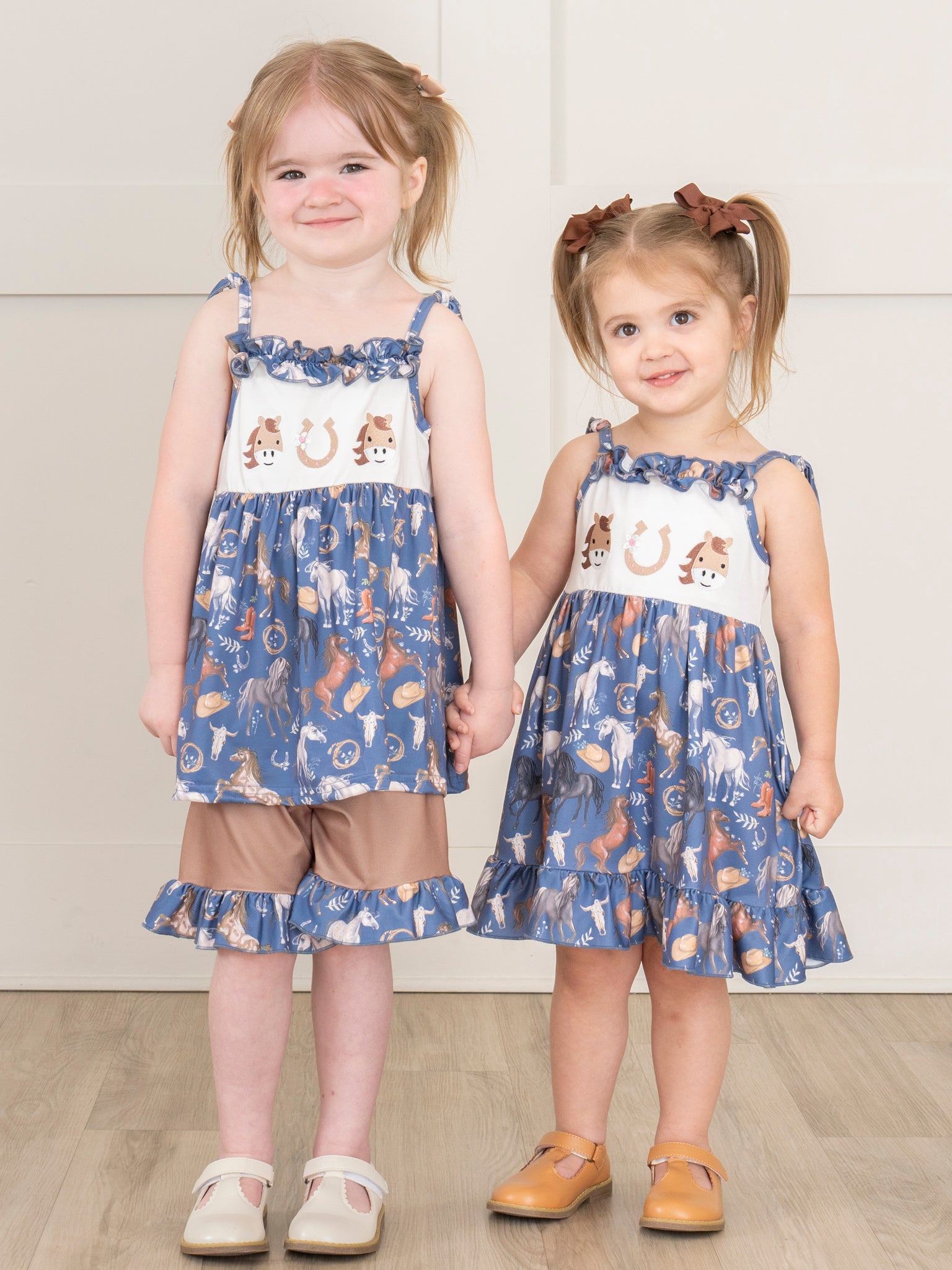This darling sister set will give your girls all the horsepower they need to get through the day! This steel blue dress features embroidered horses, tie straps, ruffles, & a darling horse print.