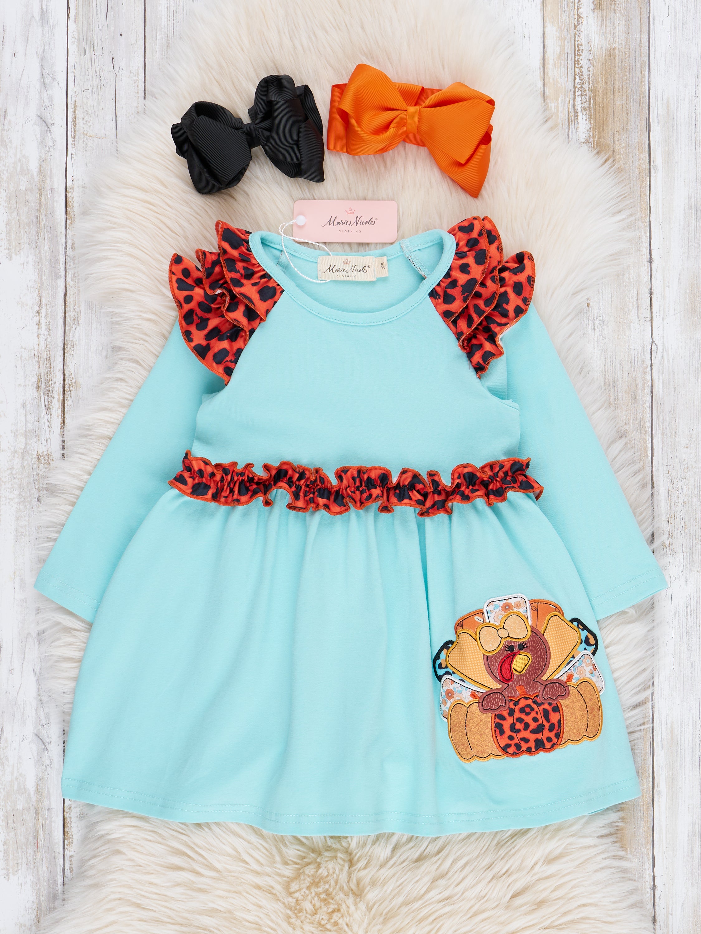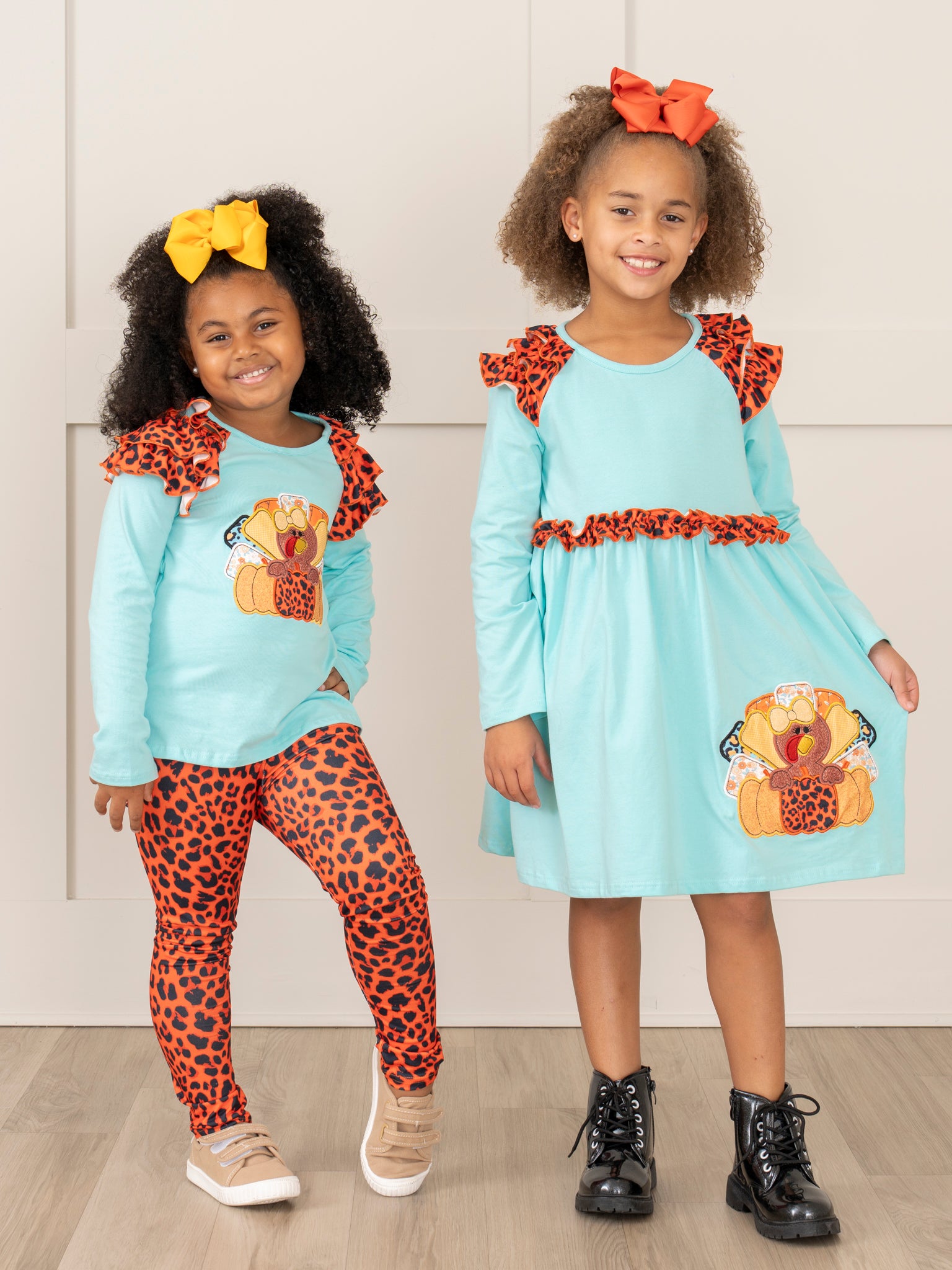 Aqua & Leopard Embroidered Turkey Sibling Set