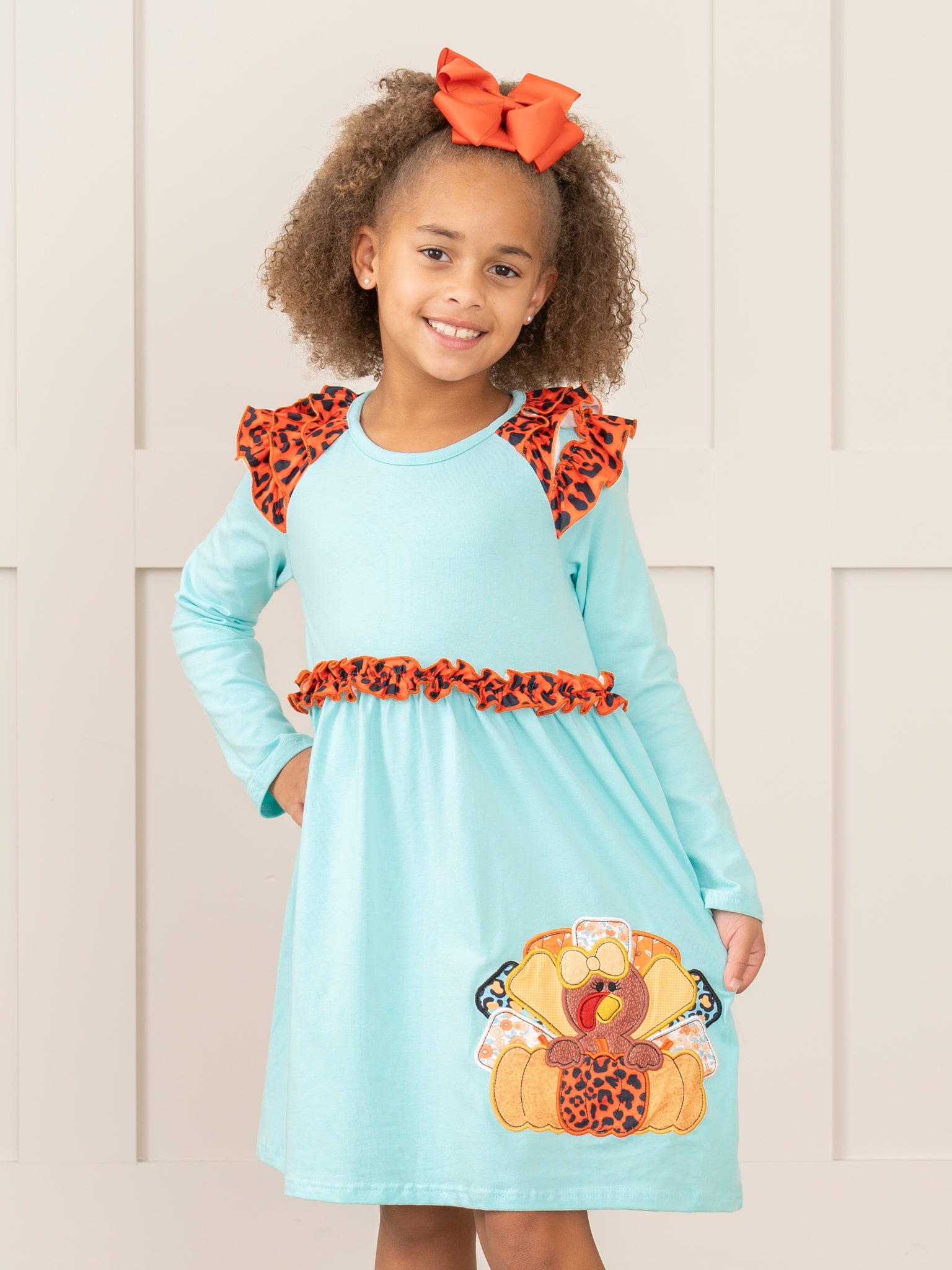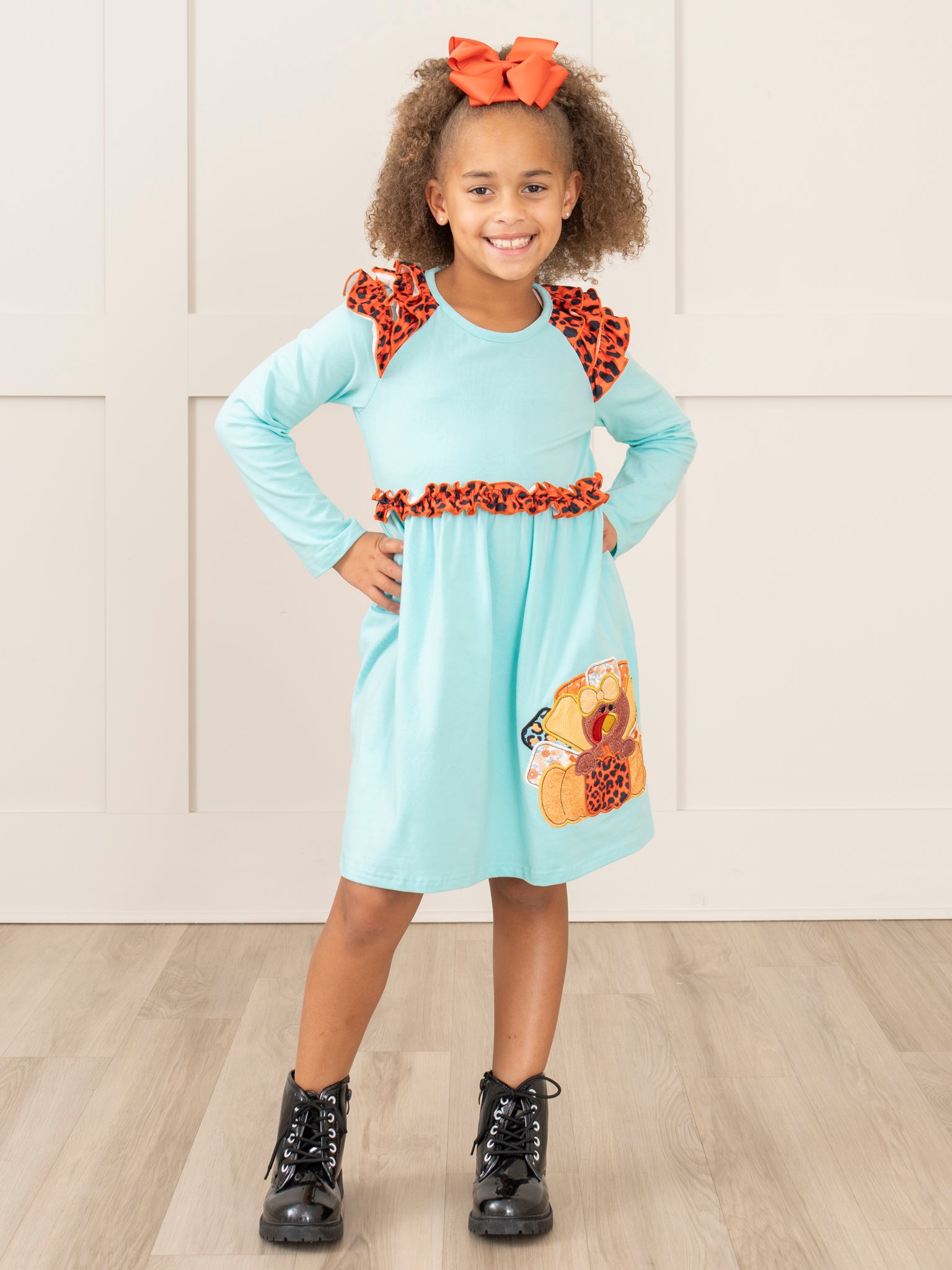 Aqua & Leopard Embroidered Turkey Ruffle Dress