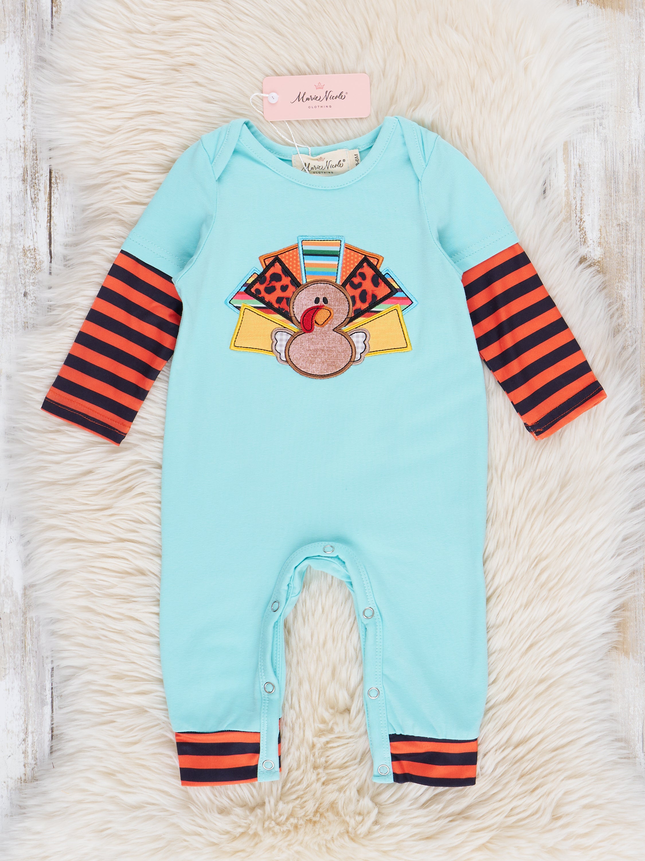Aqua & Leopard Embroidered Turkey Ruffle Romper