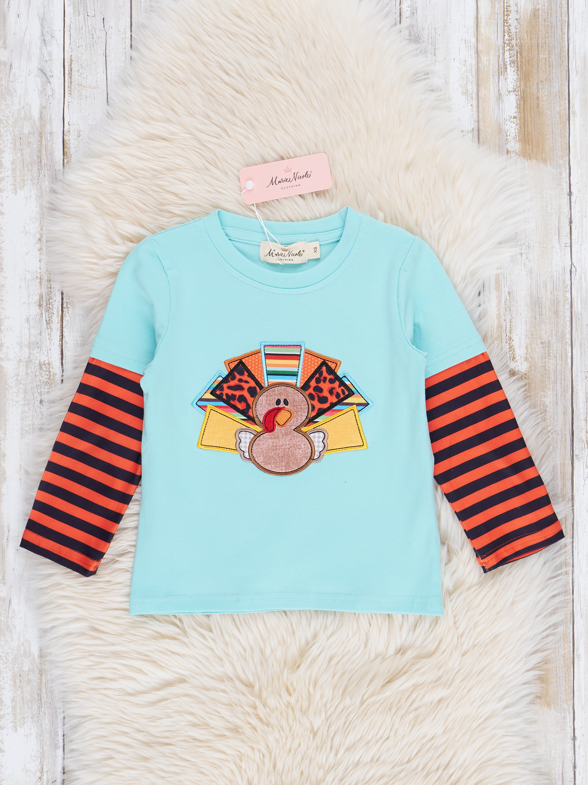 Aqua Embroidered Turkey Striped Raglan Shirt