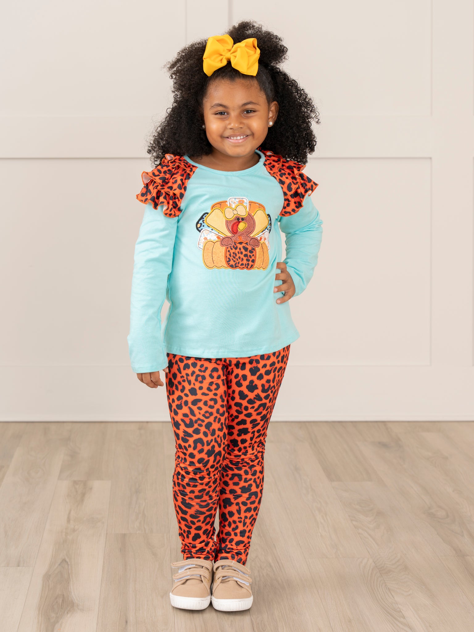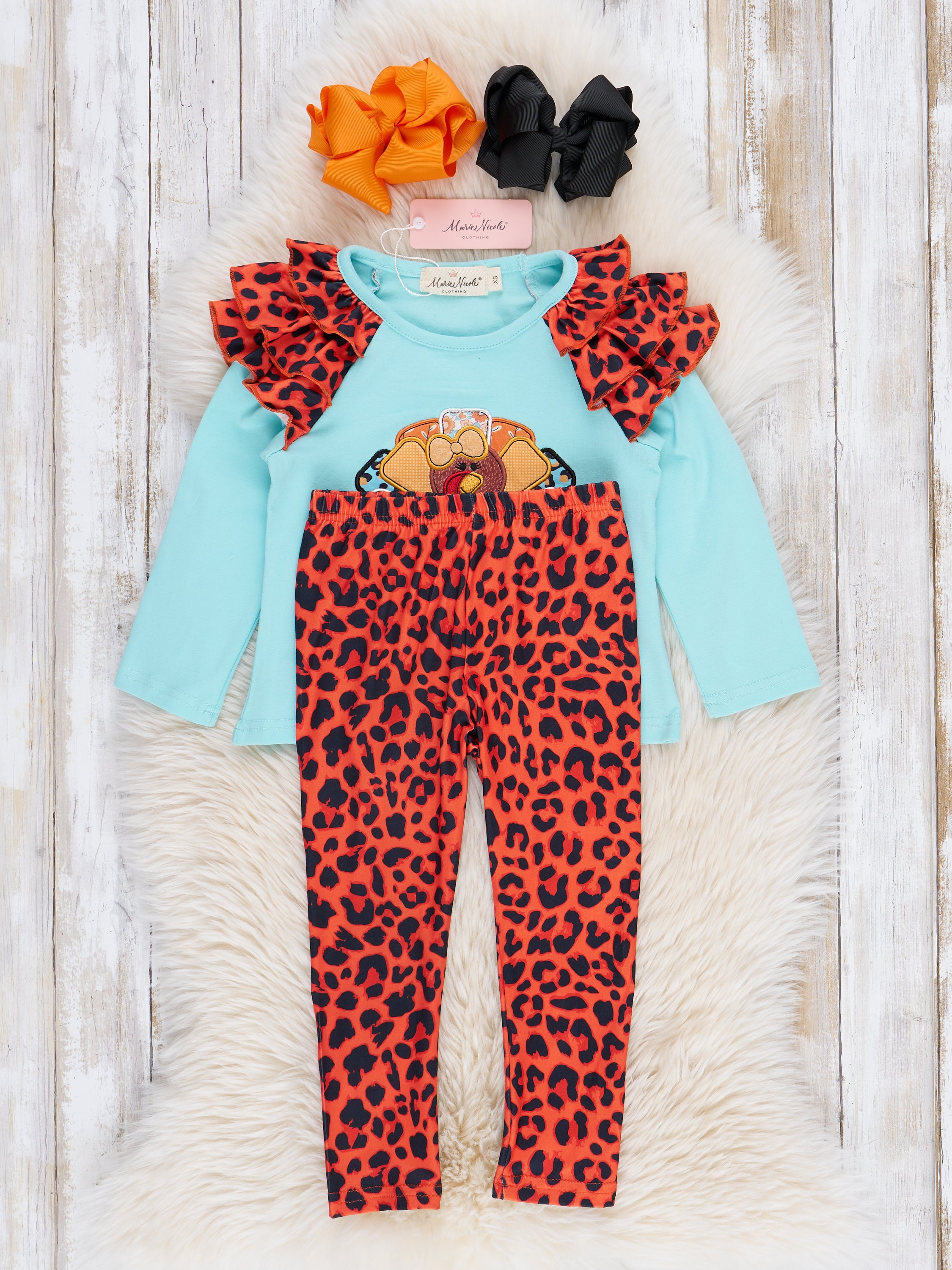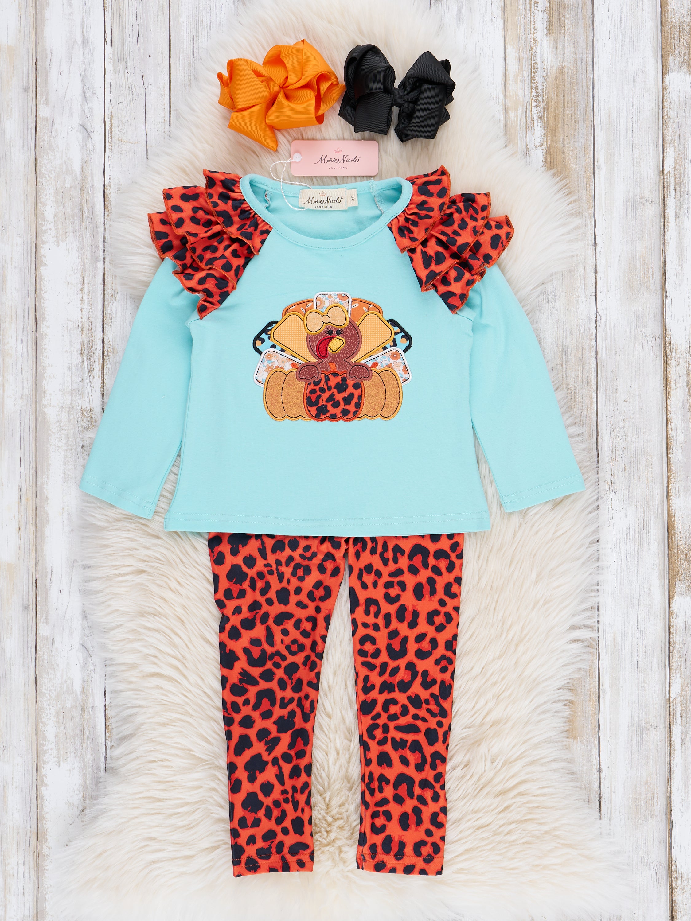Aqua & Leopard Embroidered Turkey Ruffle Outfit
