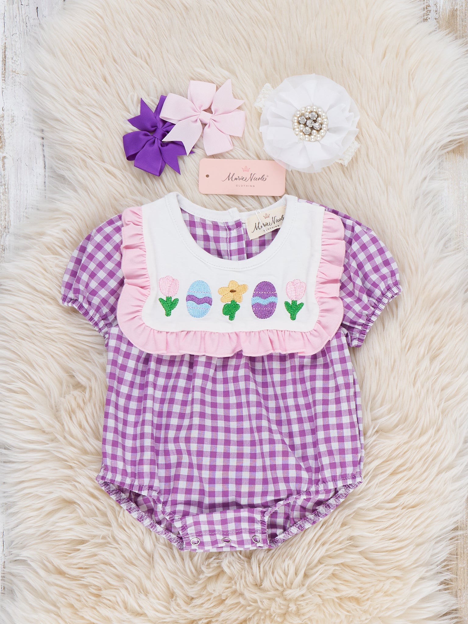 Bunny Lineup Gingham Embroidered Ruffle Bubble Romper