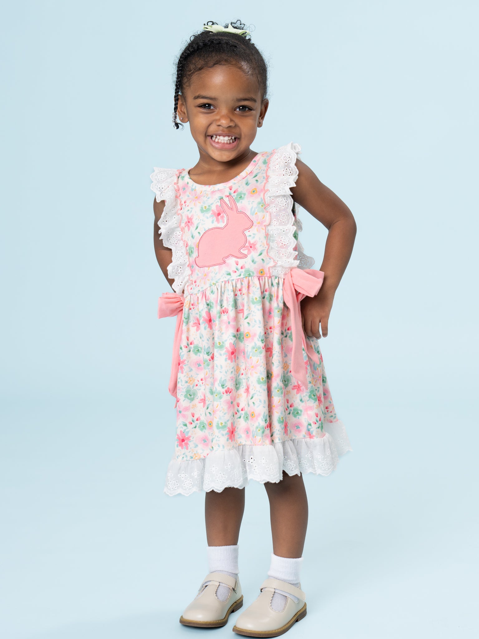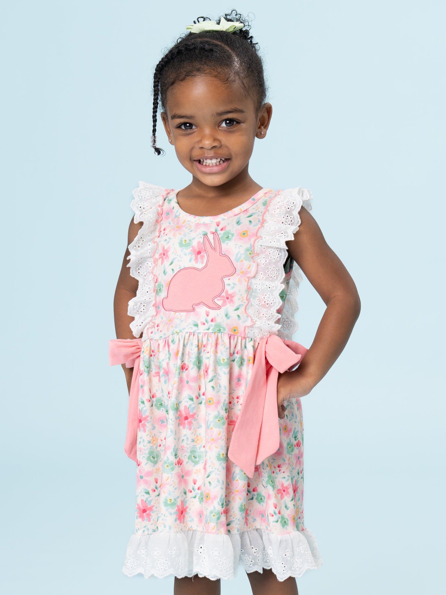 Bunny Bloom Embroidered Ruffle Dress by Marie Nicole Clothing features a sweet bunny appliqué, floral pattern, and soft ruffle trim. The dress is finished with playful side bow sashes and a delicate lace hem, creating a picture-perfect look for spring celebrations, Easter festivities, or any cheerful day of twirling and play.