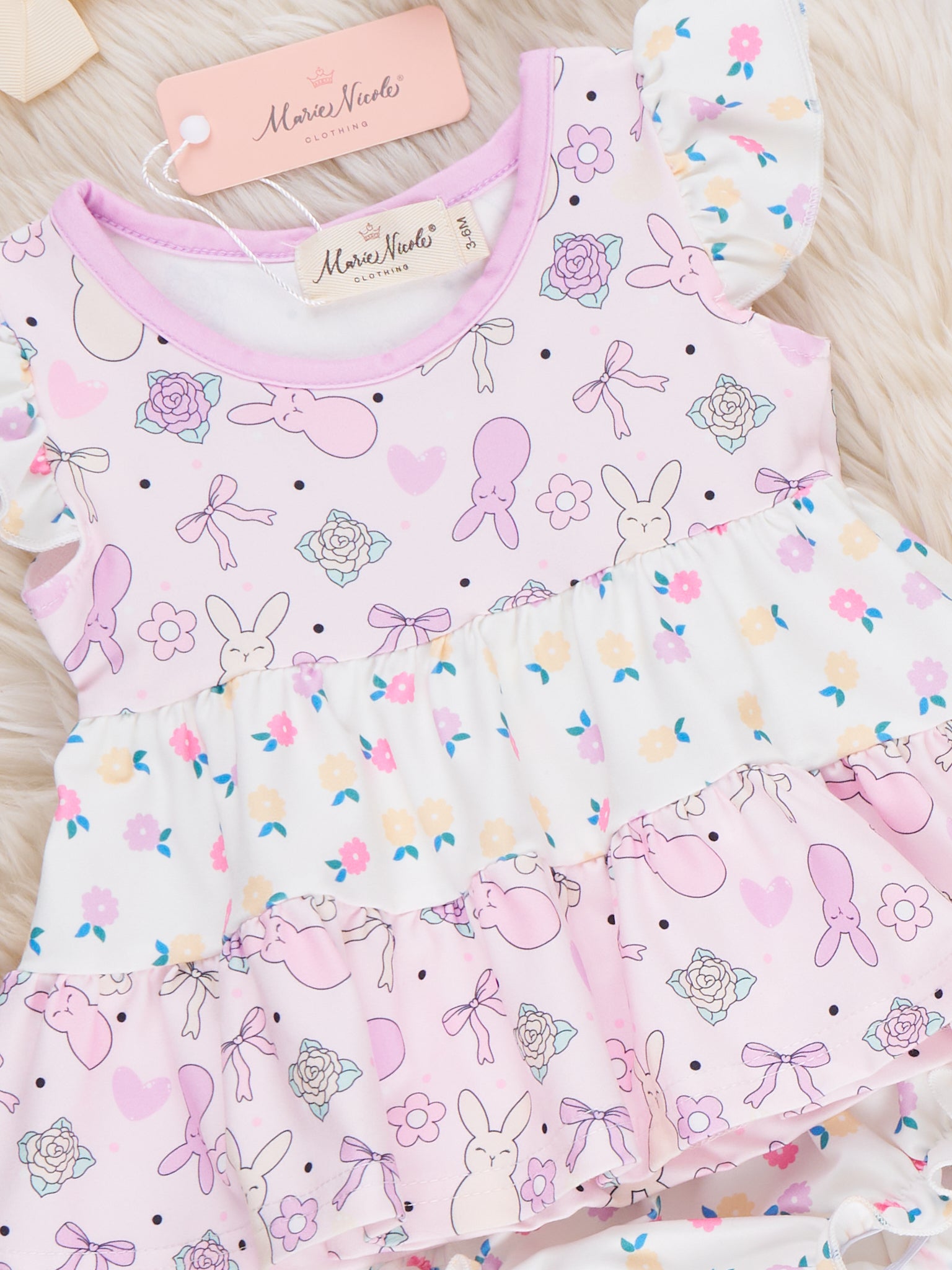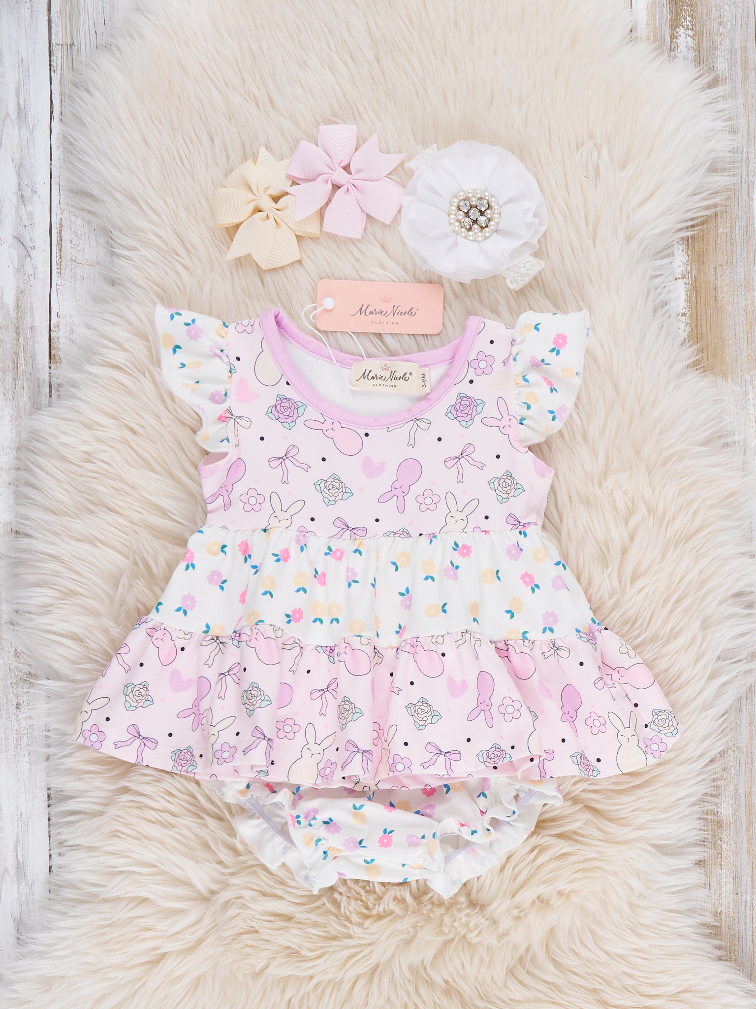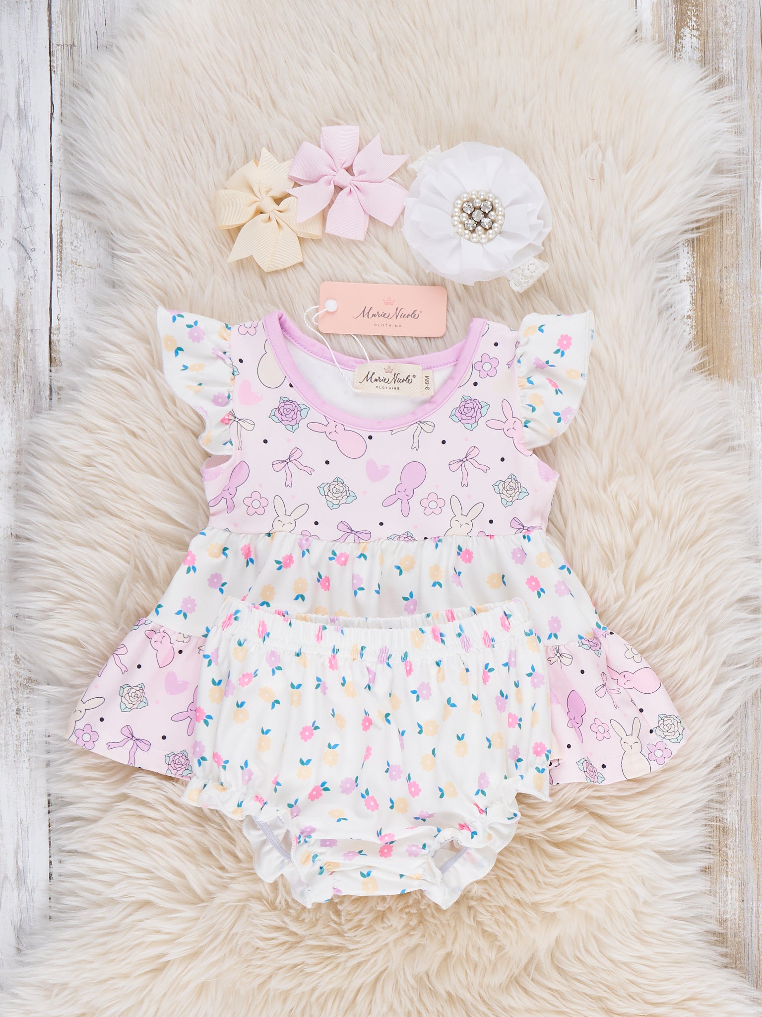 Bunny Blossom Layers Bloomers Outfit by Marie Nicole Clothing is a sweet two-piece set with a tiered flutter-sleeve top in a bunny-and-floral print and coordinating bloomer bottoms. The soft, twirly layers and gently elasticized bloomers keep little ones comfy and picture-ready for Easter, spring parties, and sunny playdates.