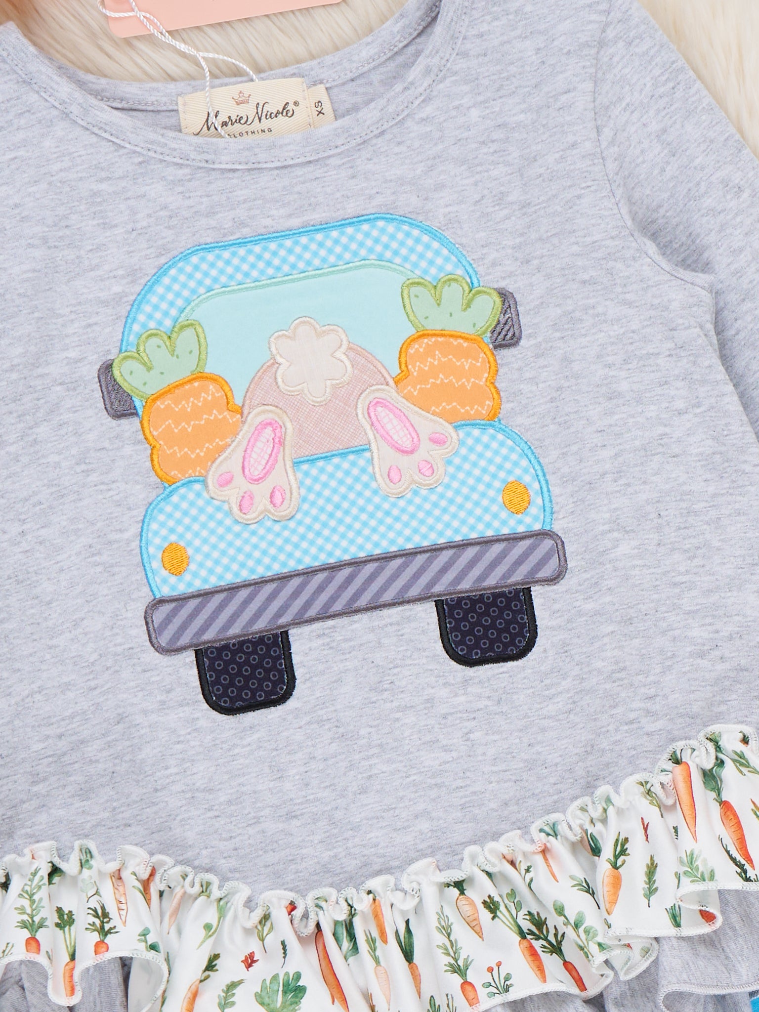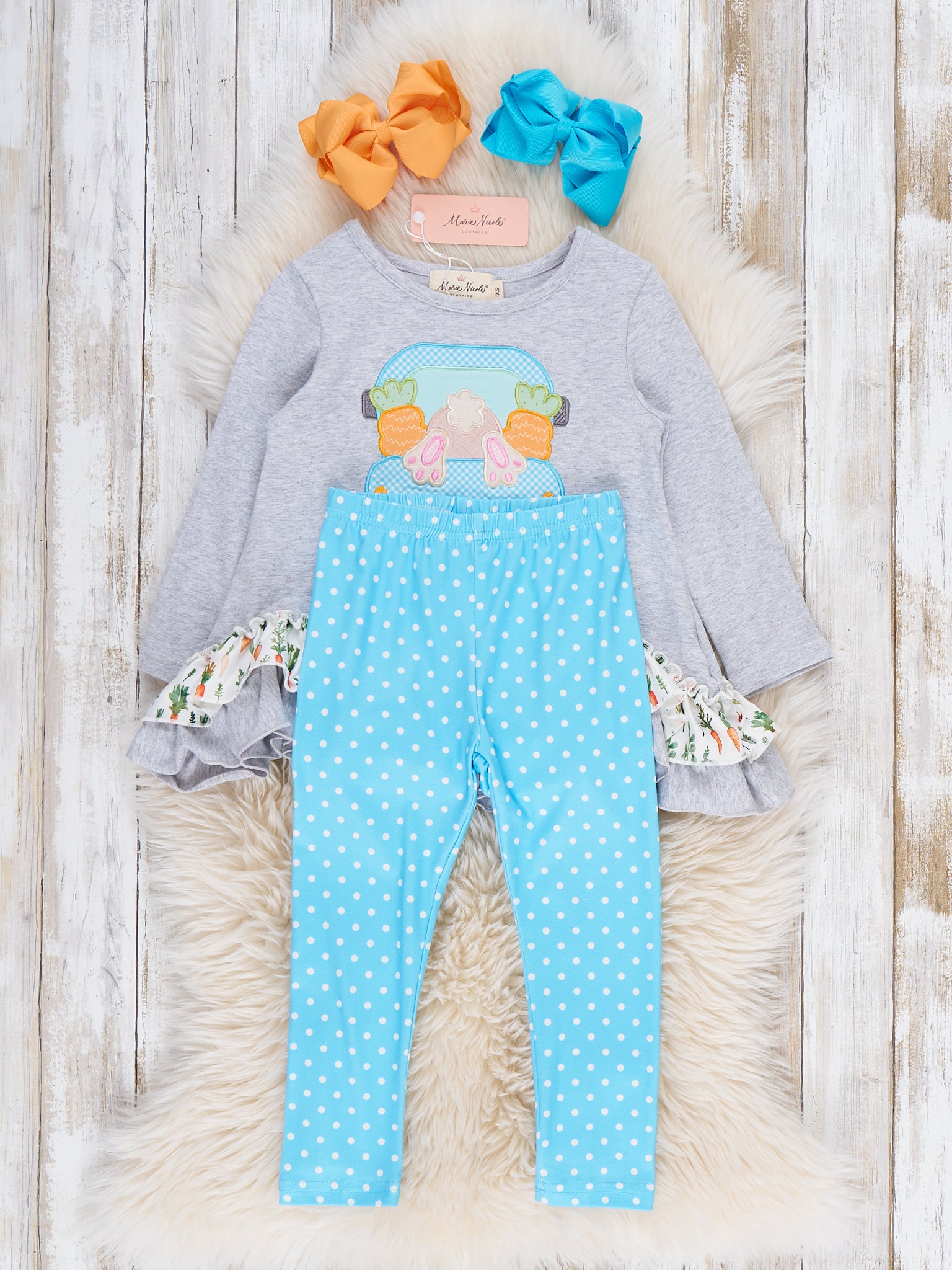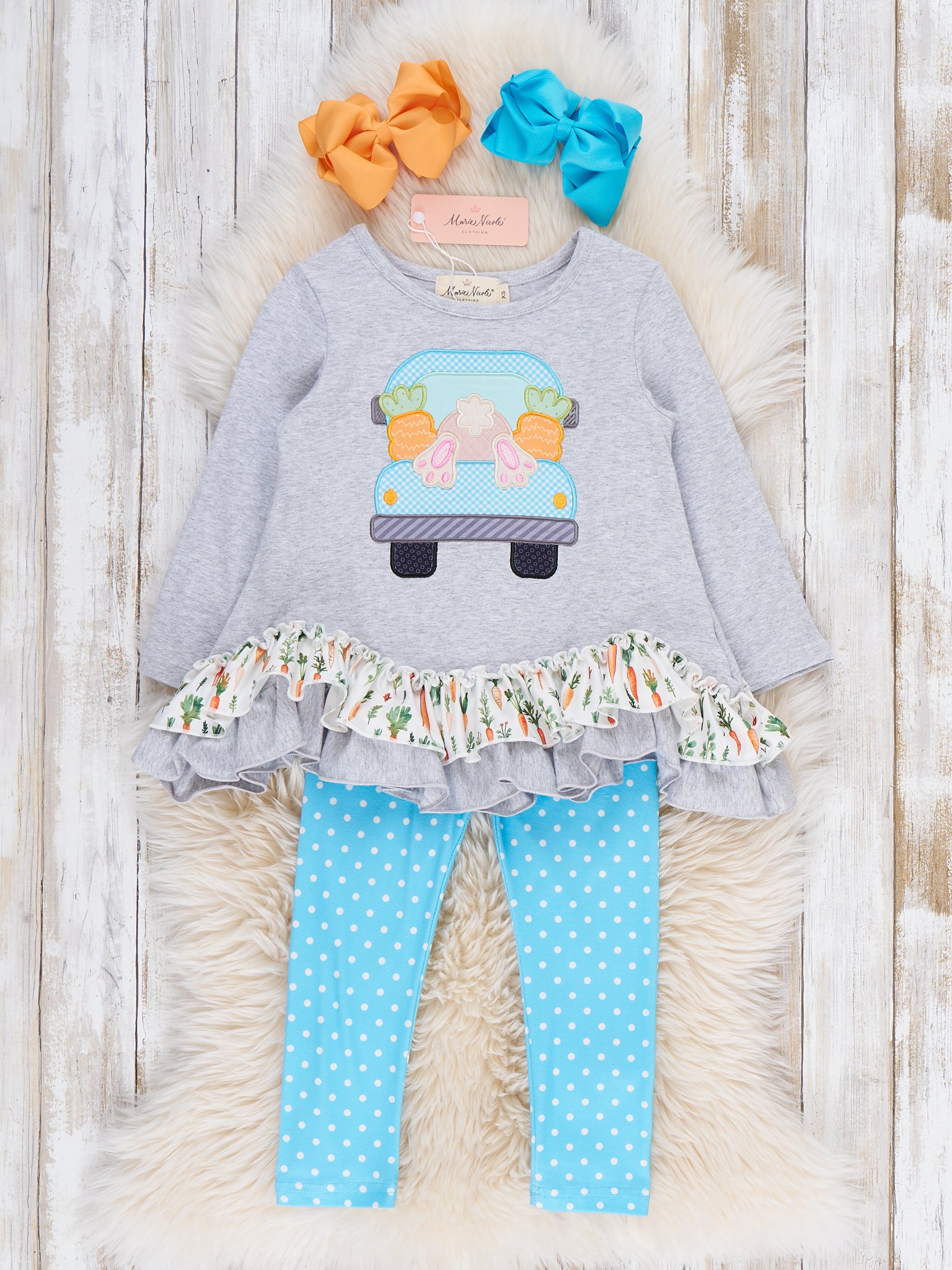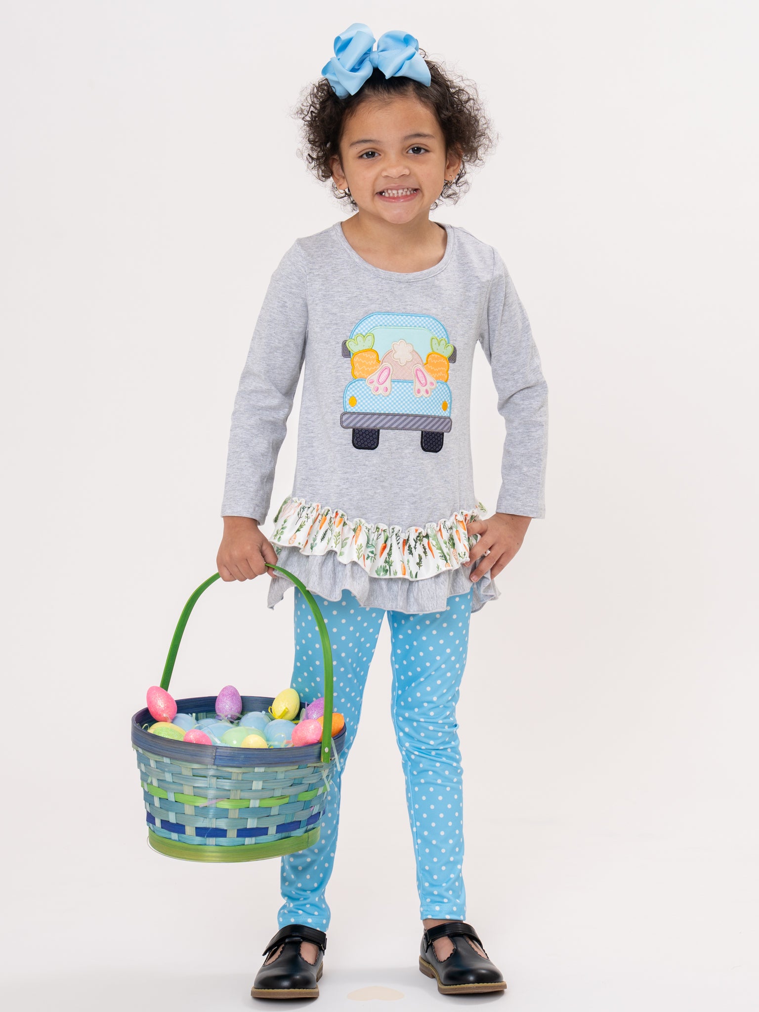 The Bunny Joyride Embroidered Ruffle Outfit by Marie Nicole Clothing pairs a long-sleeve peplum top featuring a cheerful car-and-bunny applique with coordinating polka dot leggings. A ruffled hem with printed trim adds extra bounce and charm to every step. Soft, stretchy fabrics keep little ones comfy for playdates, errands, and festive spring outings in playful holiday style.