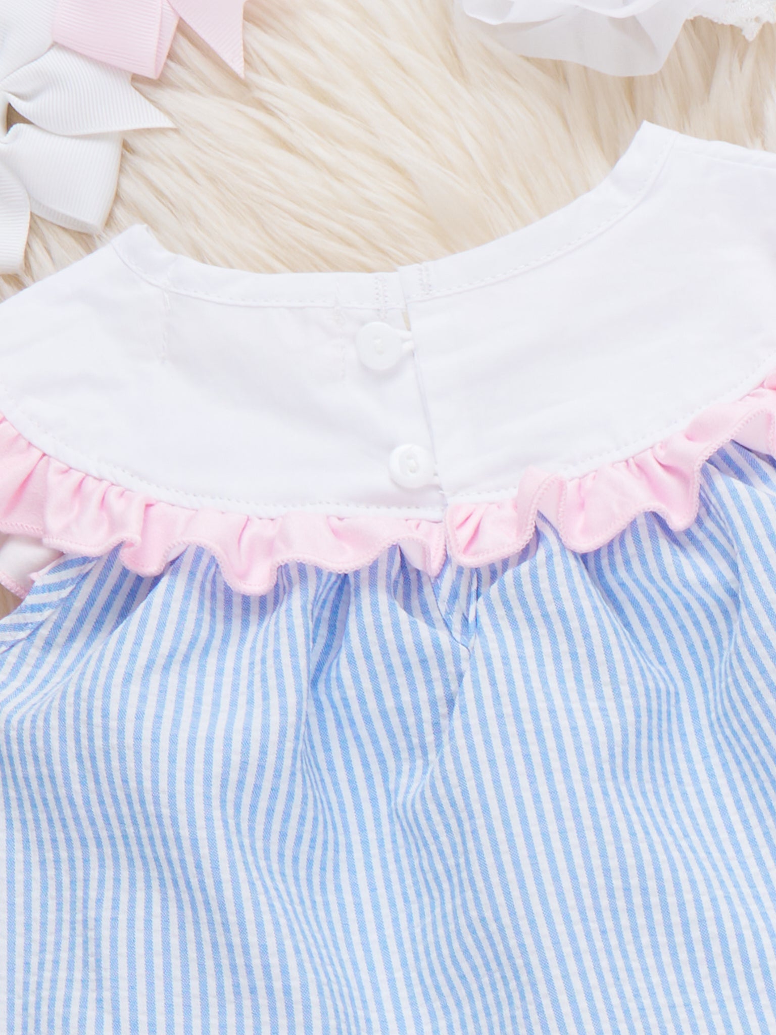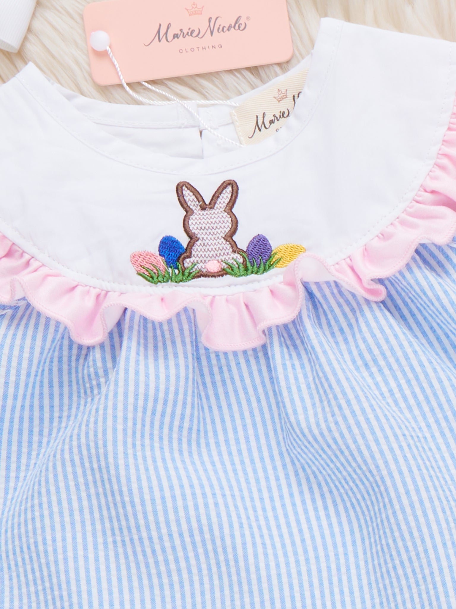 This Bunny Vintage Embroidered Poplin Bloomers Outfit is perfect for your dainty girls! This outfit by Marie Nicole Clothing features a striped top with a white round neckline, an embroidered bunny, ruffle trim, & matching bloomers with an elastic waistband.