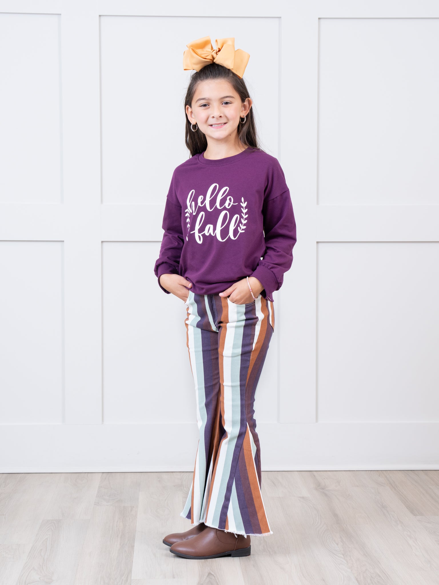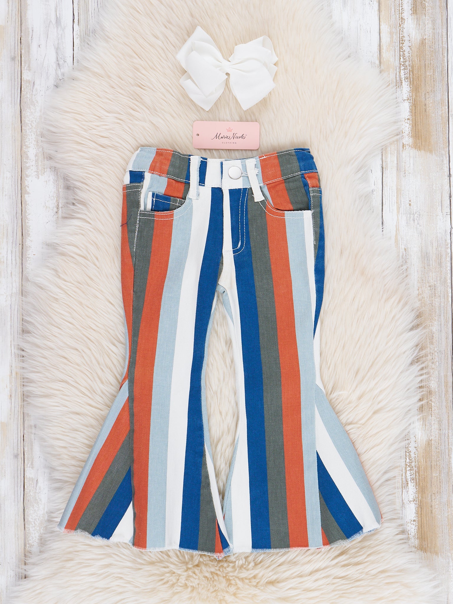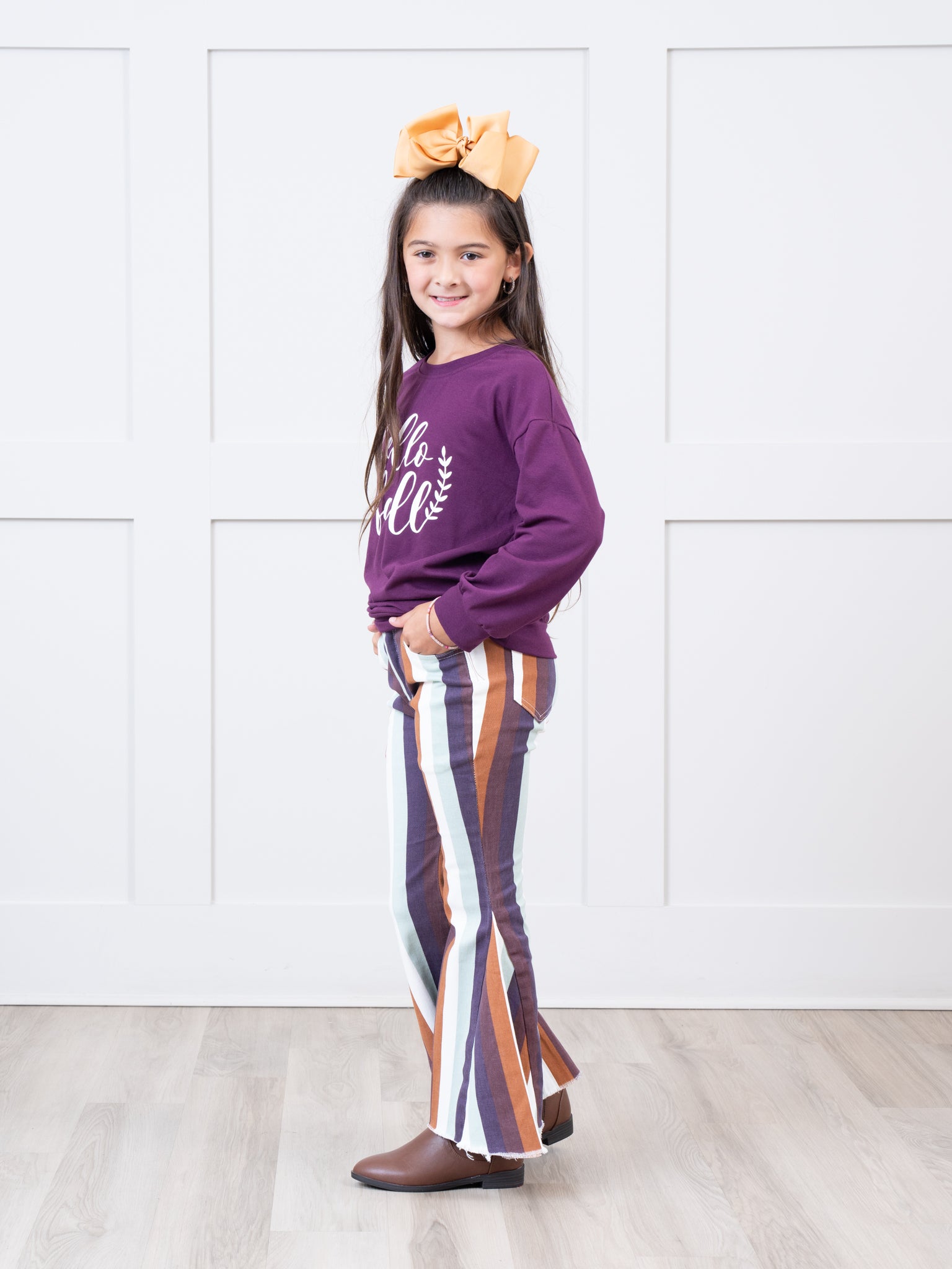 The perfect denim bell bottoms for your little one! These denim bell bottoms feature your choice of fall stripes. Pair one or all three with a white shirt for the perfect look!