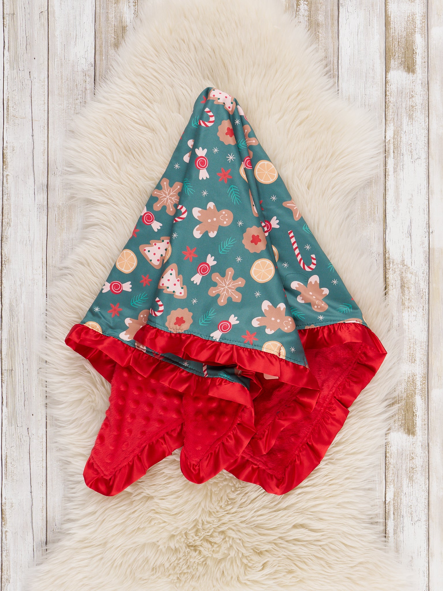 The holidays are a time of sweet dreams and sweet treats. The Holiday Sweet Dreams Ruffle Minky Blanket brings your little one just that! The red ruffles give a festive charm, and the soft material gives all the comfort. With cookies, gingerbreads, and candies all over, this blanket by Marie Nicole Clothing is an adorable pick for the winter season.