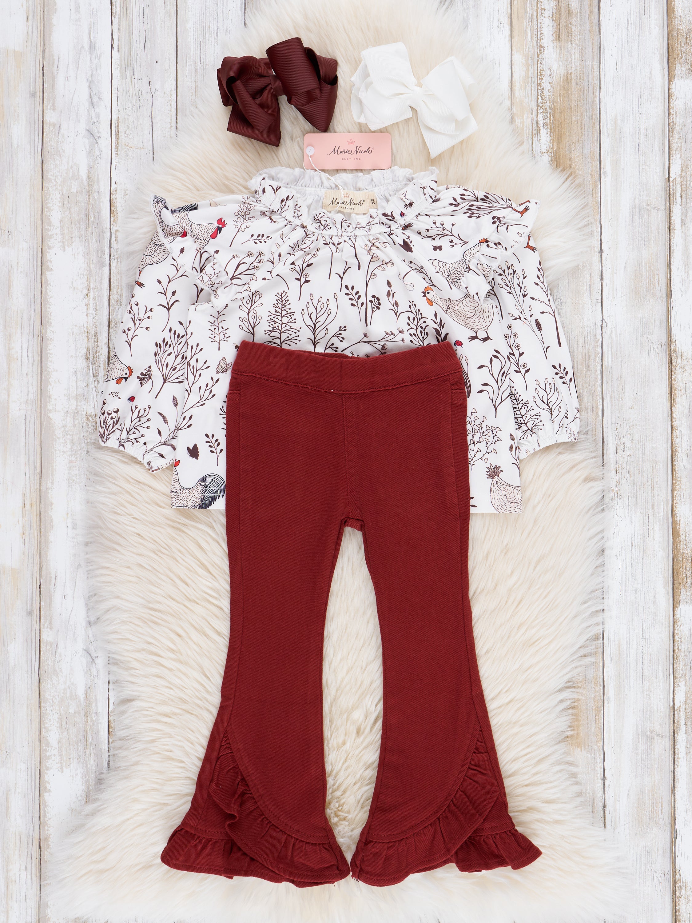 This Maroon Rooster Ruffle Outfit is perfect for your little fashionista! The rooster print adds a playful touch to the ruffle top, while the maroon bell bottoms give off a fall vibe. Your girl will be the trendiest chick on the block.