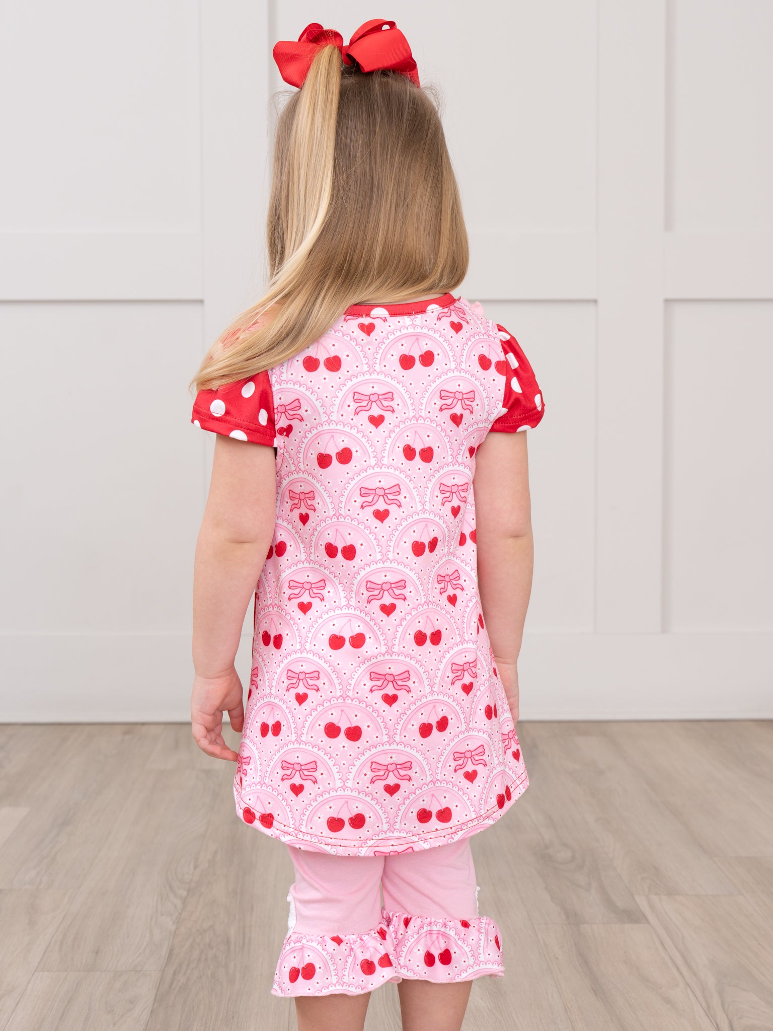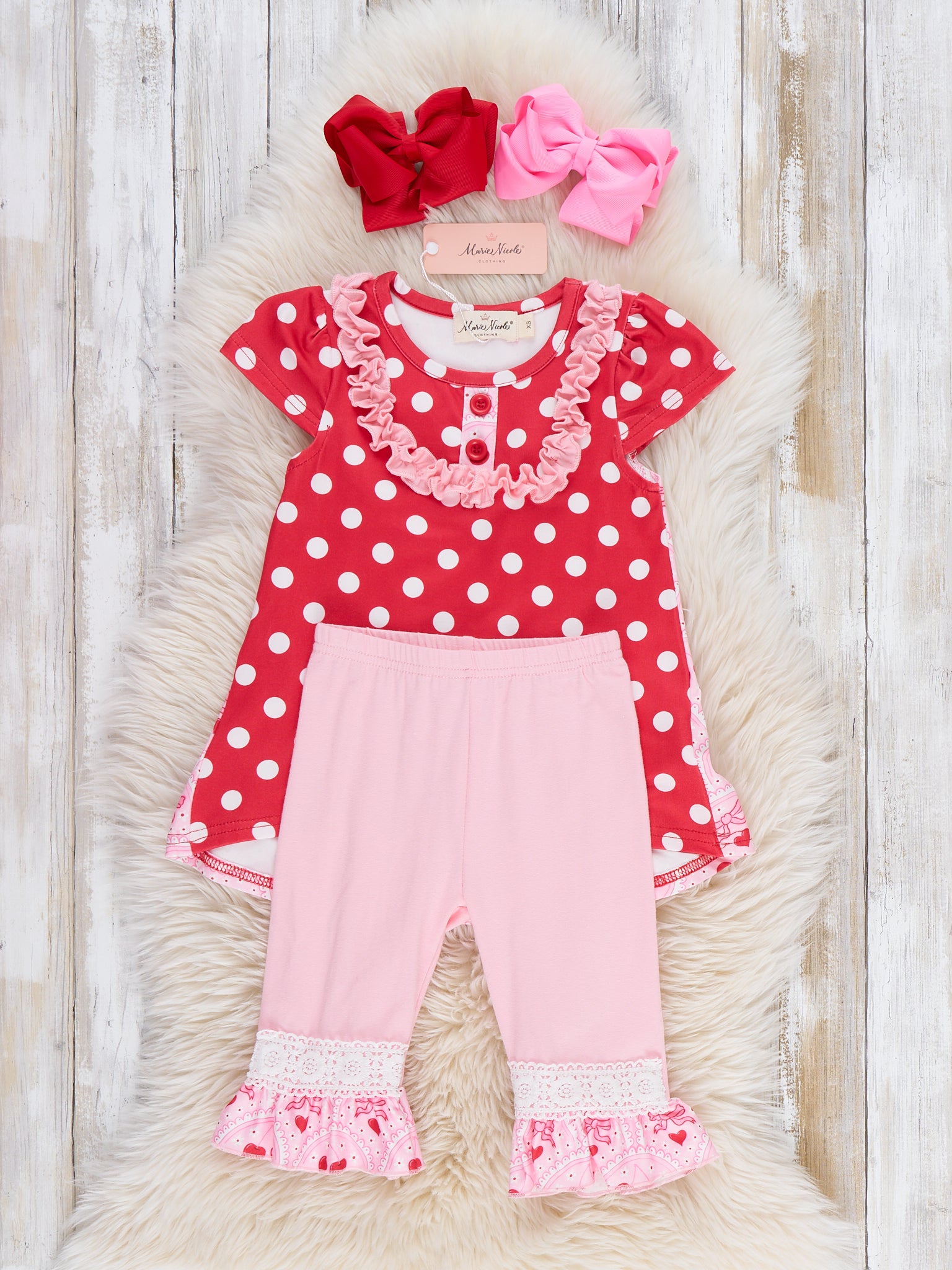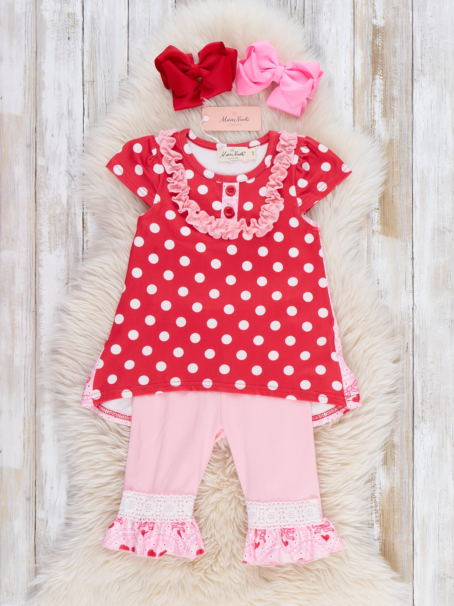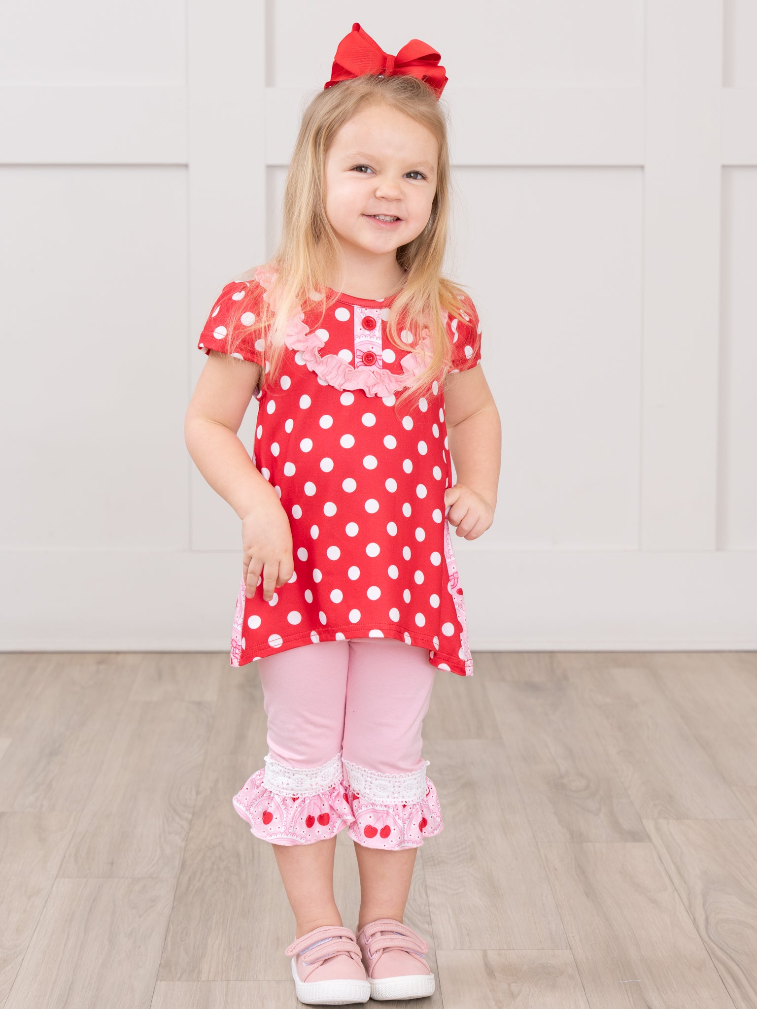 The Polka Dot Cherries Hi-Low Top Outfit by Marie Nicole Clothing combines polka dot print with cherry accents, ruffled collar, and a high-low hemline for playful charm. Matching calf-length pants with lace trim add extra bounce for active play, while soft stretchy fabric ensures all-day comfort. Perfect for family outings, photos, or festive moments full of boutique whimsy.